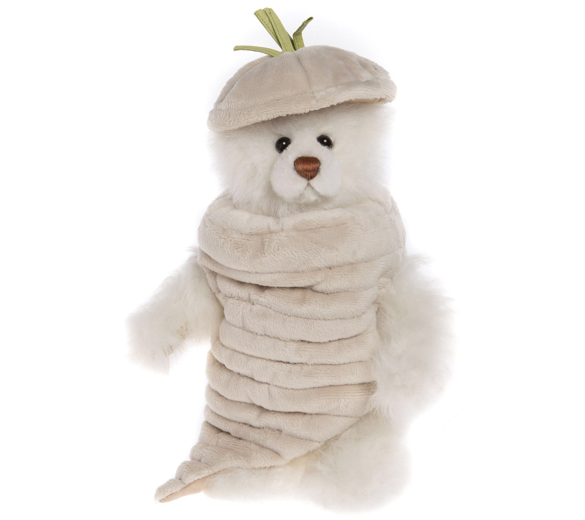 Your little one will smile when they see the adorable design of this cuddly plush bear dressed up in a whimsical parsnip costume. From Charlie Bears.