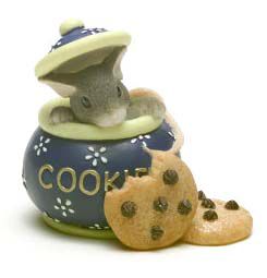 Who stole the cookie from the cookie jar? This figurine from the Charming Tails Collection features Mackenzie Mouse peeking out of a cookie jar; probably looking for the partially eaten cookie that he dropped. A second cookie rests "uneaten" along side the cookie jar. Includes a recipe for chocolate chip cookies from the kitchen of Mrs. Ida Griff, the mother of designer Dean Griff. Measures approximately 3"H. Made in China.