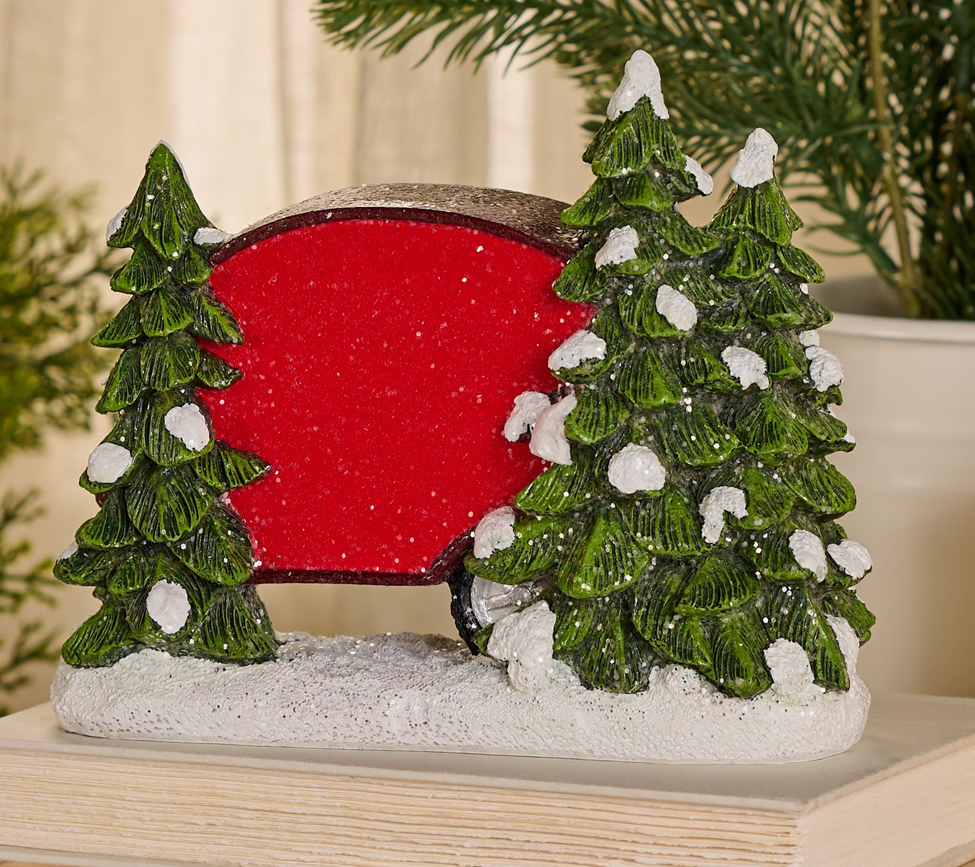 Holiday scenes get a playful twist when this brightly trimmed camper finds its spot among your festive decor. The cheerful wreath on the door, snowy pine trees, and glittered finish invite joyful memories of winter getaways -- just right for coffee tables or bookshelves that need a little seasonal sparkle. From the Valerie Parr Hill Collection.