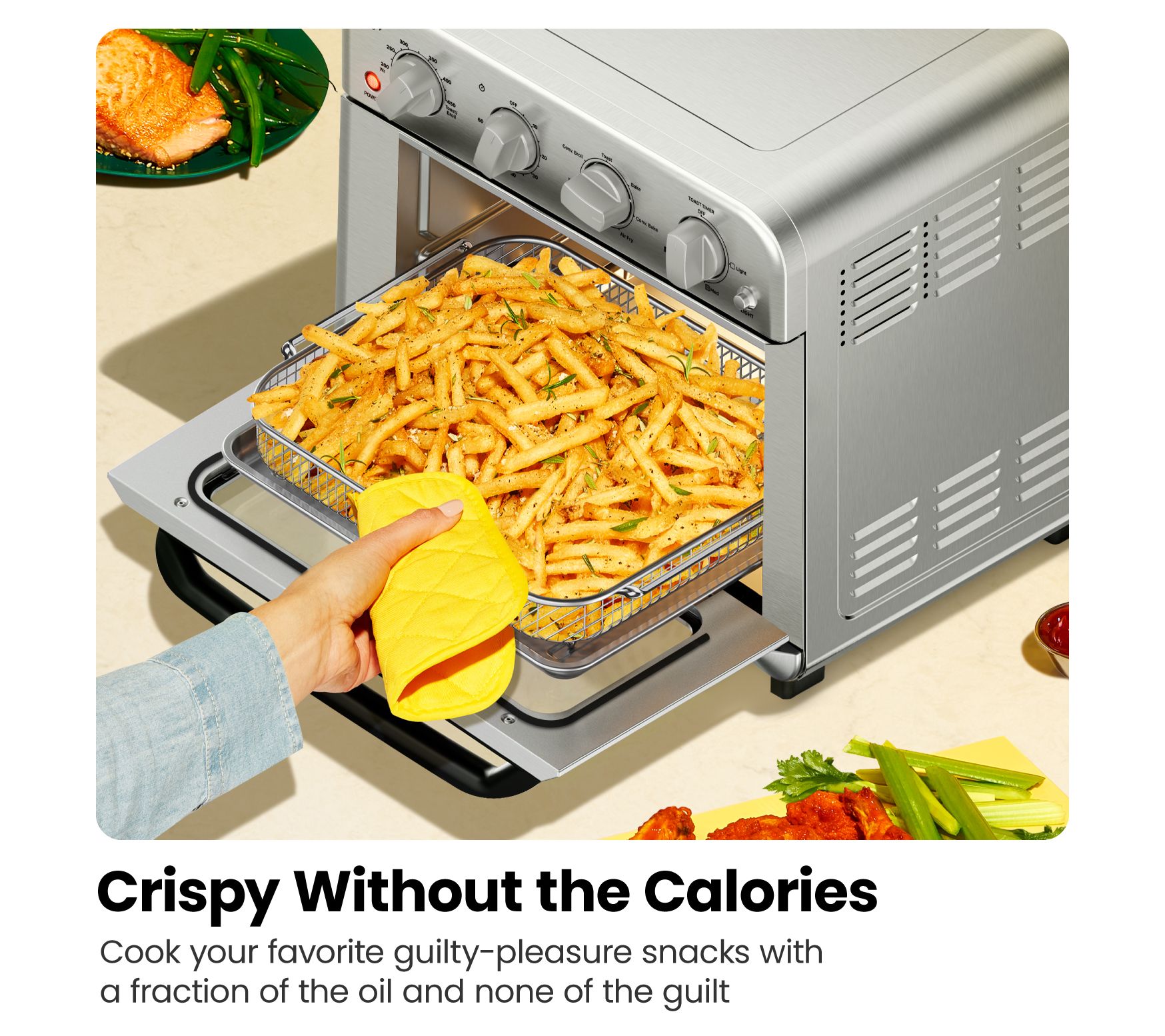 • Includes 19-qt oven/air Fryer, air fry basket, wire rack, broil/bake pan, and pull-out crumb tray