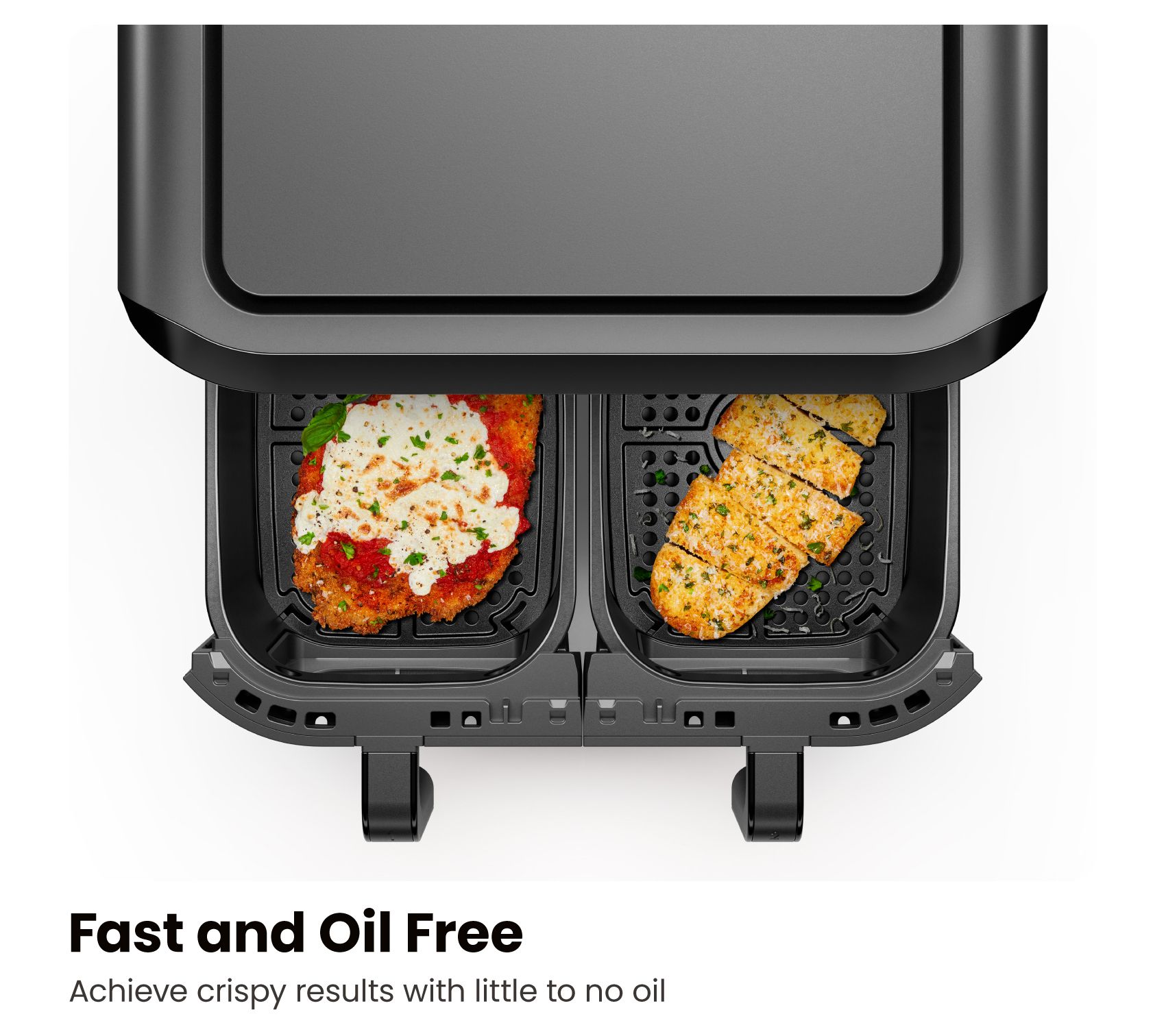 • Dual 3-qt baskets allow cooking two foods at once