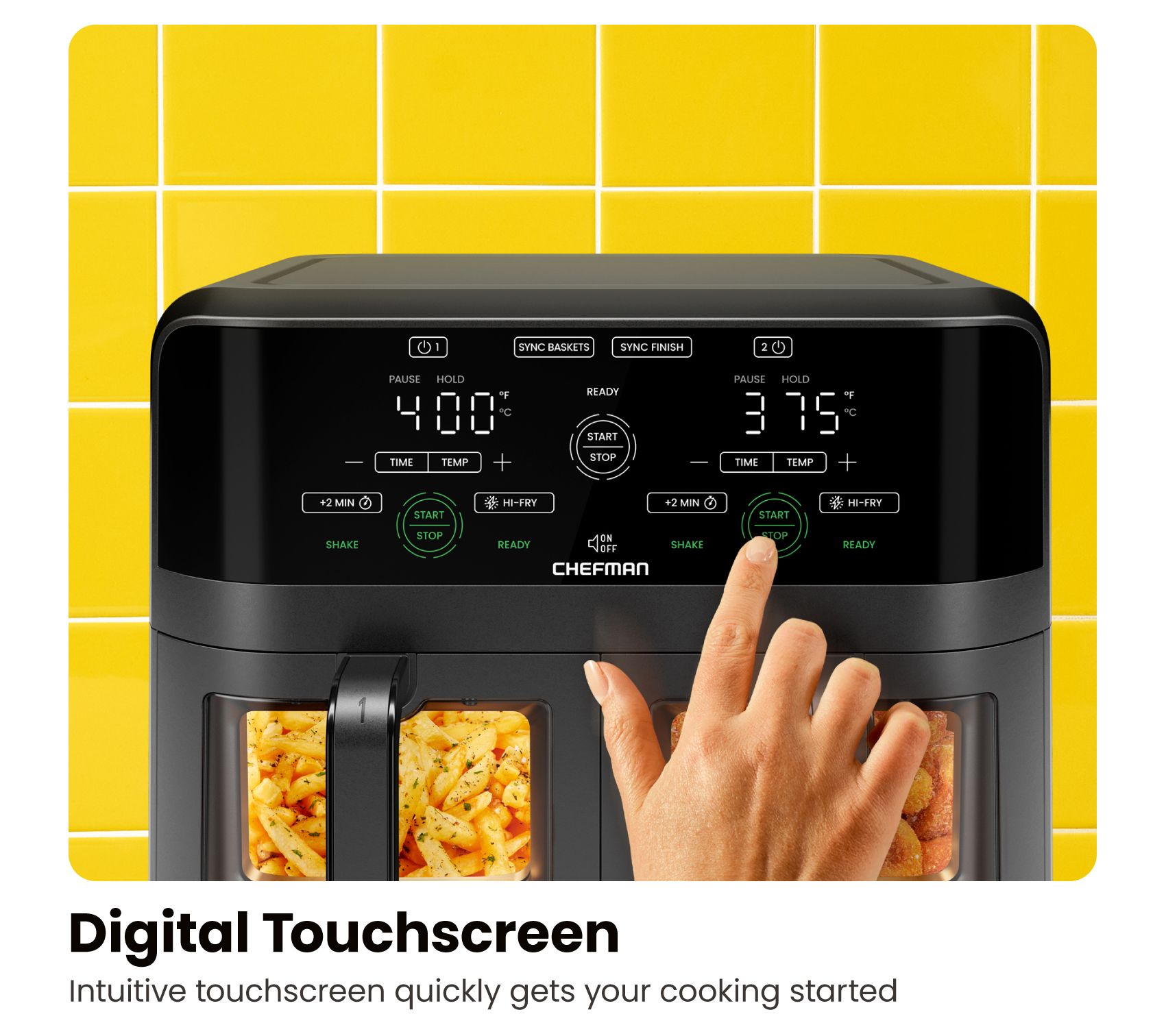 Elevate your kitchen game with the Chefman TurboFry Touch Dual Window 6-Qt Air Fryer, a revolutionary appliance that lets you cook two different dishes simultaneously without sacrificing flavor or texture. With its sync-finish feature, your meals will be ready together, making dinner preparation a breeze. Plus, the unique hi-fry button ensures an extra-crispy finish every time. From Chefman.