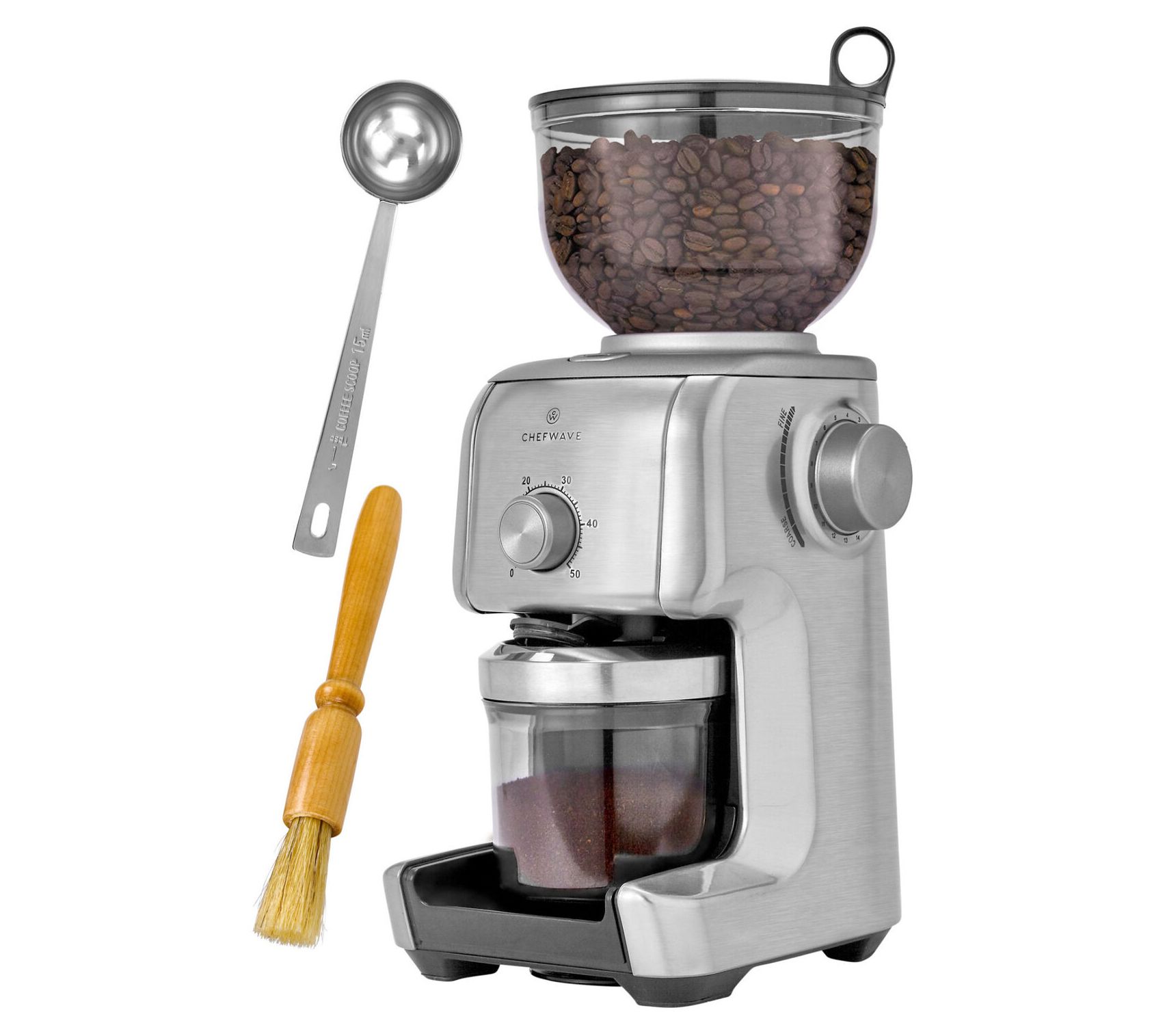 • Includes grinder, 14-oz bean container, 5-oz bean container, metal scoop, and wooden brush