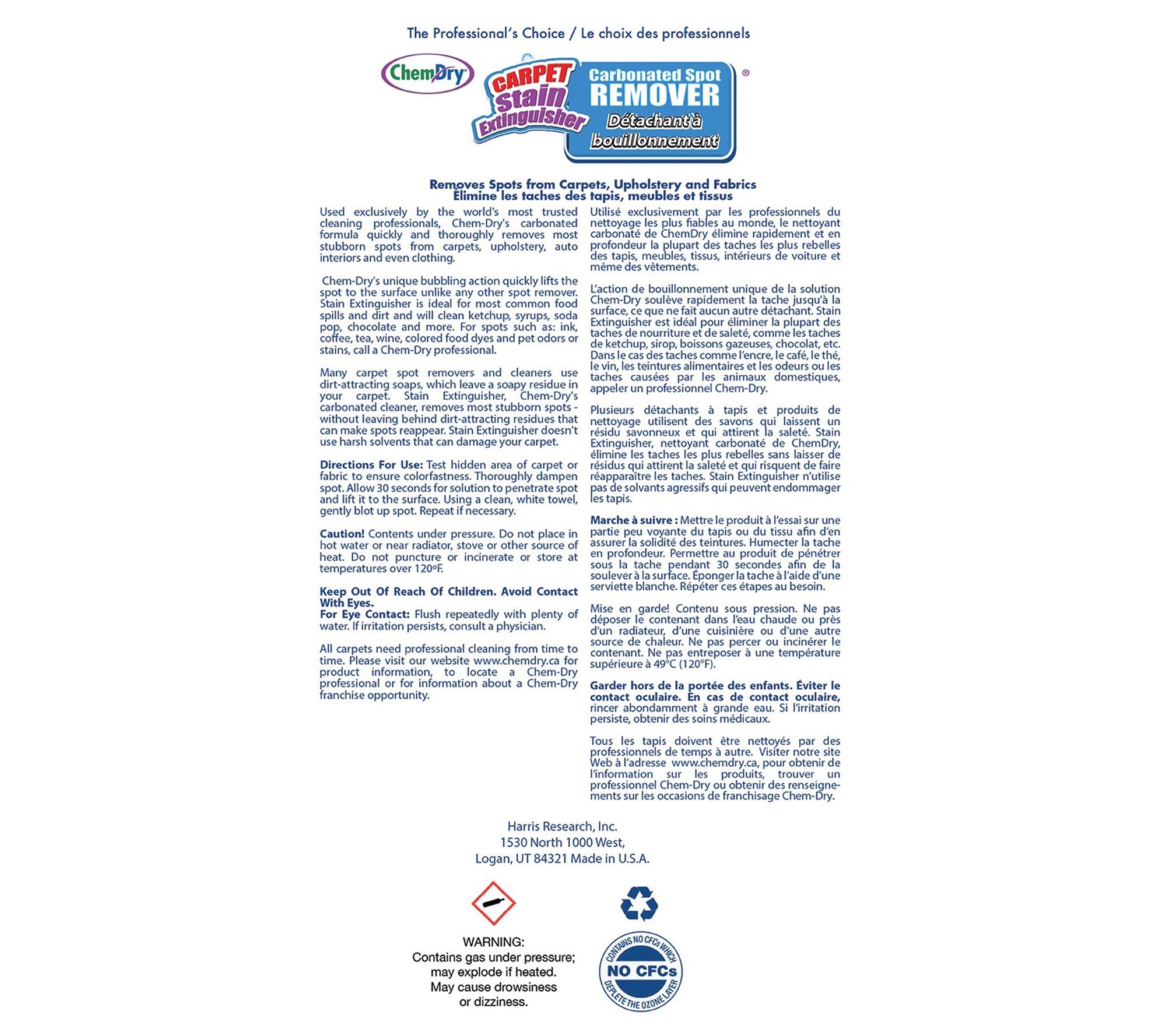 Stubborn spots: meet your match. Chem-Dry Carpet Stain Extinguisher tackles the toughest tasks on your carpets, upholstery, auto interiors and even clothing, leaving your fabrics with a fresh fragrance.