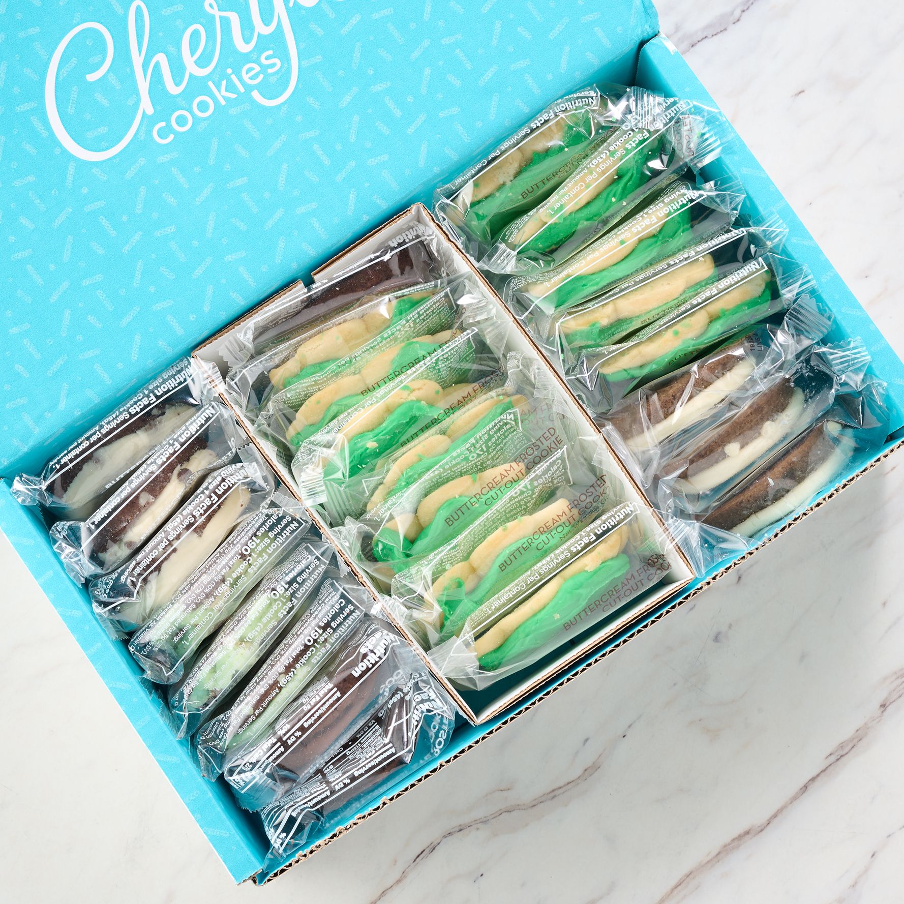 1st shipment: 12 frosted shamrock, three Irish creme coffee, three buttercream-frosted mint chocolate, three triple chocolate, three frosted chocolate chip cookies