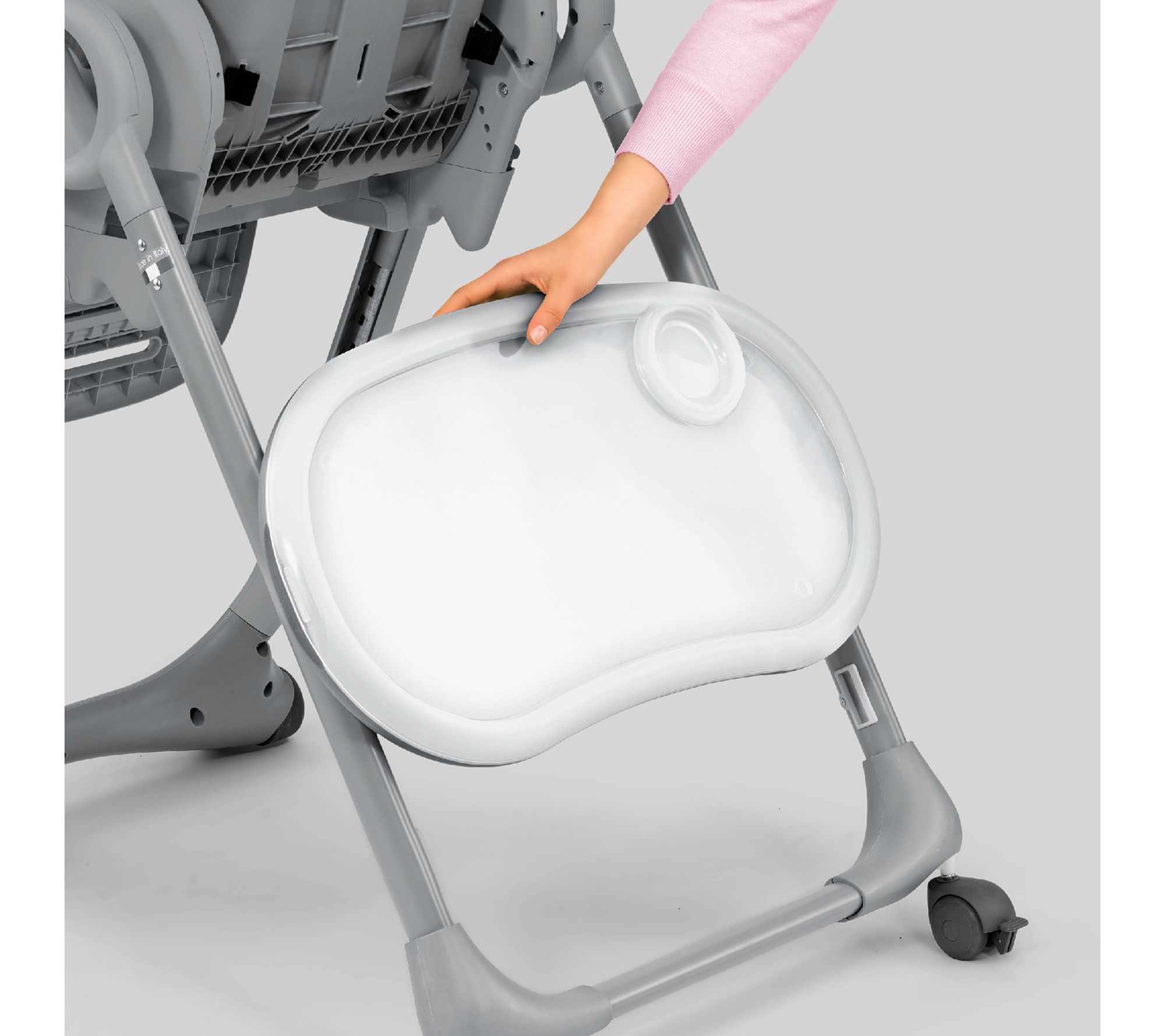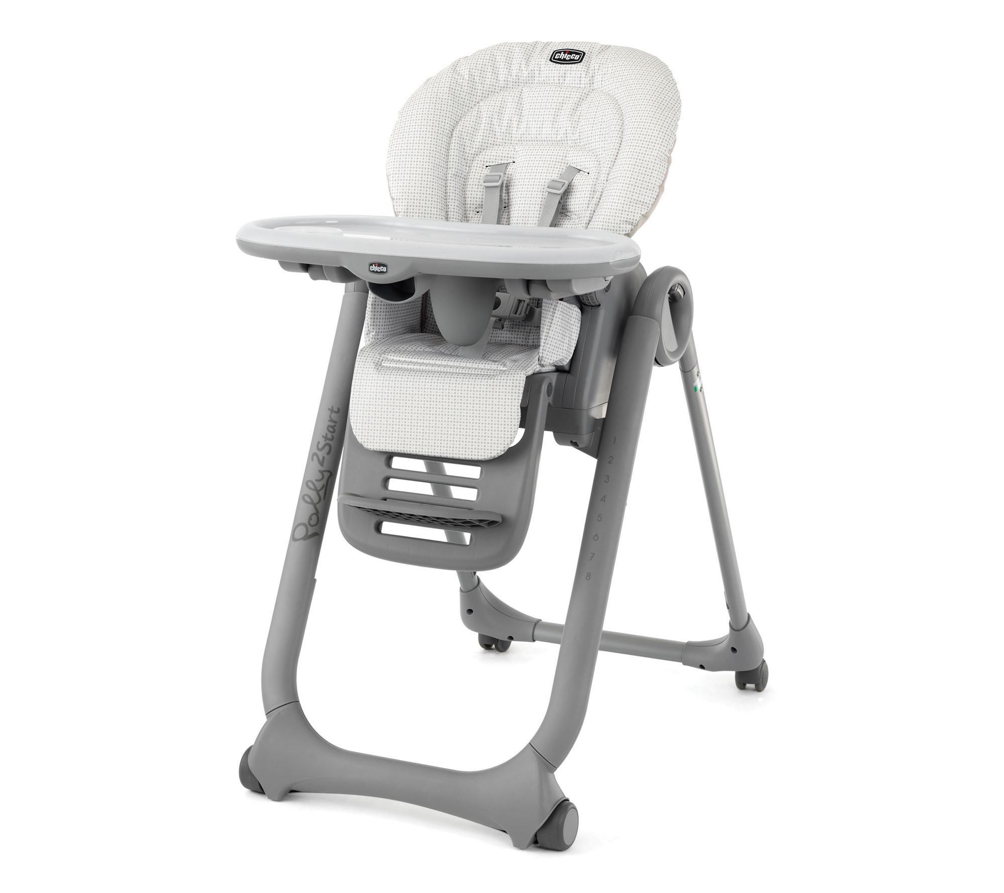The Chicco Polly2Start high chair is designed to grow with your child from newborn to toddler. With a reclining backrest for bottle feedings and adjustable height for mealtime at the table, this high chair offers convenience and comfort. The removable tray liner and soft, wipeable seat pad make cleanup a breeze. From Chicco.
