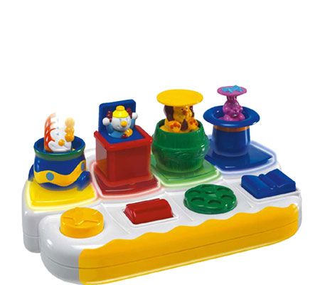 It's circus time--bring on the fun with the Chicco Pop Up Circus! Just press each of the four large colored buttons, and enjoy the pop-up surprise of fascinating characters, accompanied by happy sounds and flashing lights. When all four characters appear at the same time, the show continues by playing one of six original circus melodies. Aids in the development of audio and visual skills. Includes 3 AA batteries.