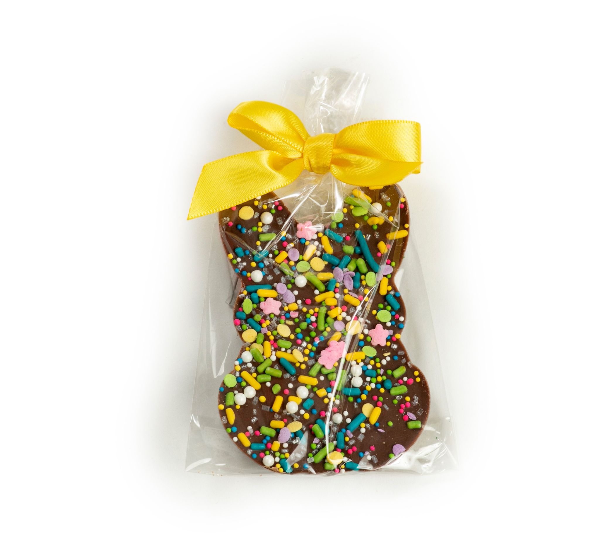 Ready to wish you a "hoppy" Easter, Belgian chocolate bunny bark makes a sweet addition to your holiday celebrations. From Chocolate Works.
