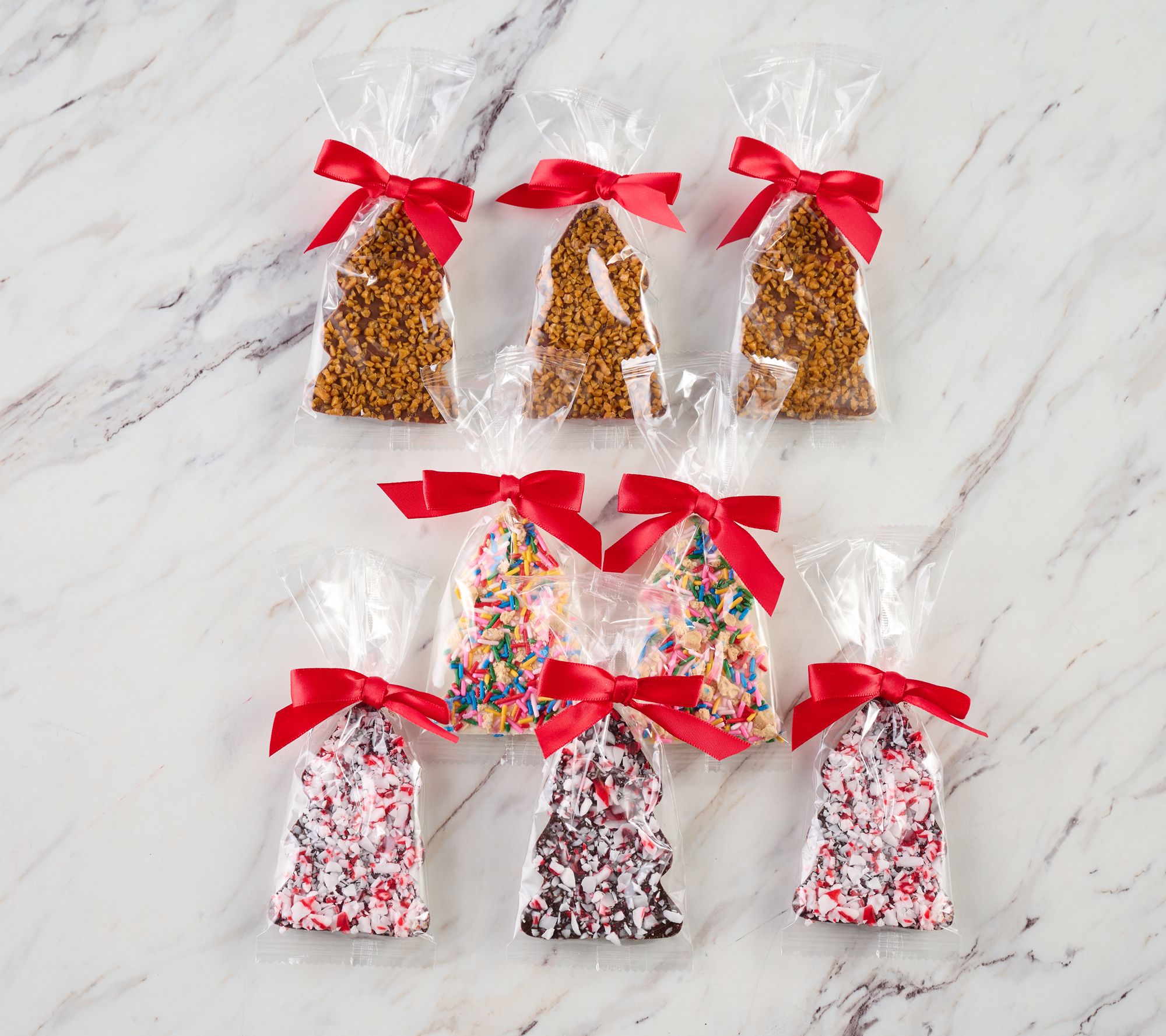 • Includes eight 3-1/2" x 2" chocolate bark bars: three milk chocolate with salted caramel crunch, two white chocolate with sugar cookie crumbles and sprinkles, three dark chocolate with crushed peppermint