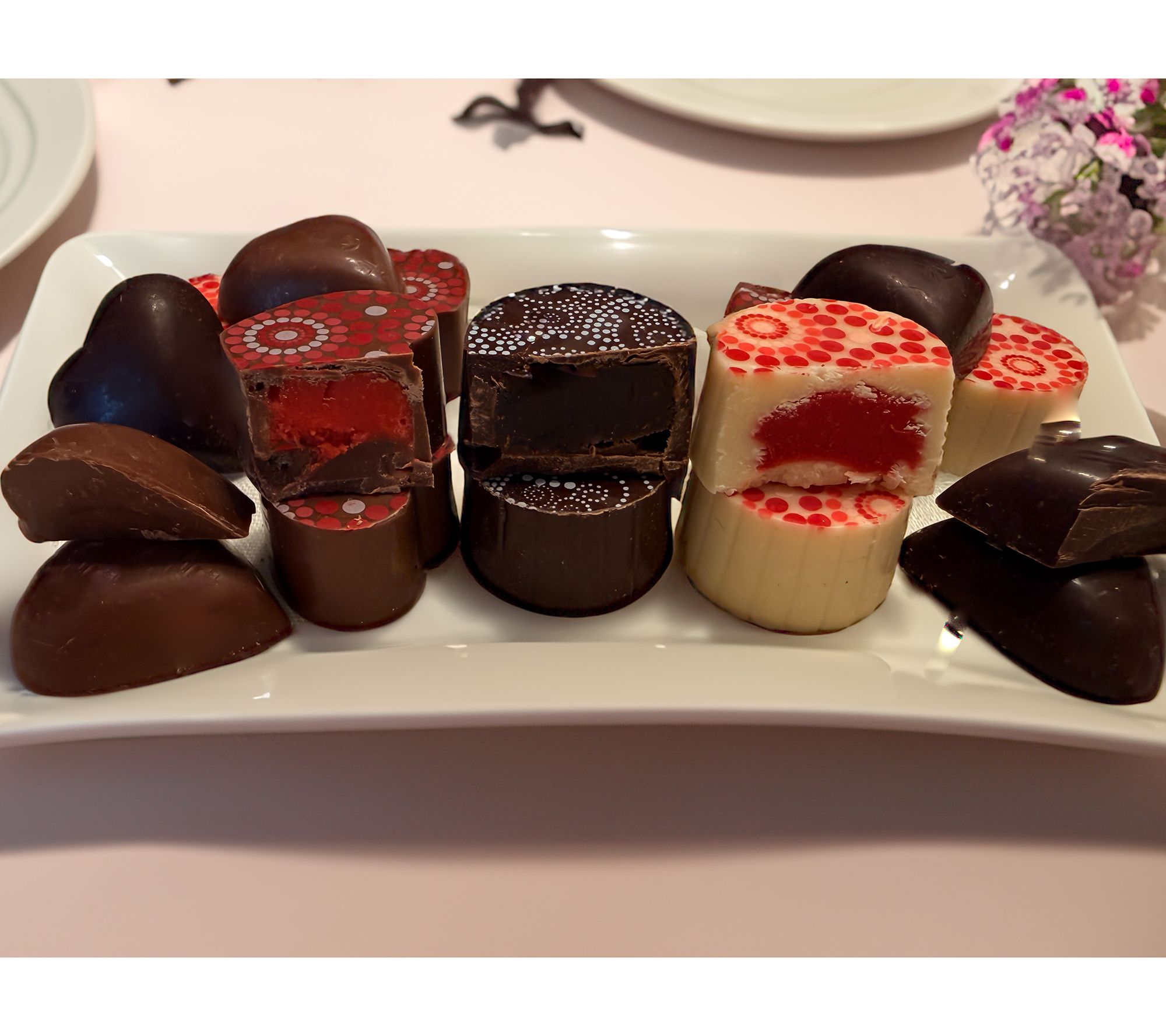 • Includes two heart-shaped gift boxes, each with nine Belgian chocolates: two red velvet ganache-filled milk chocolate truffles, two red velvet ganache-filled white chocolate truffles, one champagne ganache-filled dark chocolate truffle, two foiled solid dark chocolate hearts, and two foiled solid milk chocolate hearts