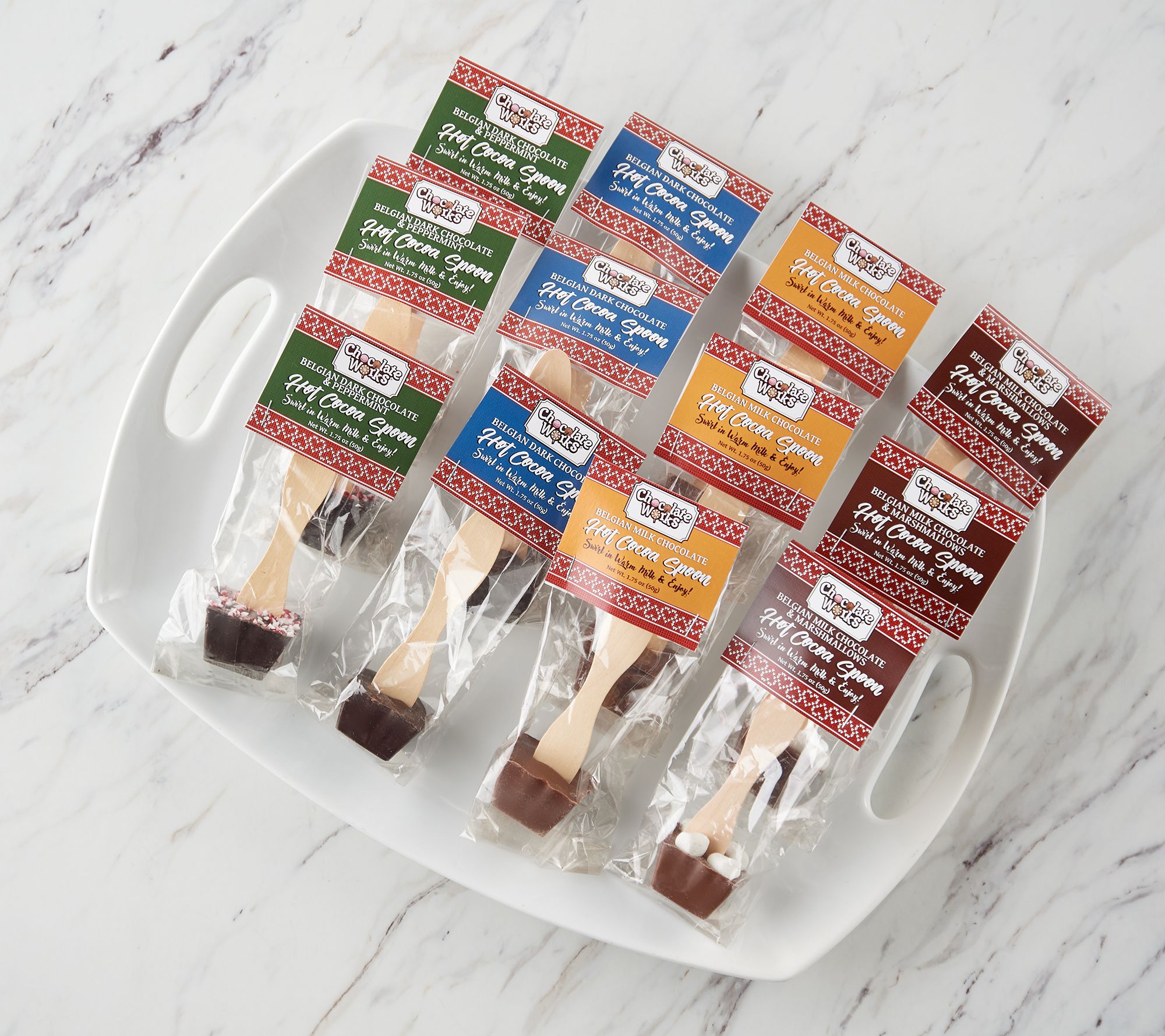• Includes 12 Belgian chocolate hot cocoa spoons; three each of dark chocolate with peppermint, milk chocolate with marshmallows, milk chocolate, and dark chocolate