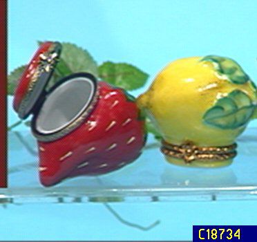 Limoges boxes are a French tradition that dates back to the 18th century. Choice of: Mini Lemon- yellow lemon with 3 green leaves or Mini Watermelon- green watermelon lies on the side. Slice has been removed & you can see the inside of the fruit. Clasp is a fly. Hand mounted metalhinge & fitting made of brass. Fitting has to be individually shaped & precisely fitted because no two are alike. Made of porcelain. Goes through 3 stages of firing before getting handpainted & detailed. Comes with Certificate. Handsigned by artist before final firing. (France)