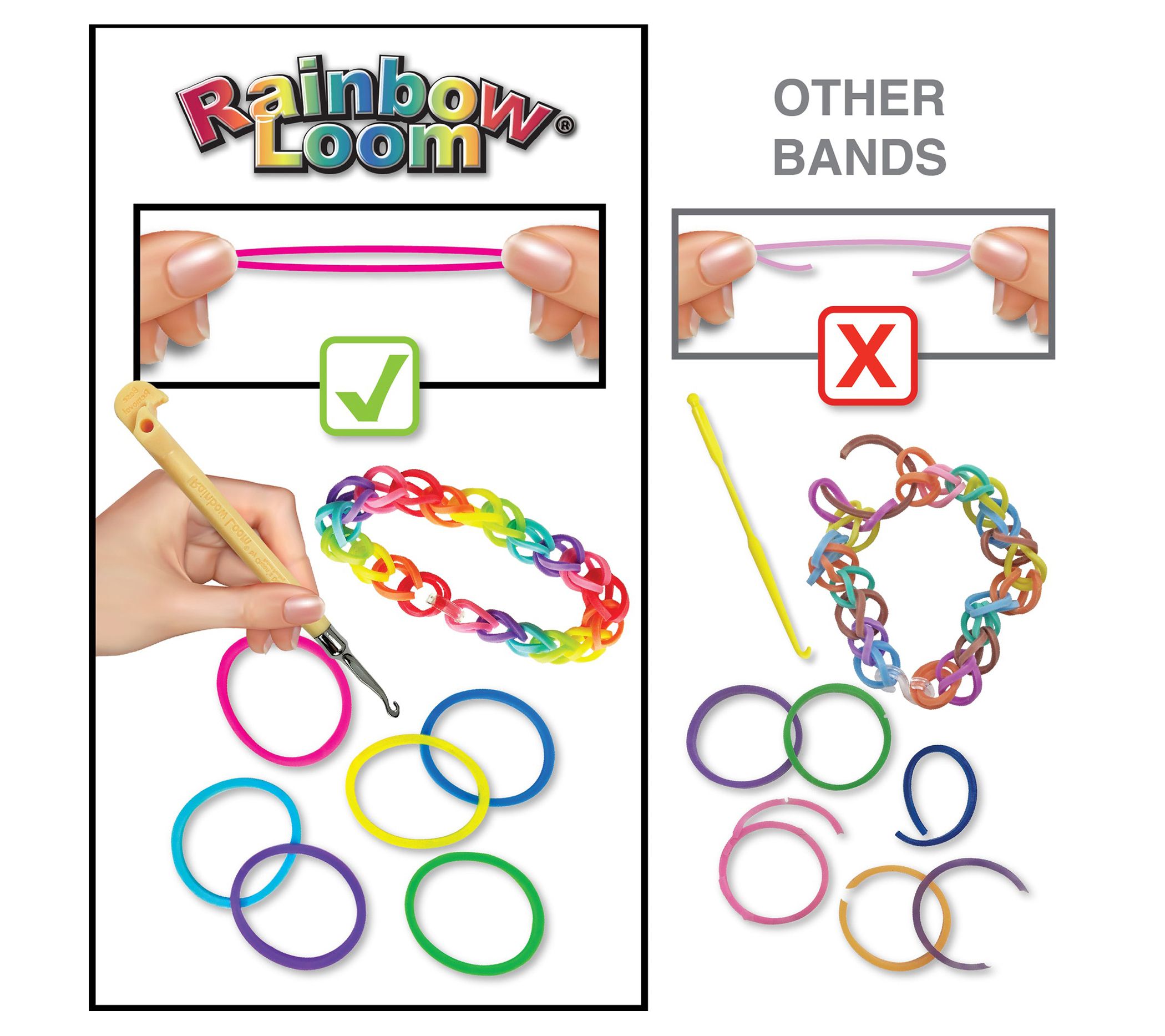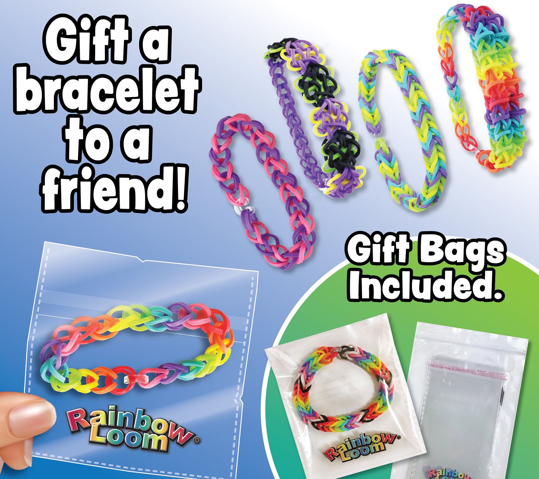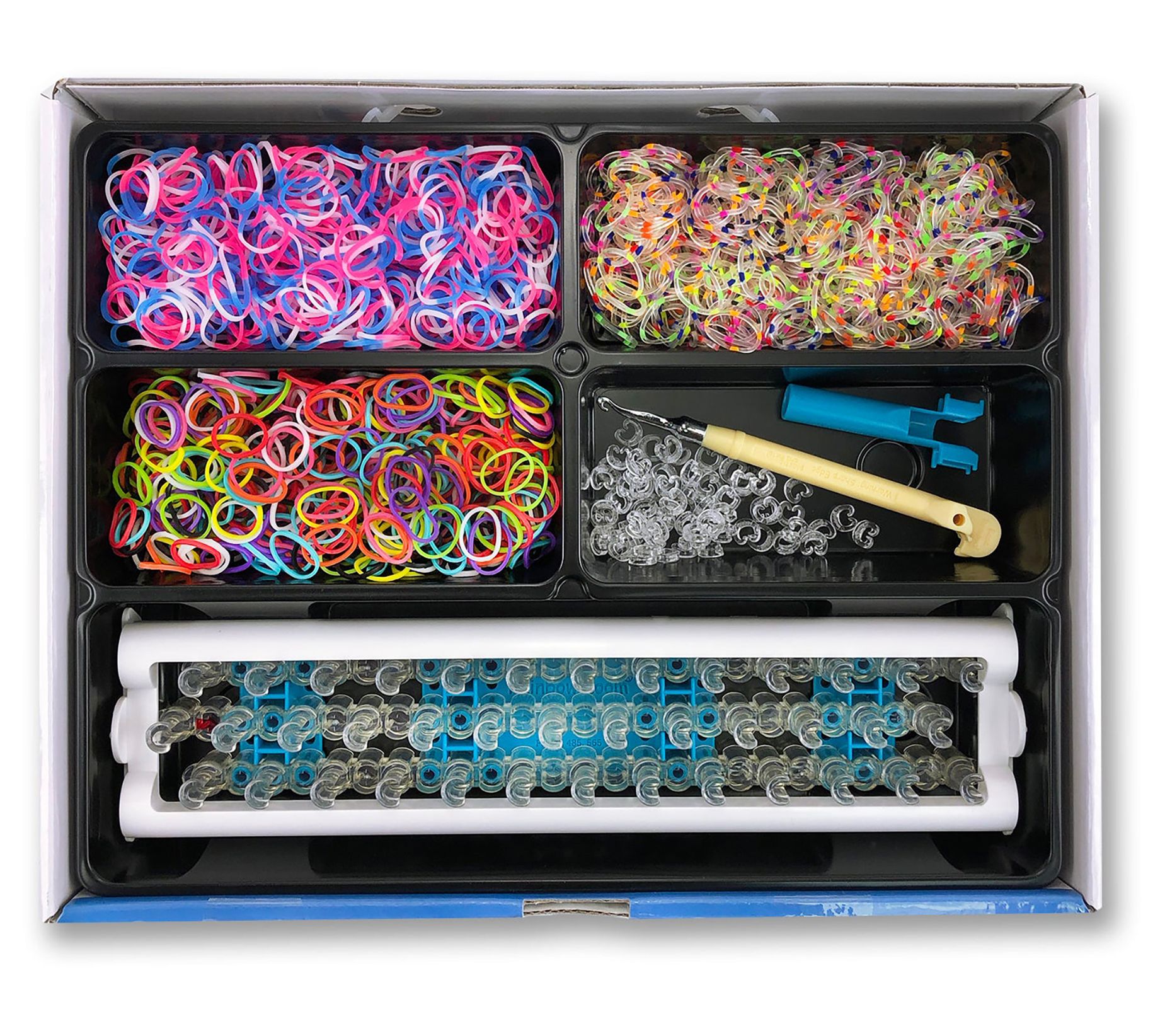 • Includes box with five lidded storage compartments, 1,800 assorted rubber bands, metal hook, 75 c-clips, 12 gift bags, display rack, rainbow loom, mini loom, and eight design instruction sheets