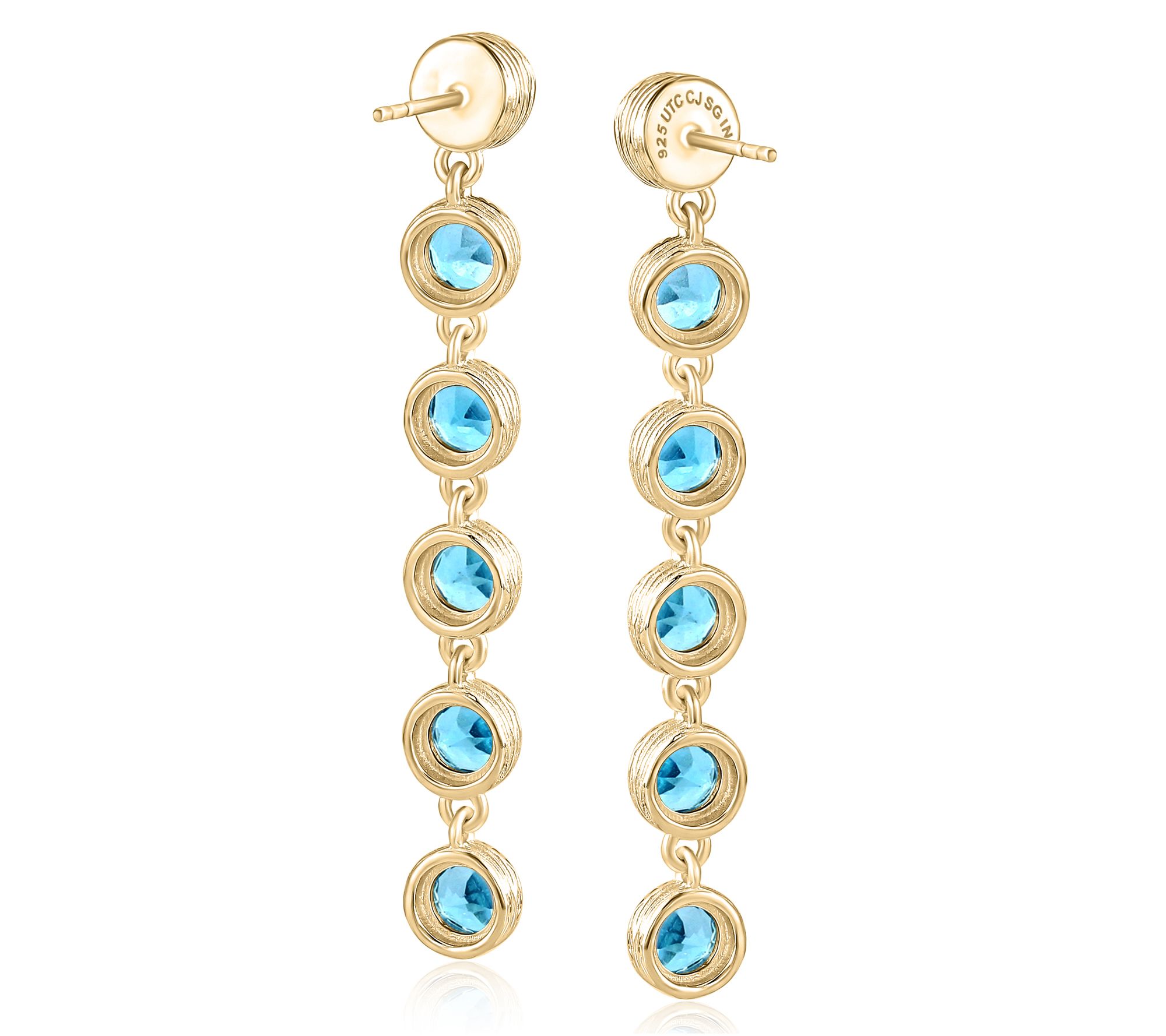 Bezel-set, round gemstones at post and dangle; ripple texture; polished finish