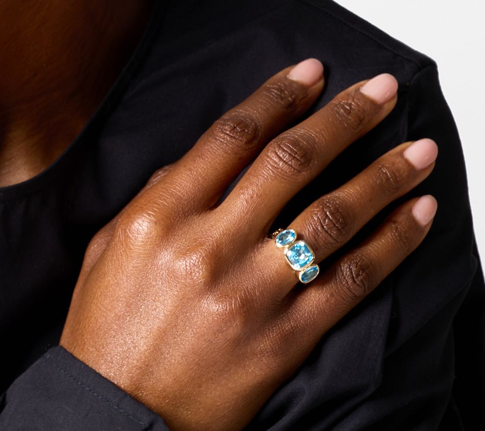 From the Christian James by Scott Grimes Ripple Collection, this stunning band ring offers a splash of color and brilliance. Featuring a bezel-set cushion-cut gemstone in the center flanked by bezel-set oval gemstones, this piece is sure to dazzle. The ripple design on each side of the band adds a unique touch. From Christian James by Scott Grimes.