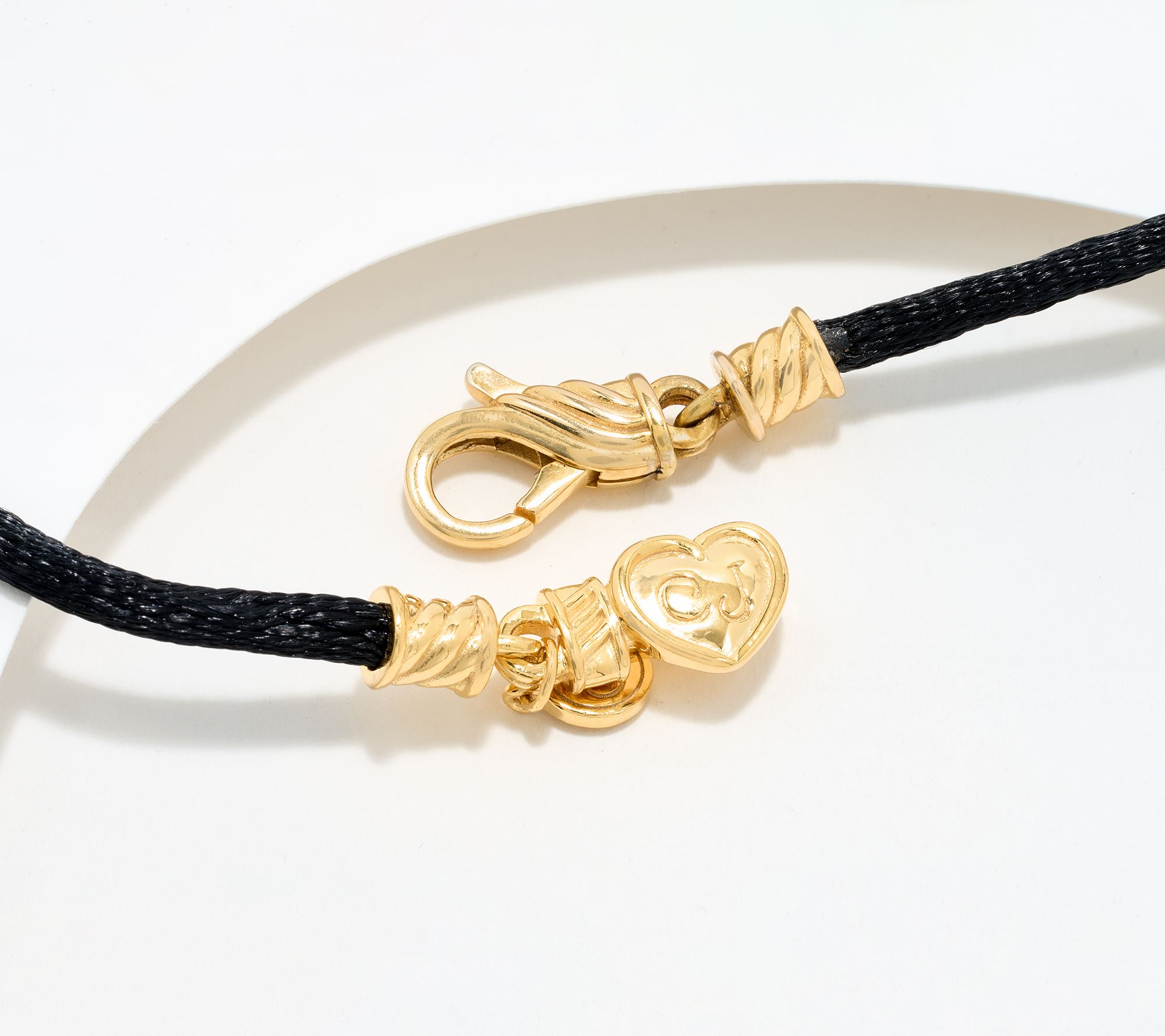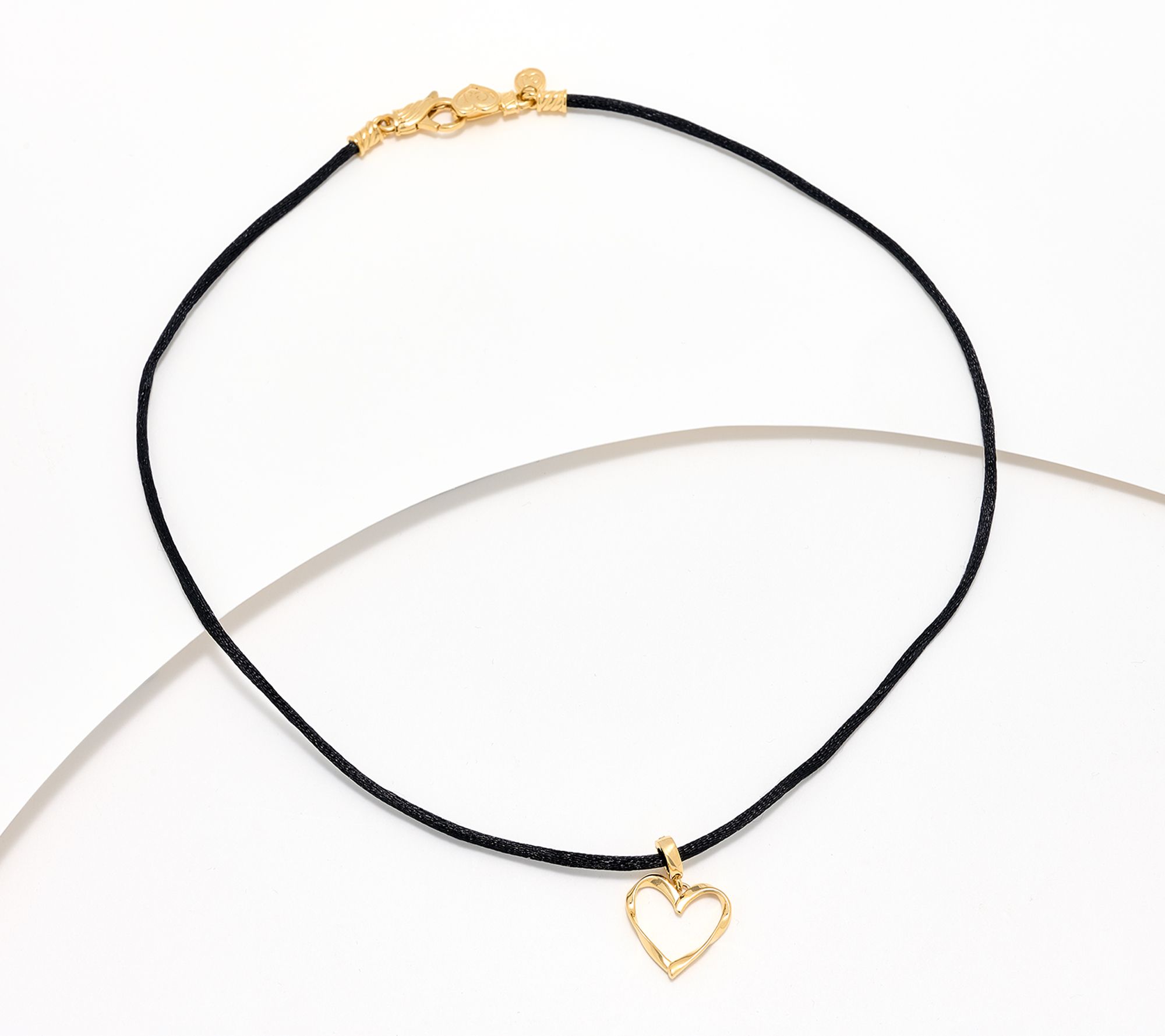 Wear your heart close to yours with this enchanting necklace, perfect for adding a touch of romance to any outfit. The open heart-shaped pendant, crafted from 14K yellow gold-clad sterling silver, dangles beautifully from a sturdy black nylon cord. From Christian James by Scott Grimes.