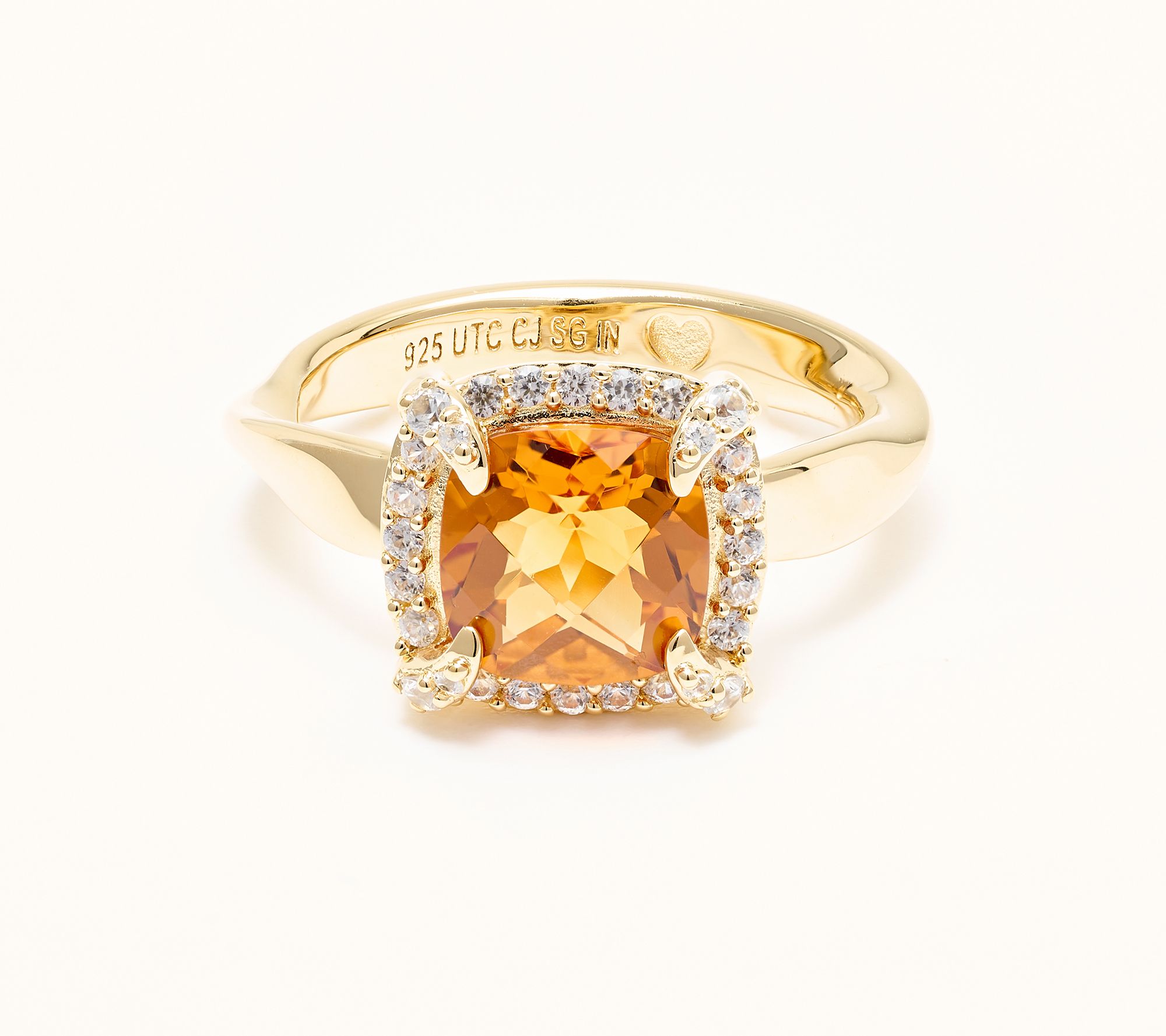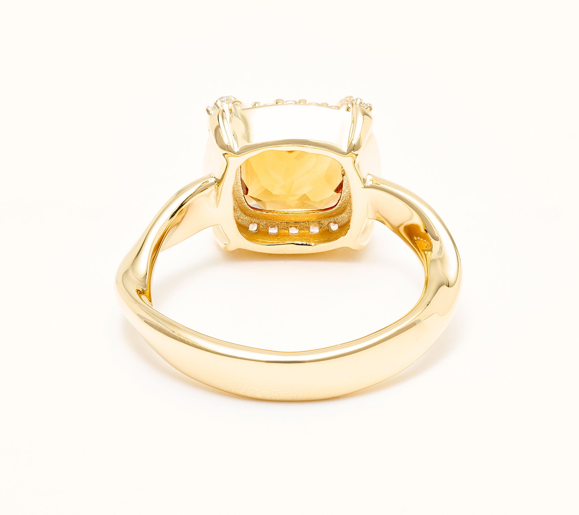 Cushion-cut, prong-set gemstone; halo design of round white zircon accents; ripple-textured shank; polished finish