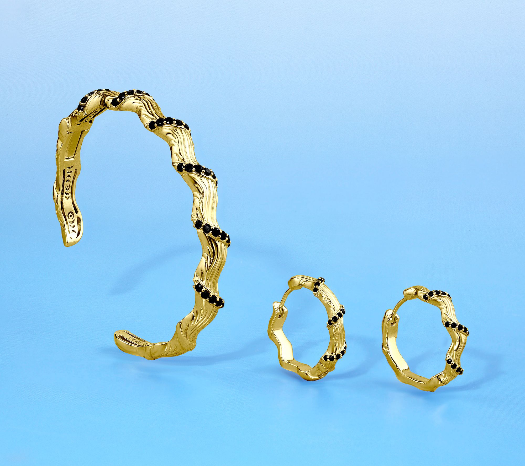 Prong-set, round gemstones; textured hoops