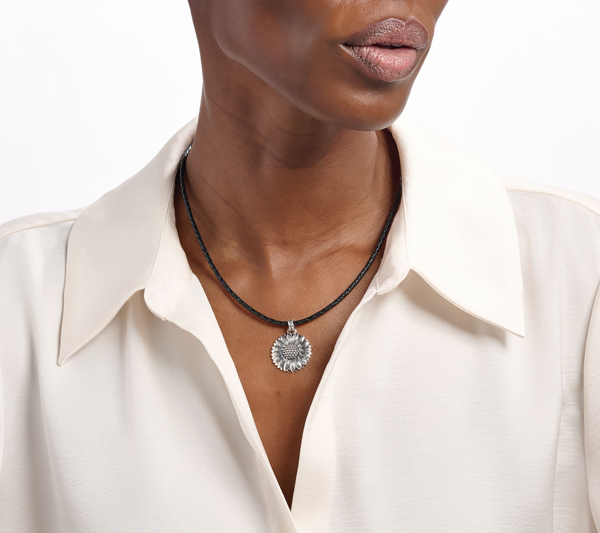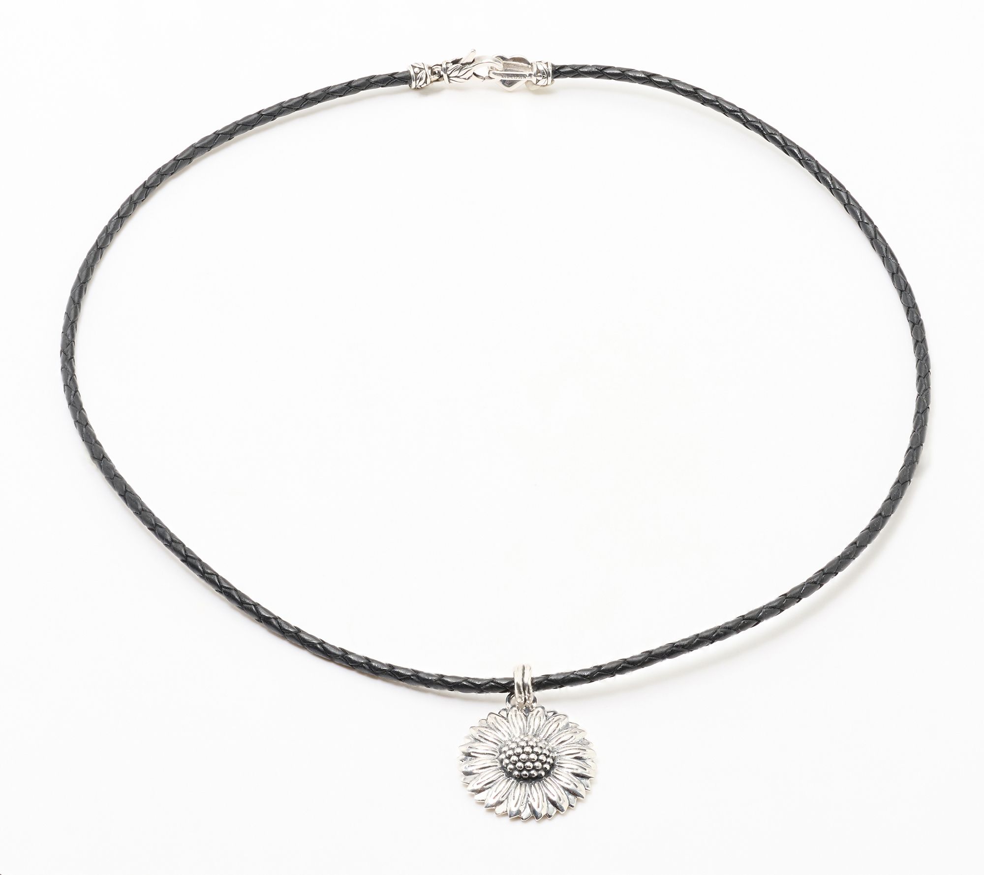 Calling all sunflowers! Make this richly detailed sunflower necklace -- with its dimensional botanical and braided leather -- your signature accessory. Lightly oxidized details offset the high polish, while the decorative lobster claw clasp features the collection's signature heart connector. From Christian James by Scott Grimes.