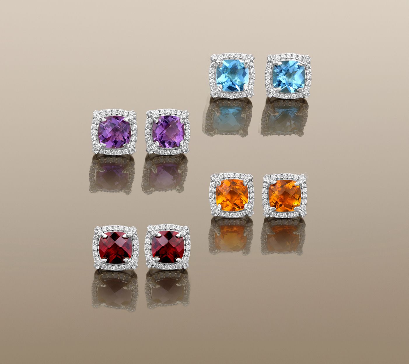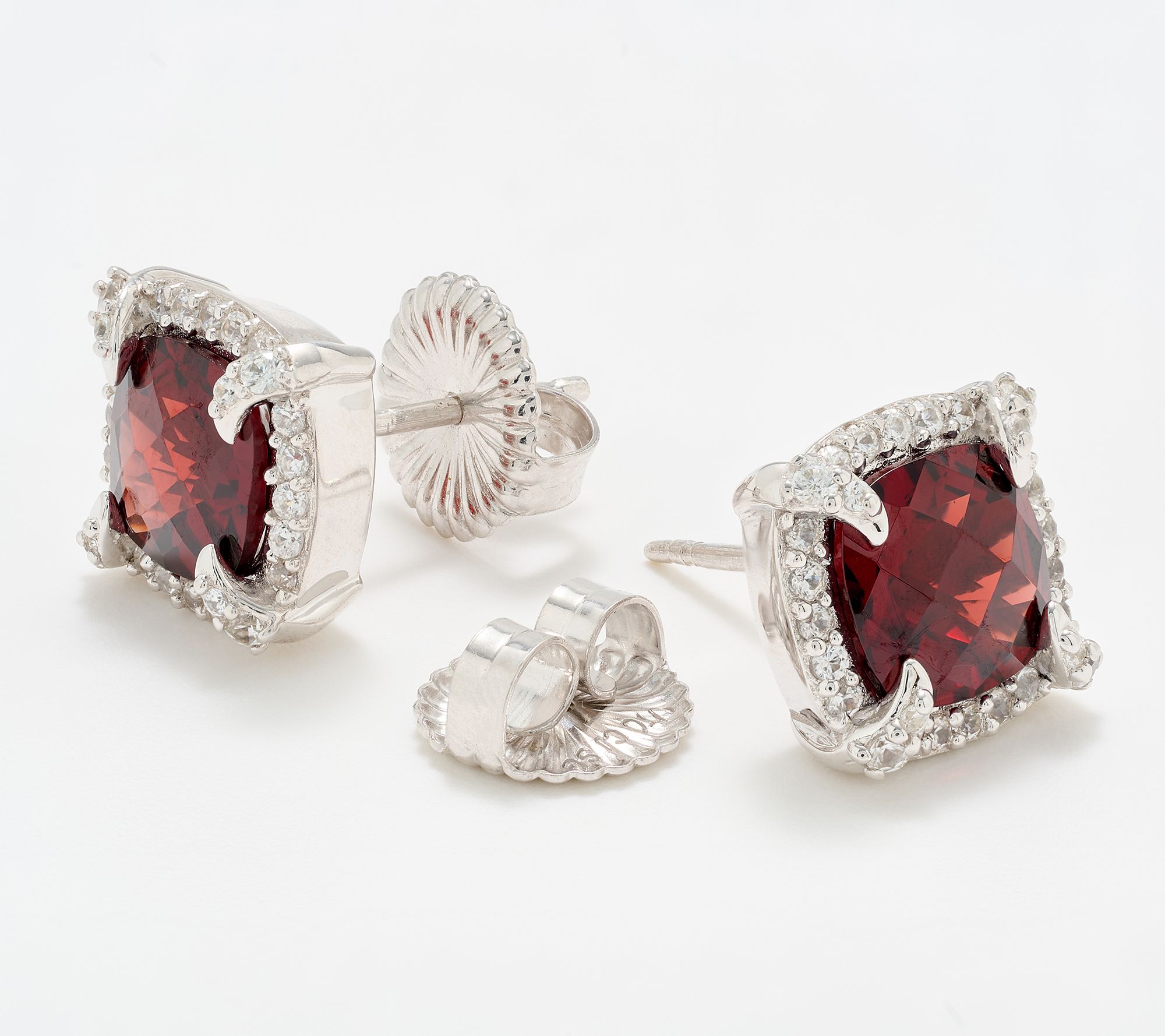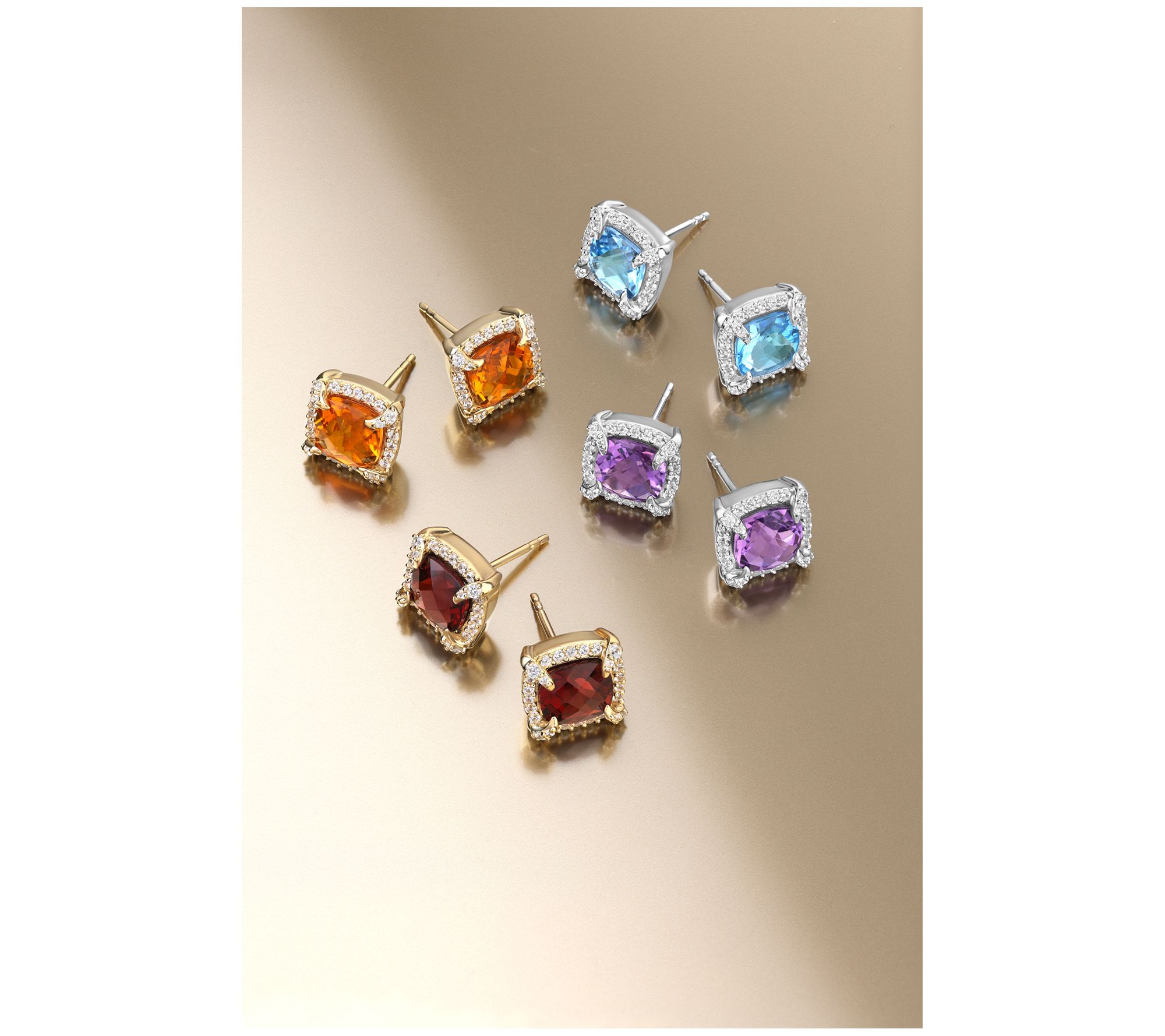Stud design; prong-set, 8mm cushion-cut gemstone center with white zircon accents; high-polish finish