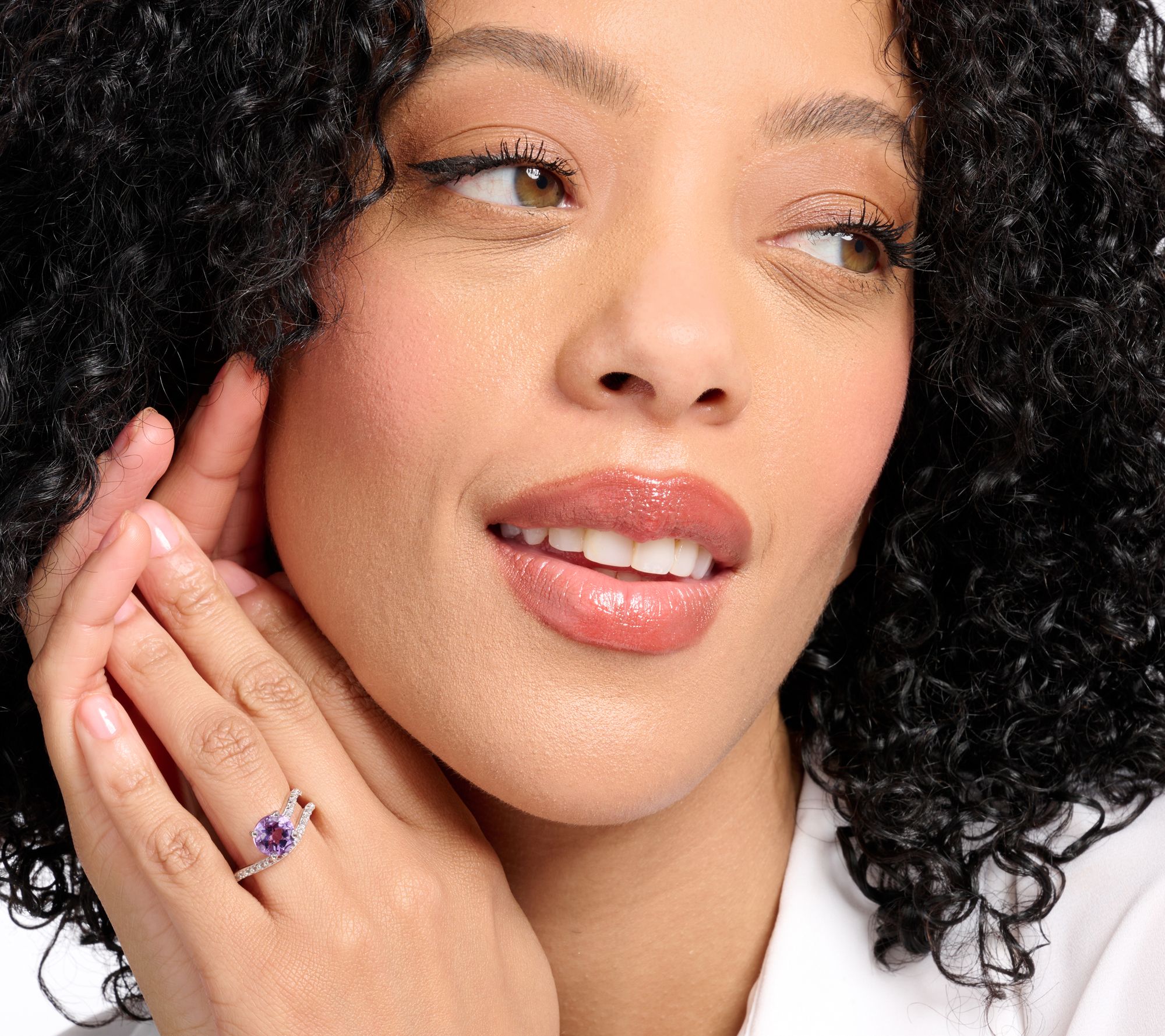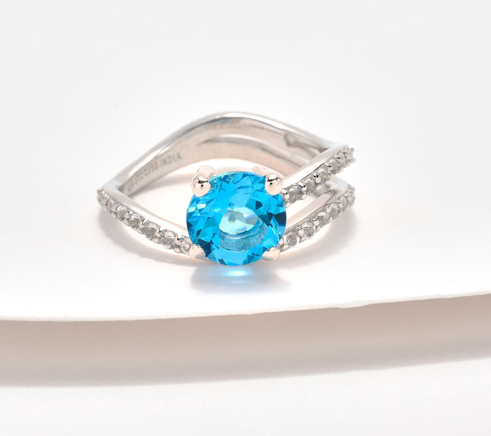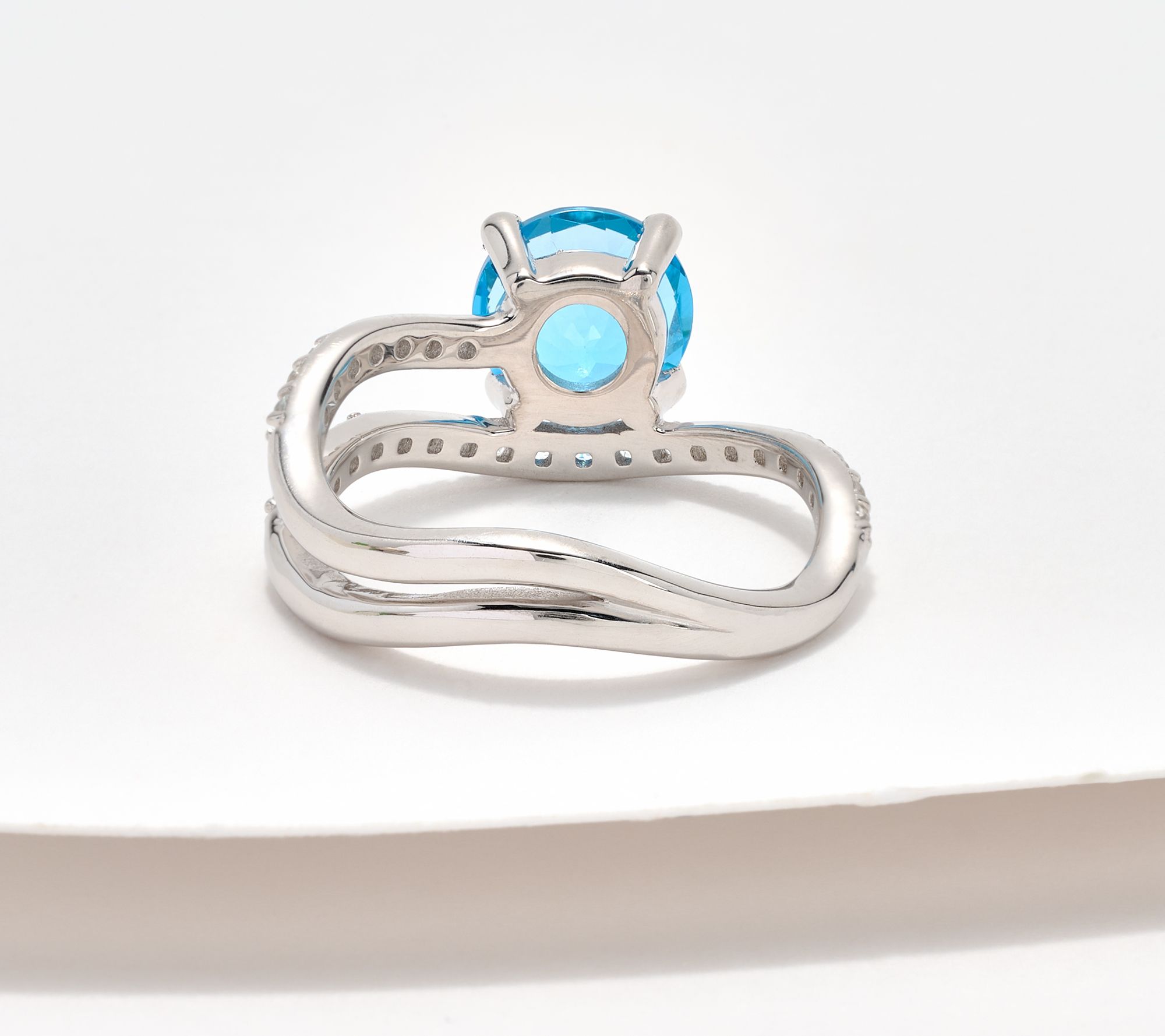 Prong-set, round gemstone; wavy single band on one side and double band on the other; prong-set, white topaz gemstones; polished finish