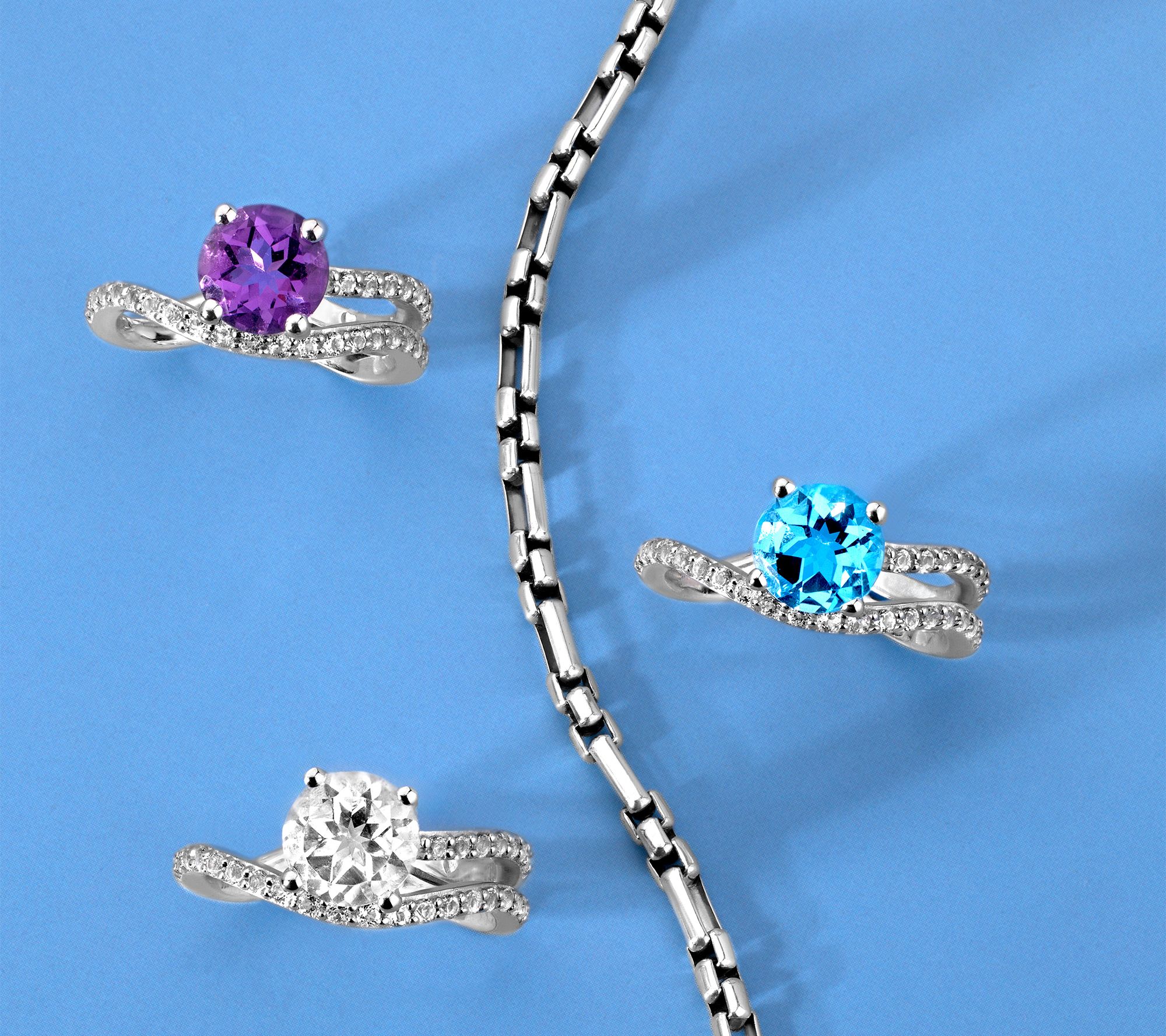 Total gemstone weights are approximate: Amethyst 1.85 carats; Blue Topaz 2.30 carats; Citrine 1.90 carats; Garnet 2.55 carats; White Topaz 2.45 carats