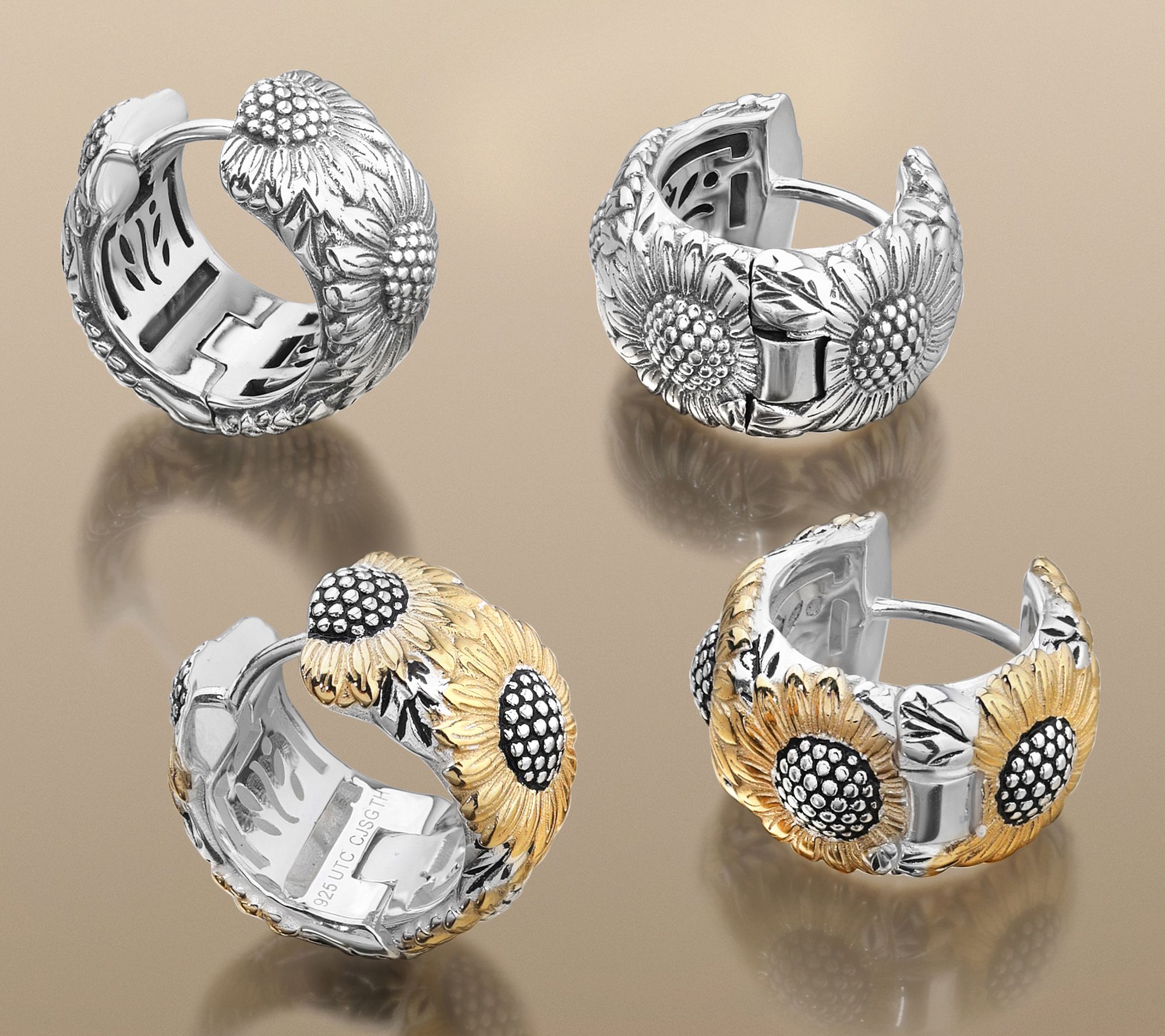 • Huggie hoop style; multi sunflower design; lightly oxidized finish
