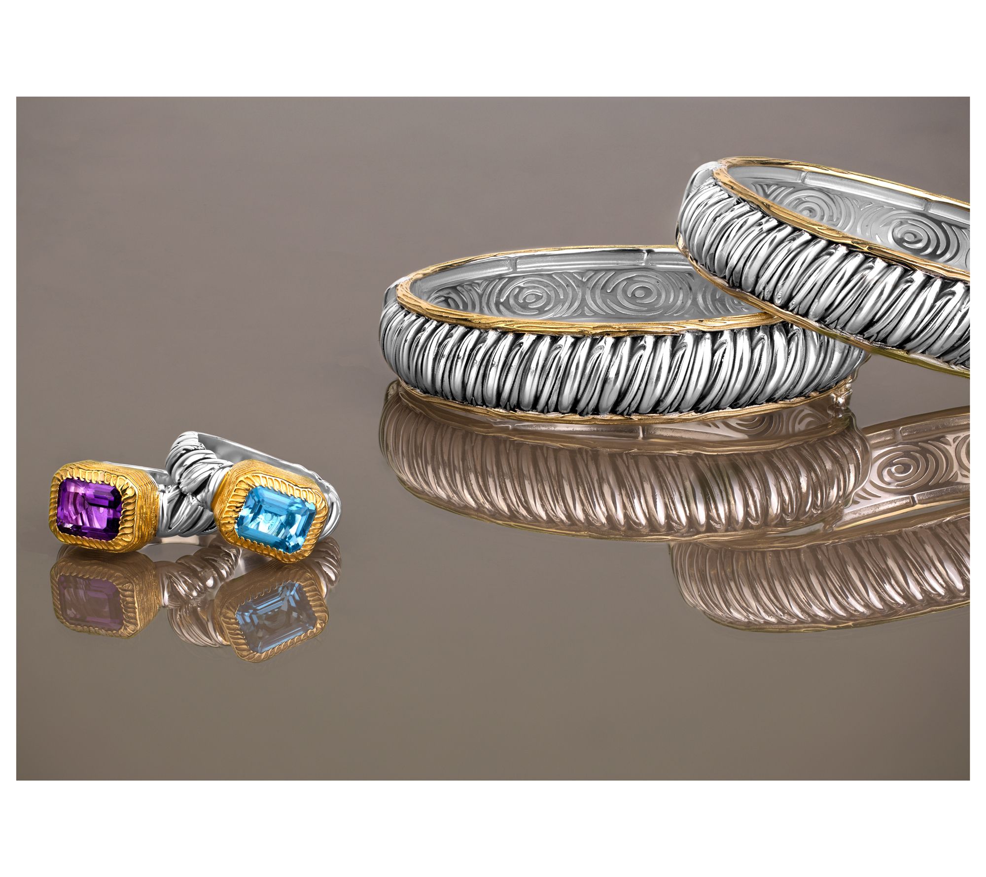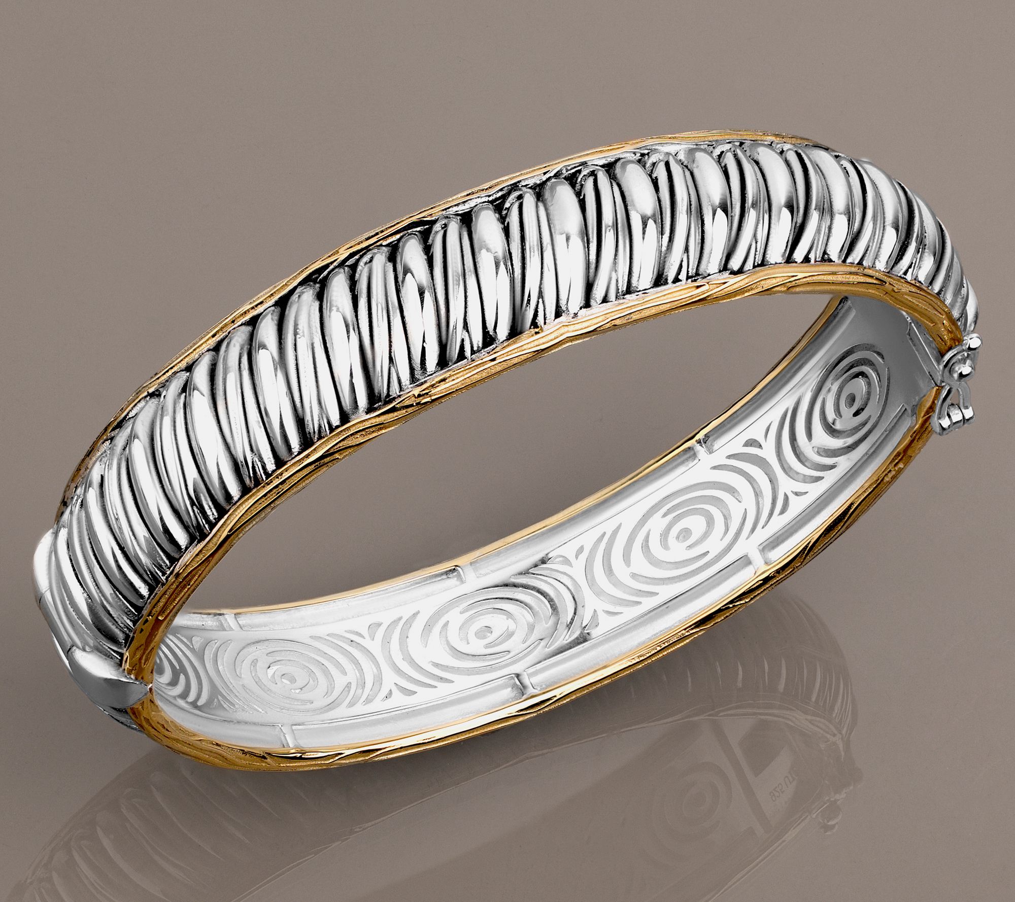 Sterling silver, 14K yellow gold-clad sterling silver Total weights are approximate: X-Small 44.2g; Small 47.2g; Average 49.4g; Large 51.5g; X-Large 53.4g Two-tone bangle design; ribbed center with black antiqued finish; textured edges Hidden box clasp with double figure-eight safety catches Due to the design elements of this bracelet, the fit and length measurements may differ; please order according to fit Extra-Small: 6-1/2" Fit; measures approximately 1/2"W Small: 7" Fit; measures approximately 1/2"W Average: 7-1/2" Fit; measures approximately 1/2"W Large: 8-1/4" Fit; measures approximately 1/2"W Extra-Large: 8-1/2" Fit; measures approximately 1/2"W Box, romance card Imported