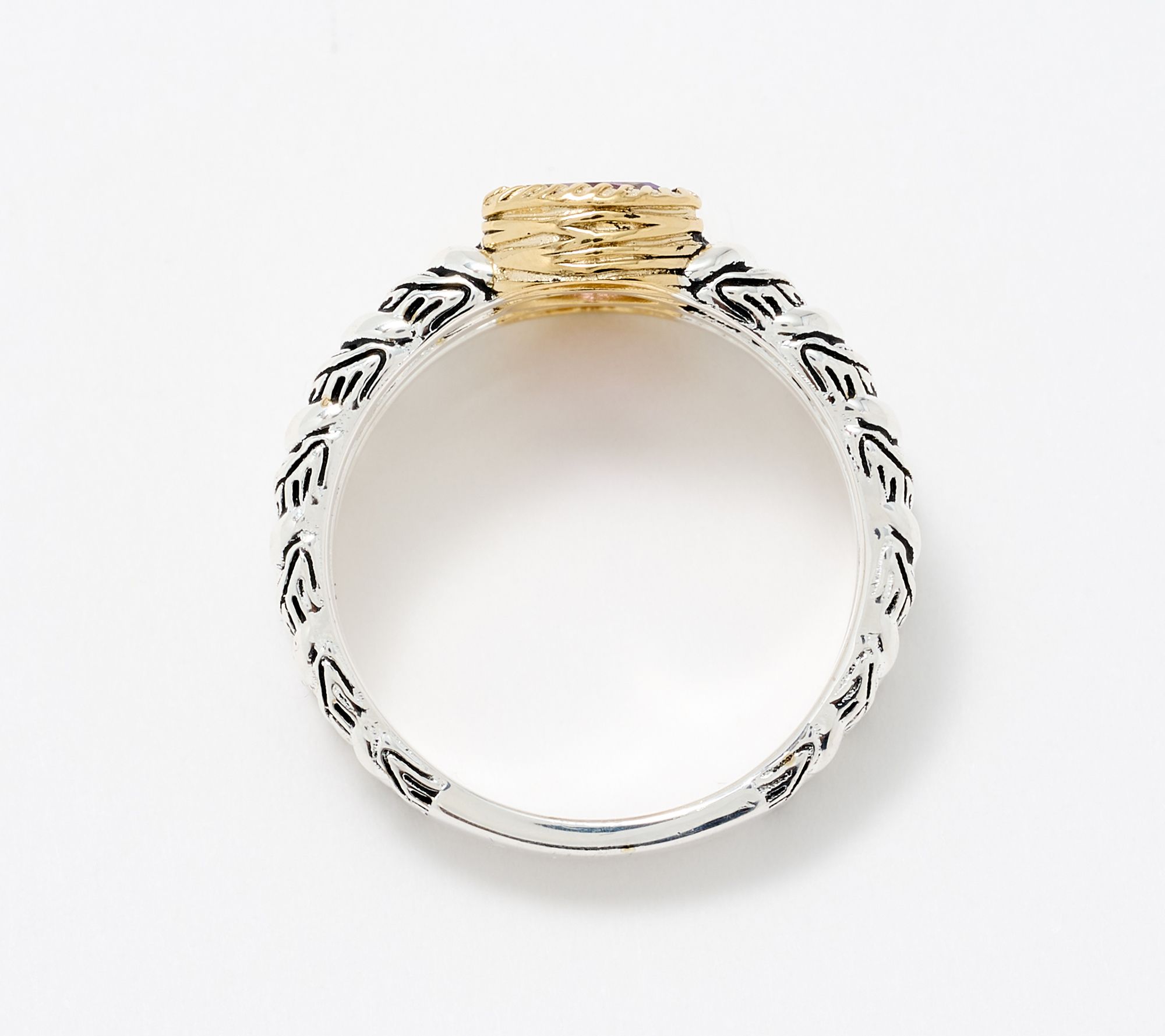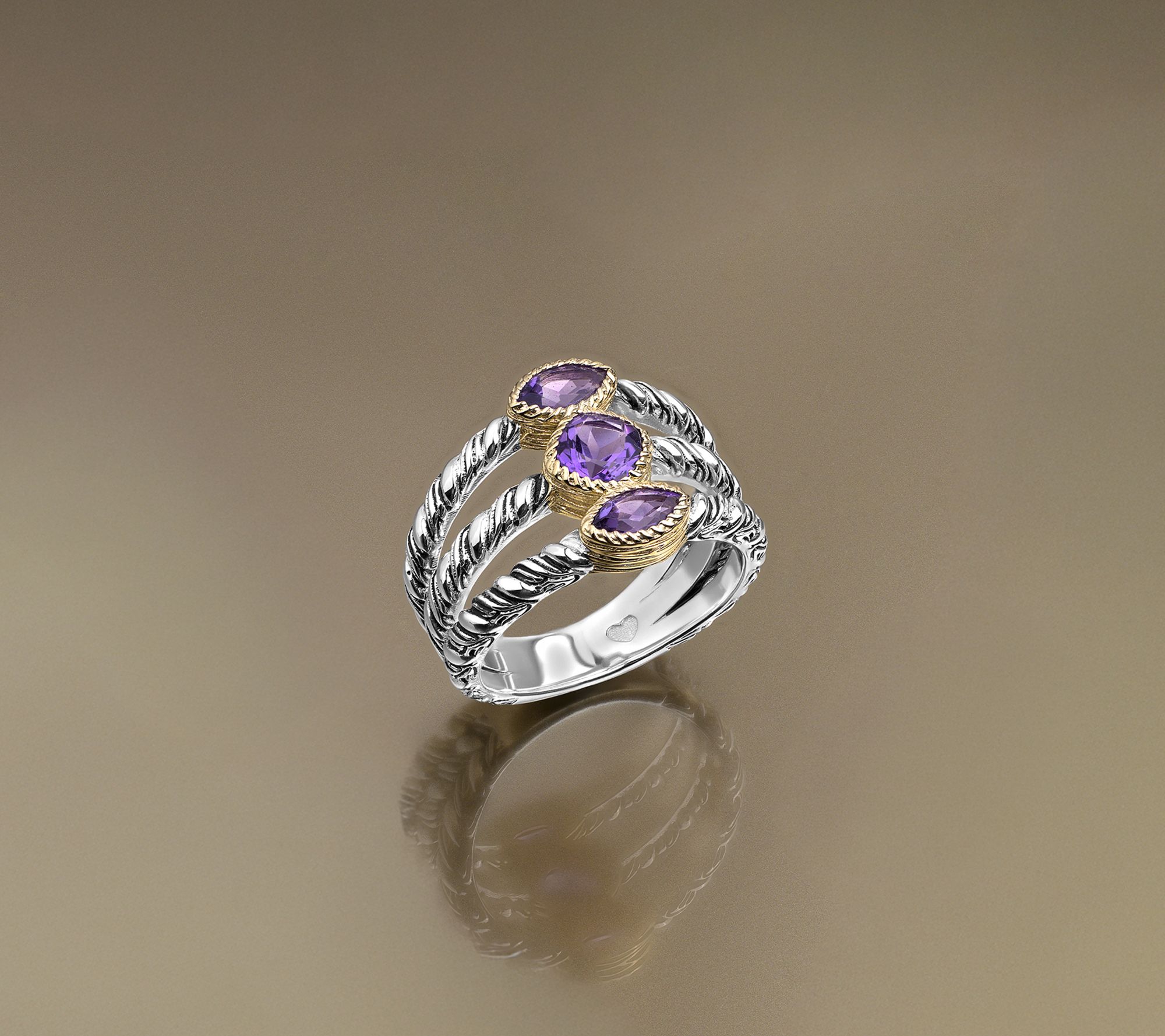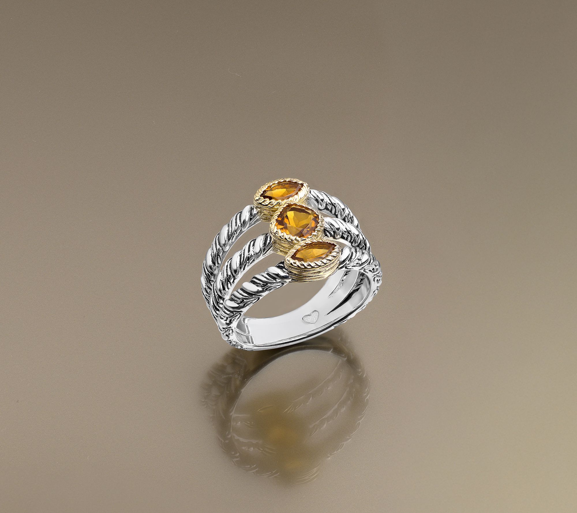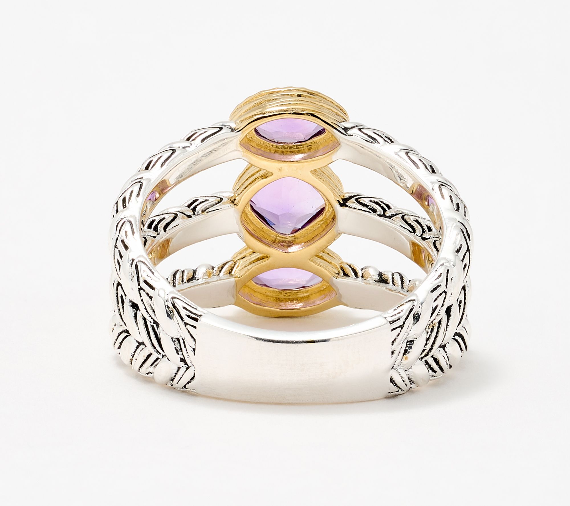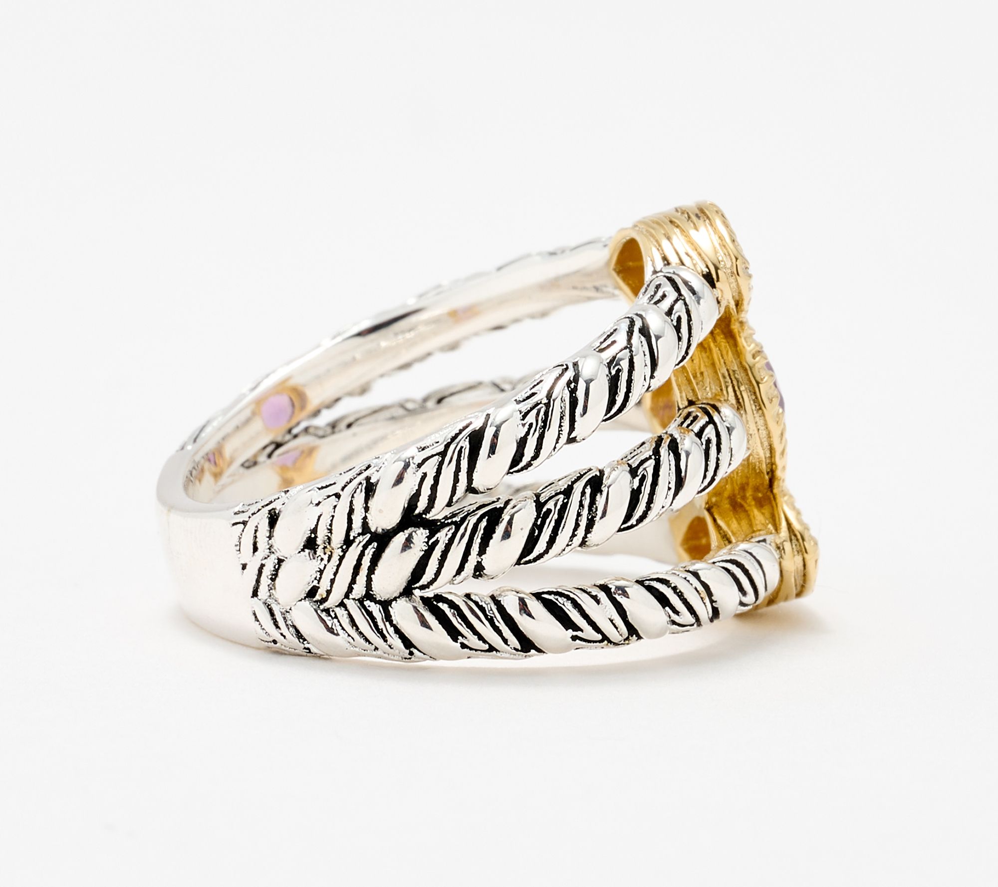 Feel connected, look stunning. This two-tone gemstone ring from the Ripple Collection showcases three vibrant gemstones framed by waves of sterling silver and 14K yellow gold-clad sterling silver. The ripple bands' antiqued finish catches the light beautifully, ideal for brightening up everyday looks or adding a spirited touch to special gatherings. From Christian James by Scott Grimes.