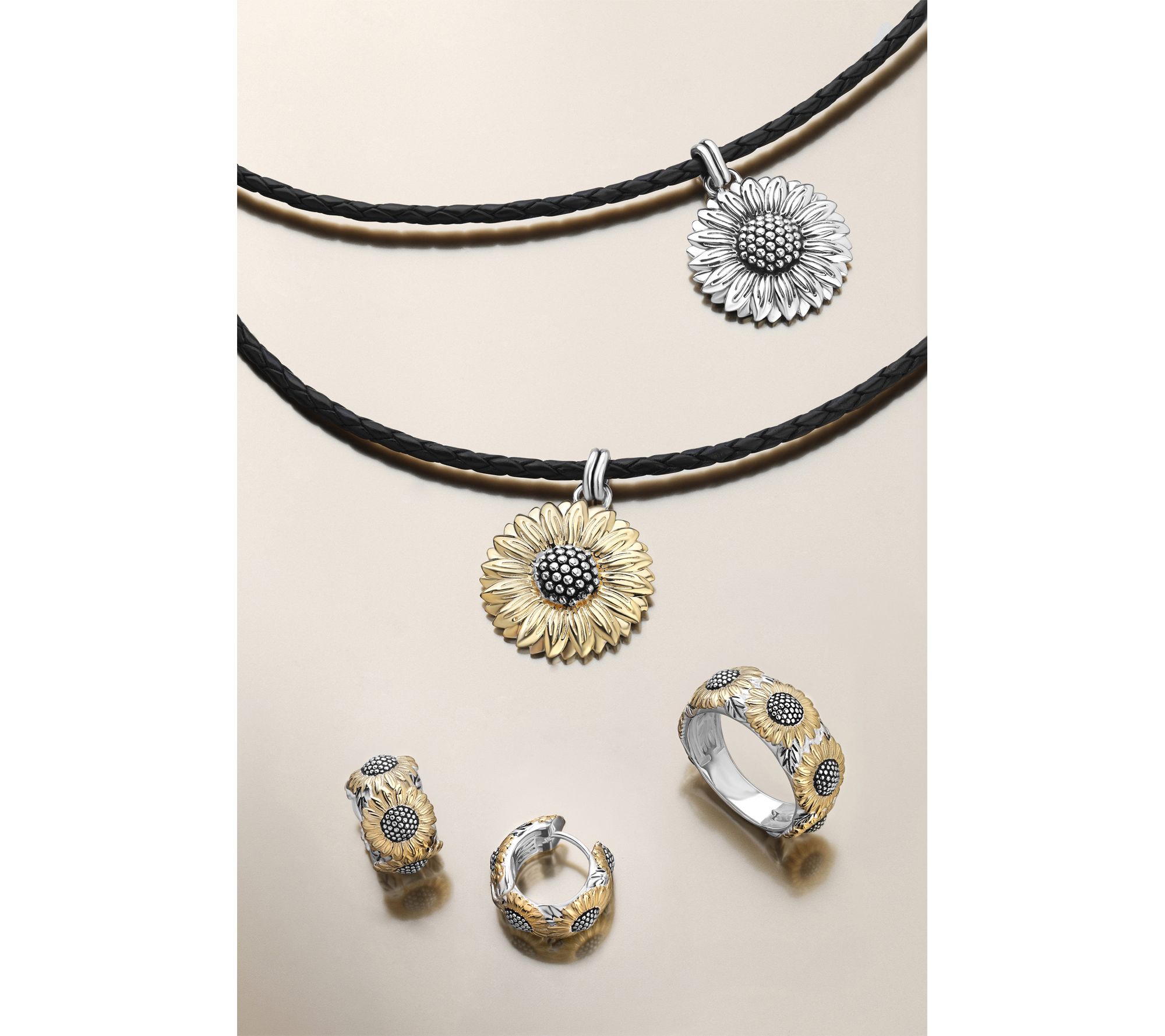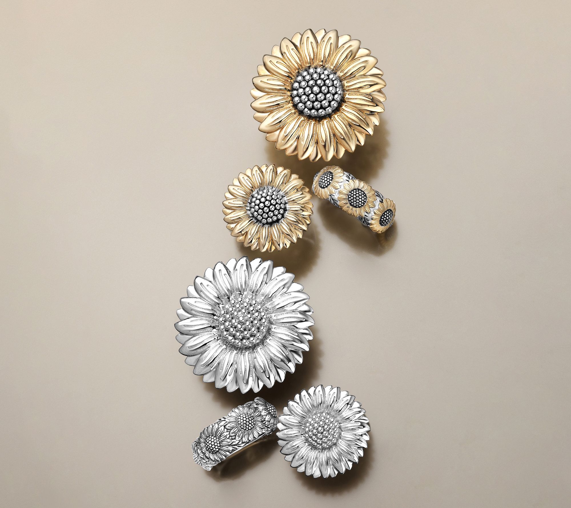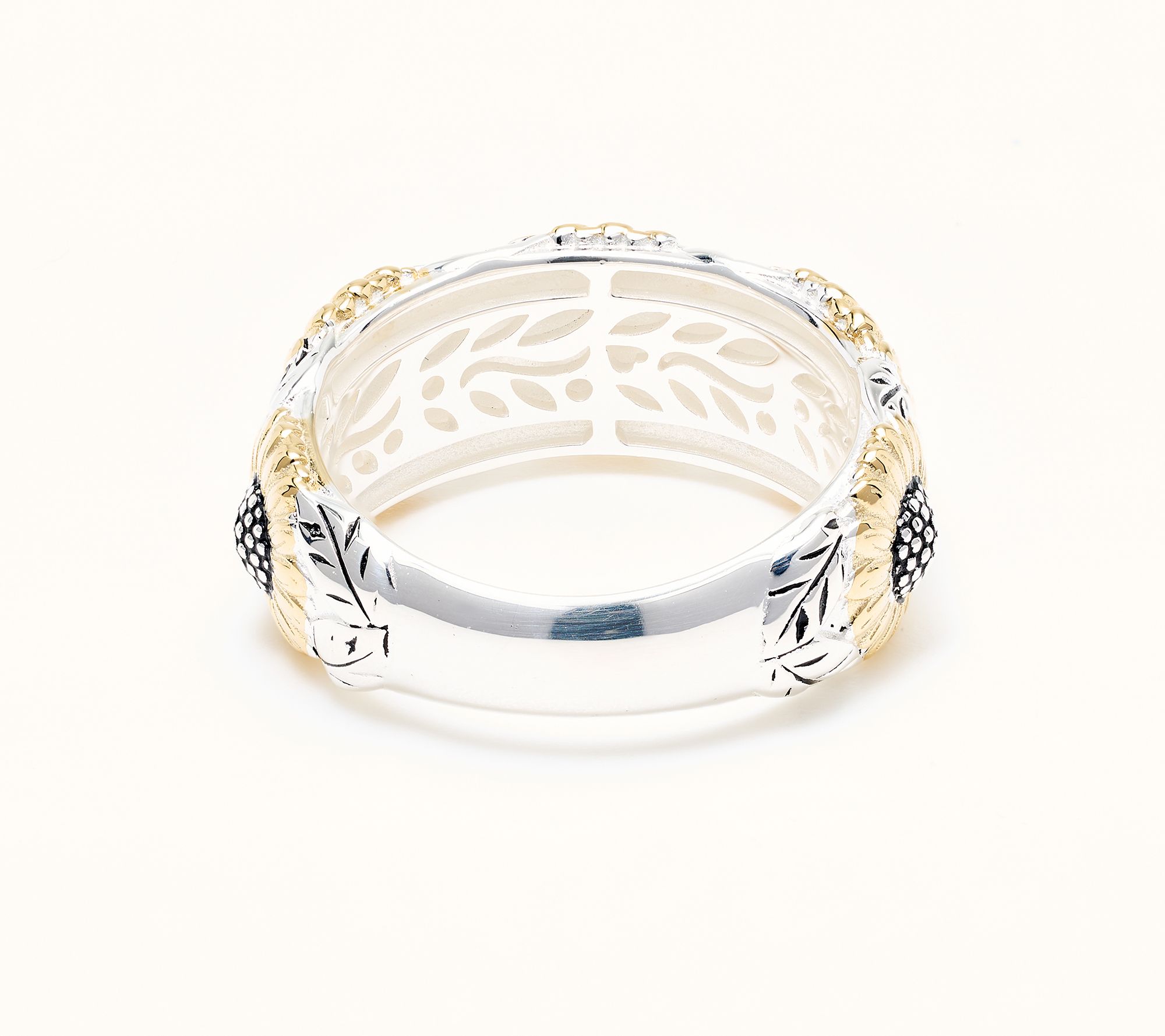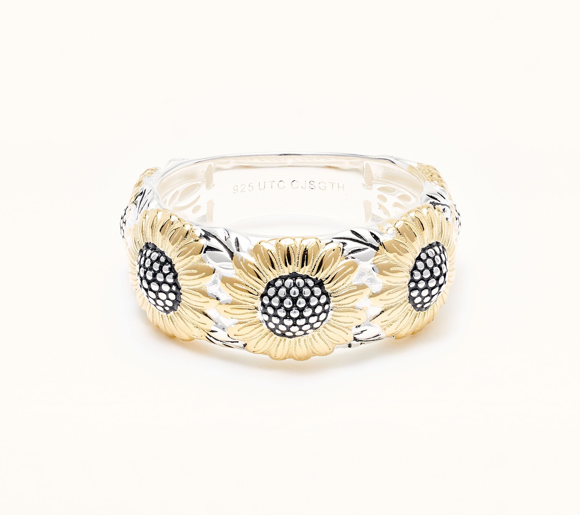 • Two-tone design; multi sunflower motif band ring; lightly oxidized finish in center