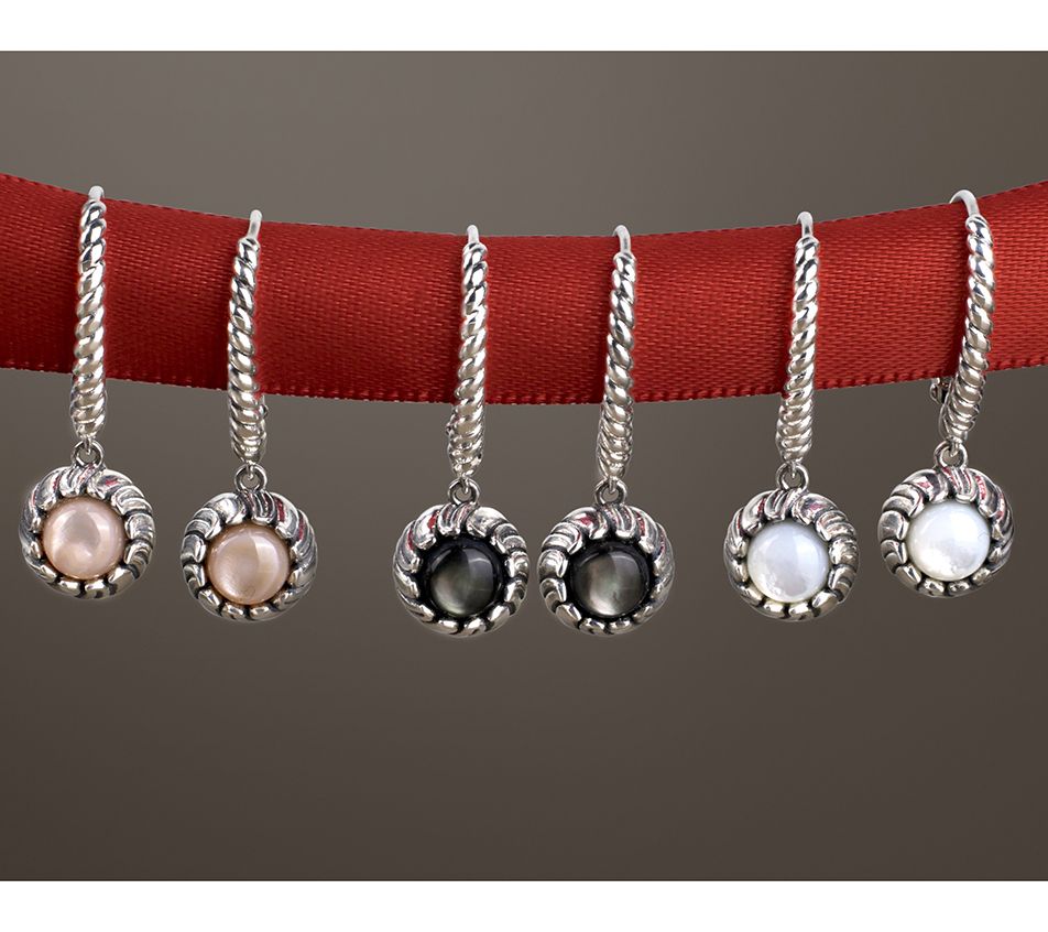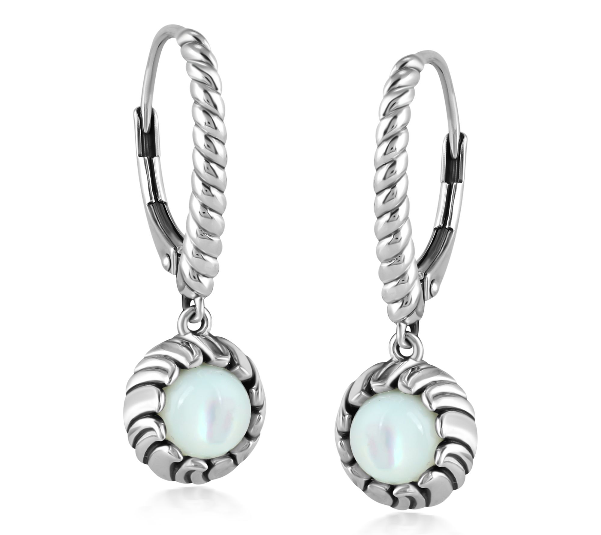• Ribbed lever back design; mother-of-pearl dangles; polished finish; left/right design