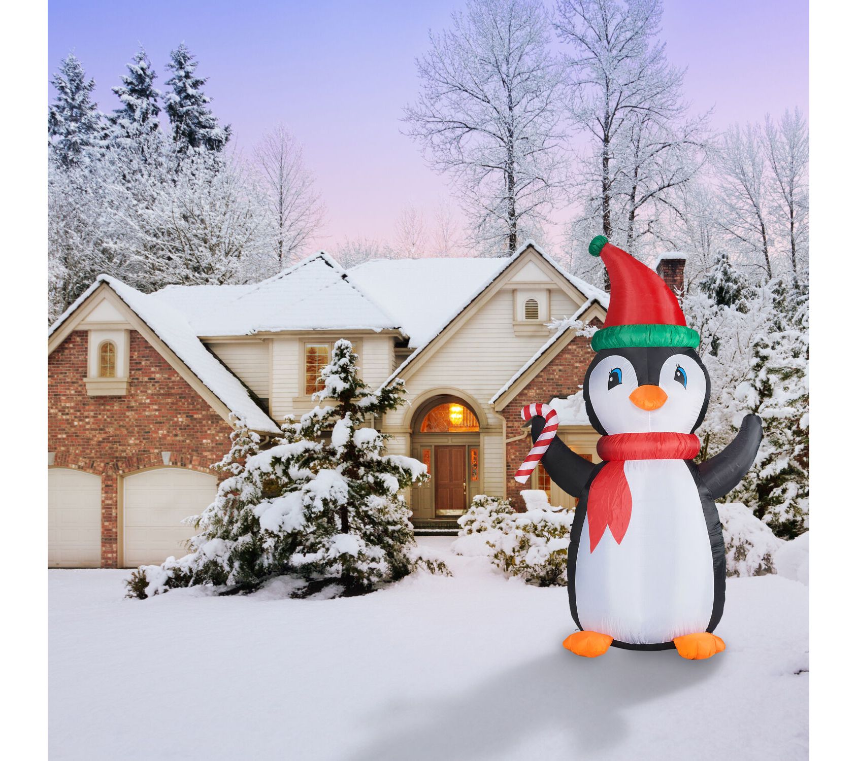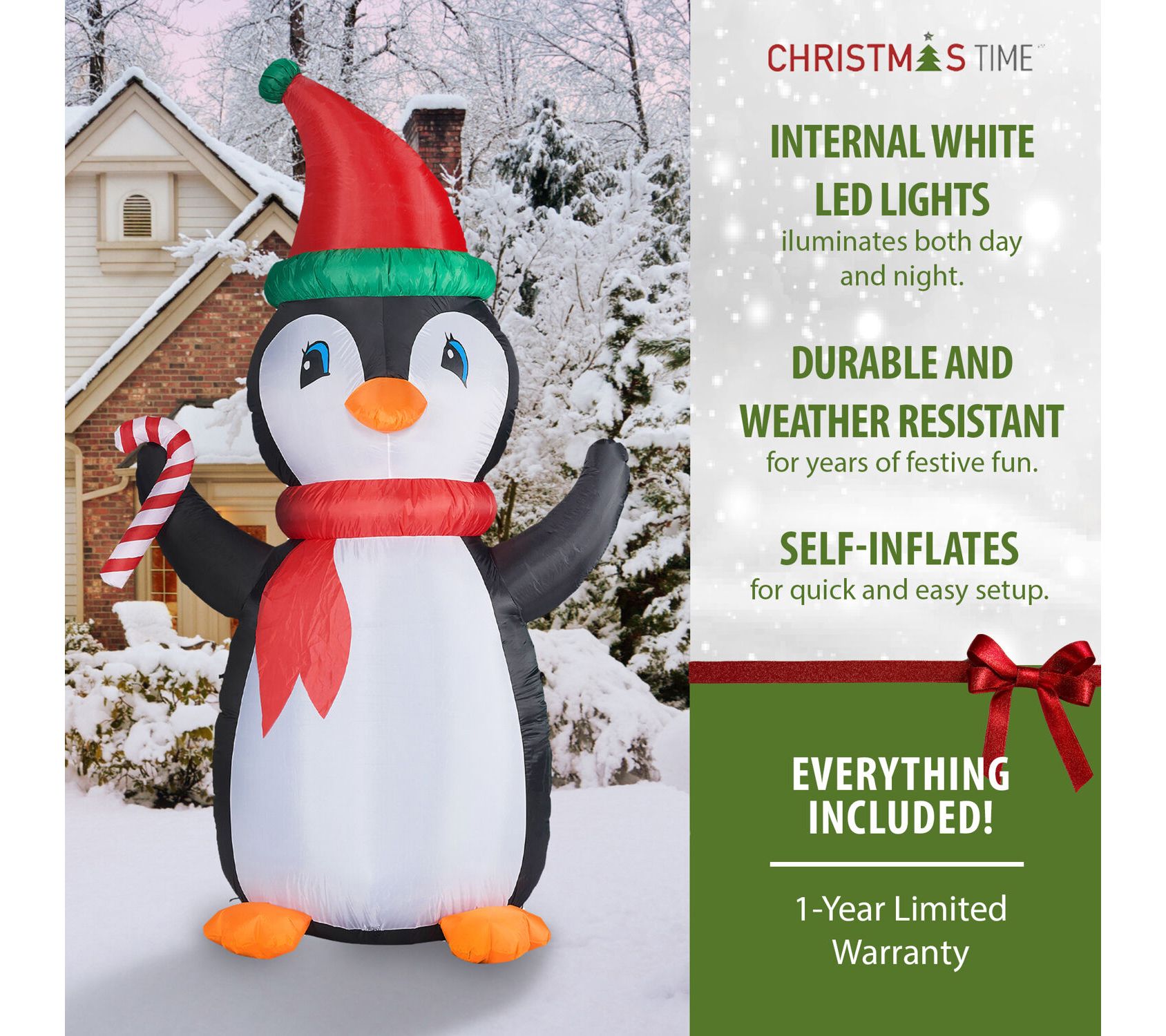 Celebrate Christmas in a big way with the Christmas Time 10'H Penguin with RGB Lights. This adorable inflatable will brighten your lawn, garden, porch, or deck with its flickering lights, creating a magical holiday scene. Setup is a breeze, and everything you need is included. From Christmas Time.