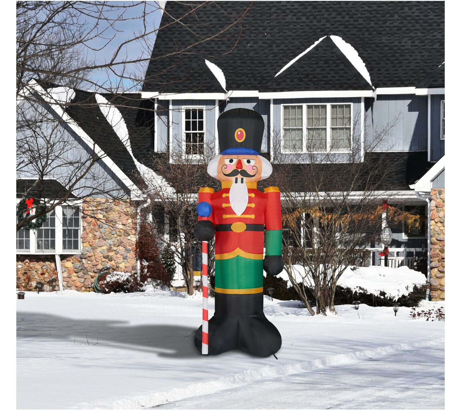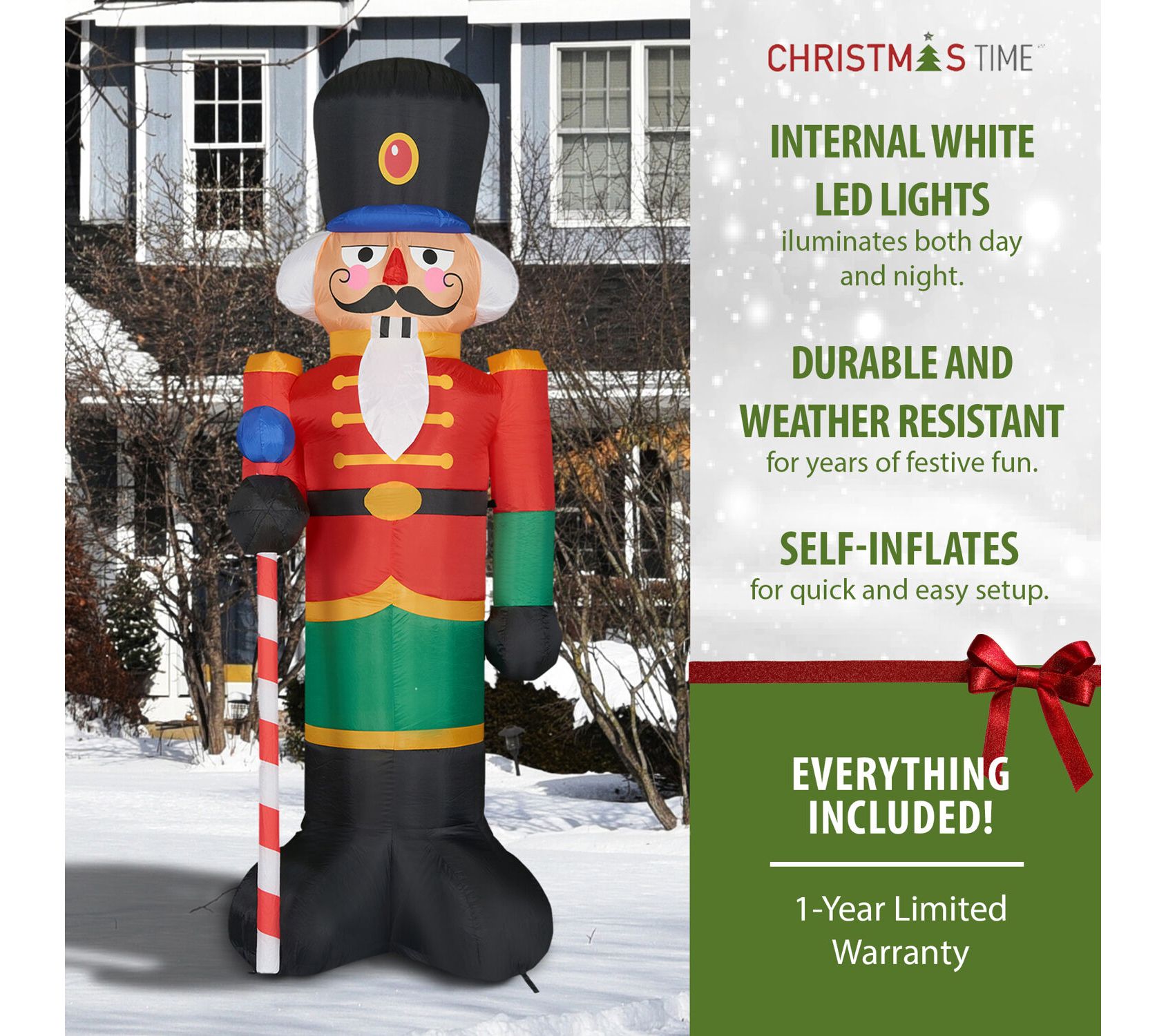 Ready for battle, this Christmas Time prelit 10' tall traditional nutcracker helps you celebrate Christmas in grand fashion. Perfect for brightening your lawn, garden, or backyard, this impressive inflatable is sure to dazzle during your seasonal festivities. Setup is quick and easy with everything you need included in the package. From Christmas Time.