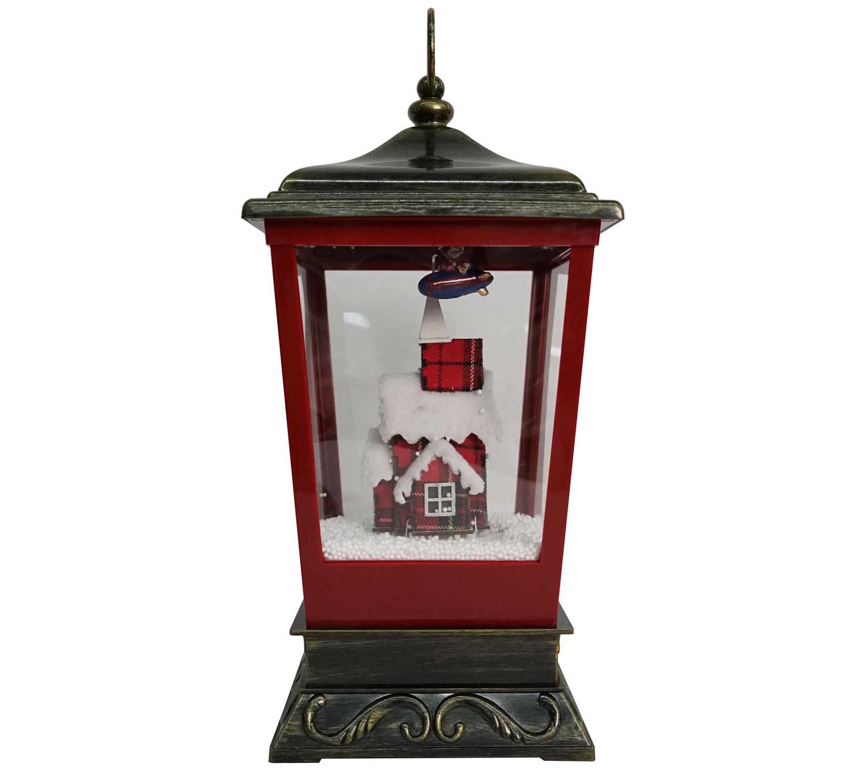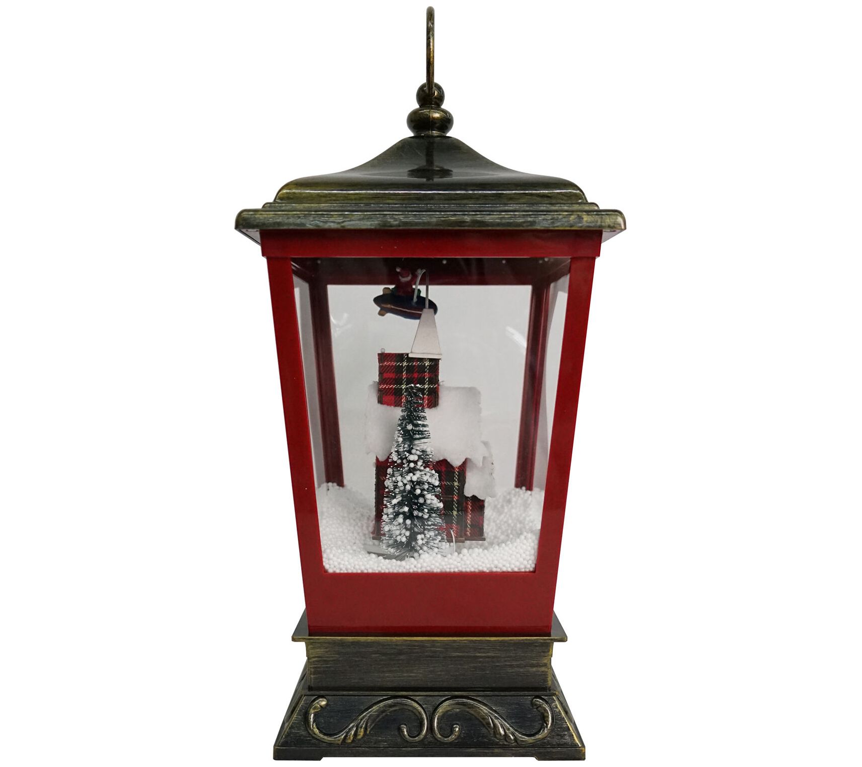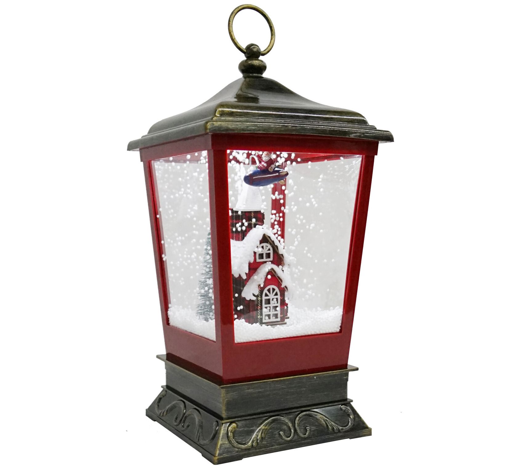 Showcasing charming illumination, festive music, and swirling faux snow that cascades over a flying Santa scene, this tabletop lantern is a magical way to embrace the beauty of the holiday season. From Christmas Time.