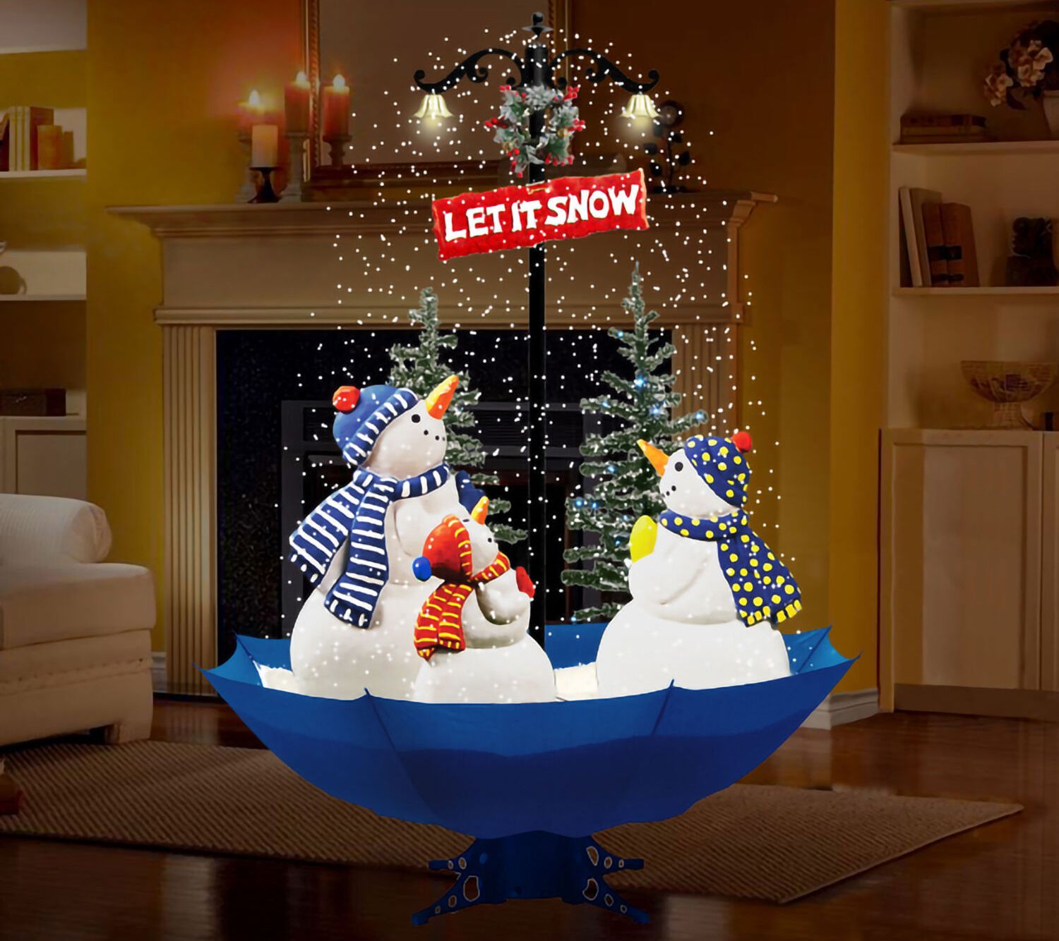 • Includes umbrella base, base support, transformer, ring support, three snowmen, two trees, string lighting, street lamp, lamp post top, plaque, wreath, and snow pellets