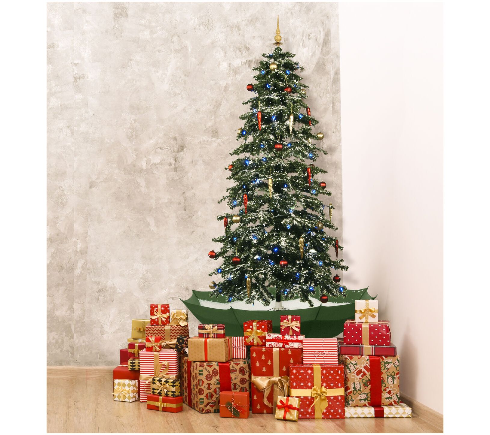 • Includes umbrella base, base support, transformer, Christmas tree, string lighting, decorations, topper, snow pellets, hardware, instructions