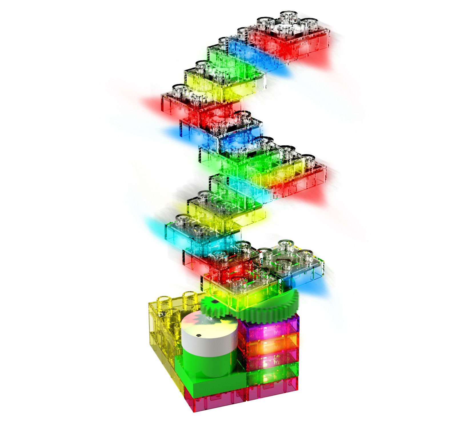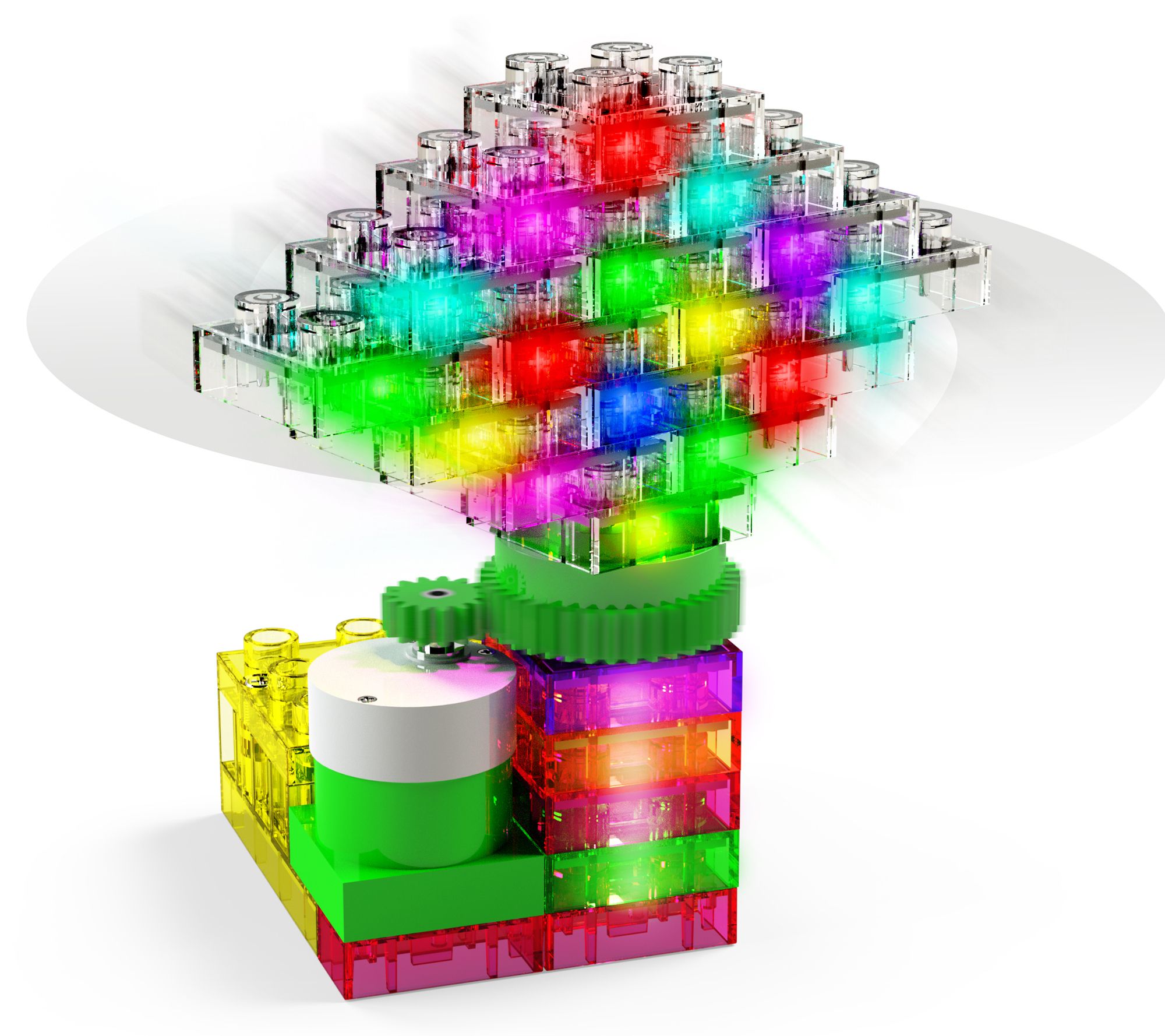 • Includes 16 color-changing and flashing LED bricks, purple LED brick, orange LED brick, green LED brick, pink LED brick, battery pack, two 1x2 pink spacers, gear, geared motor, and instruction sheet