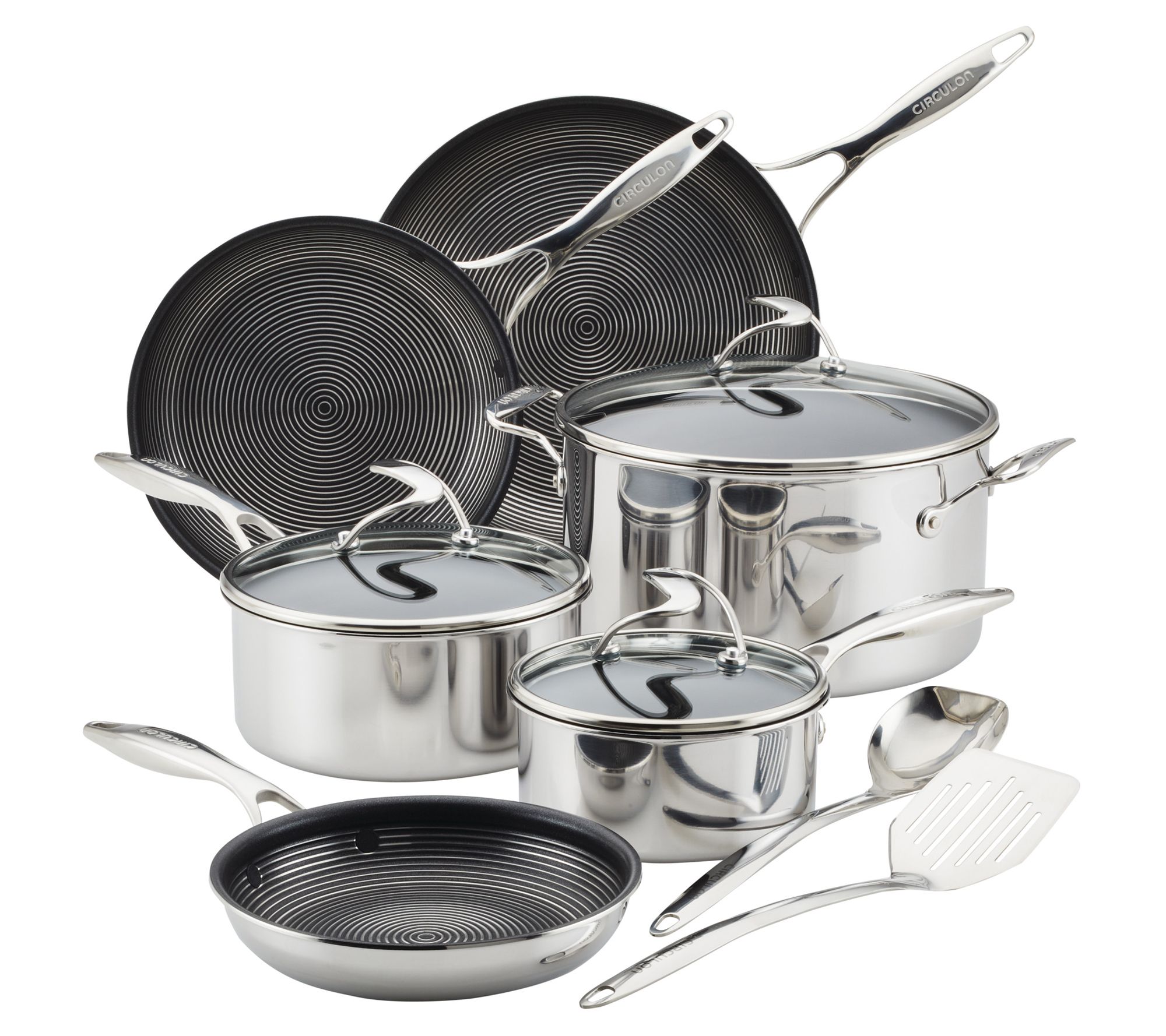 Includes 1.5-qt saucepan with lid, 3-qt saucepan with lid, 8-qt stockpot with lid, 8.5" frying pan, 10" frying pan, 12.5" frying pan, 13" slotted turner, and 13" solid scraping spoon