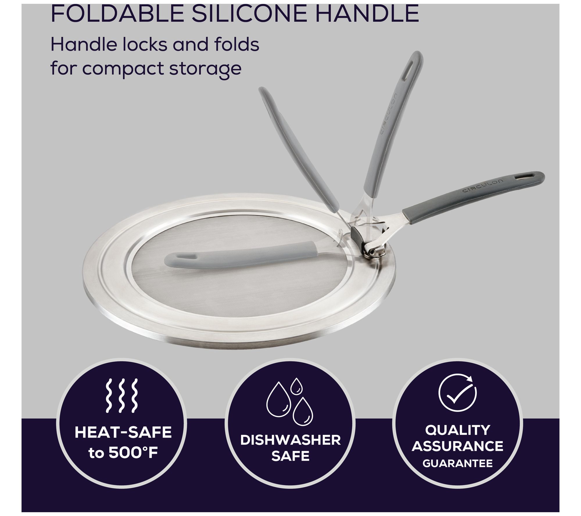 Sear, saute, and sizzle without the mess! The Circulon universal splatter guard and grease cover keeps your stovetop and counter clean while cooking. Crafted with a stainless steel interior mesh panel, the splatter guard allows steam to escape, ensuring your food crisps and browns perfectly. The comfortable stay-cool silicone handle folds away for easy storage. This versatile tool also doubles as a strainer and is dishwasher-safe for quick cleanup. From Circulon.