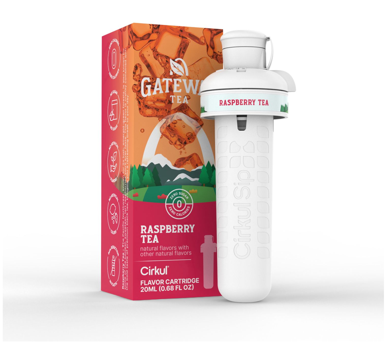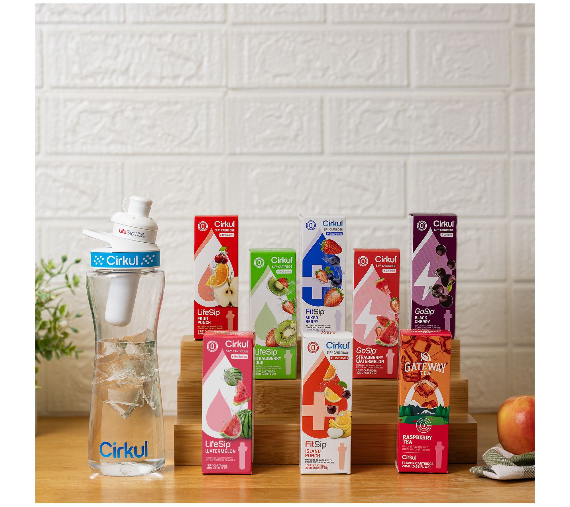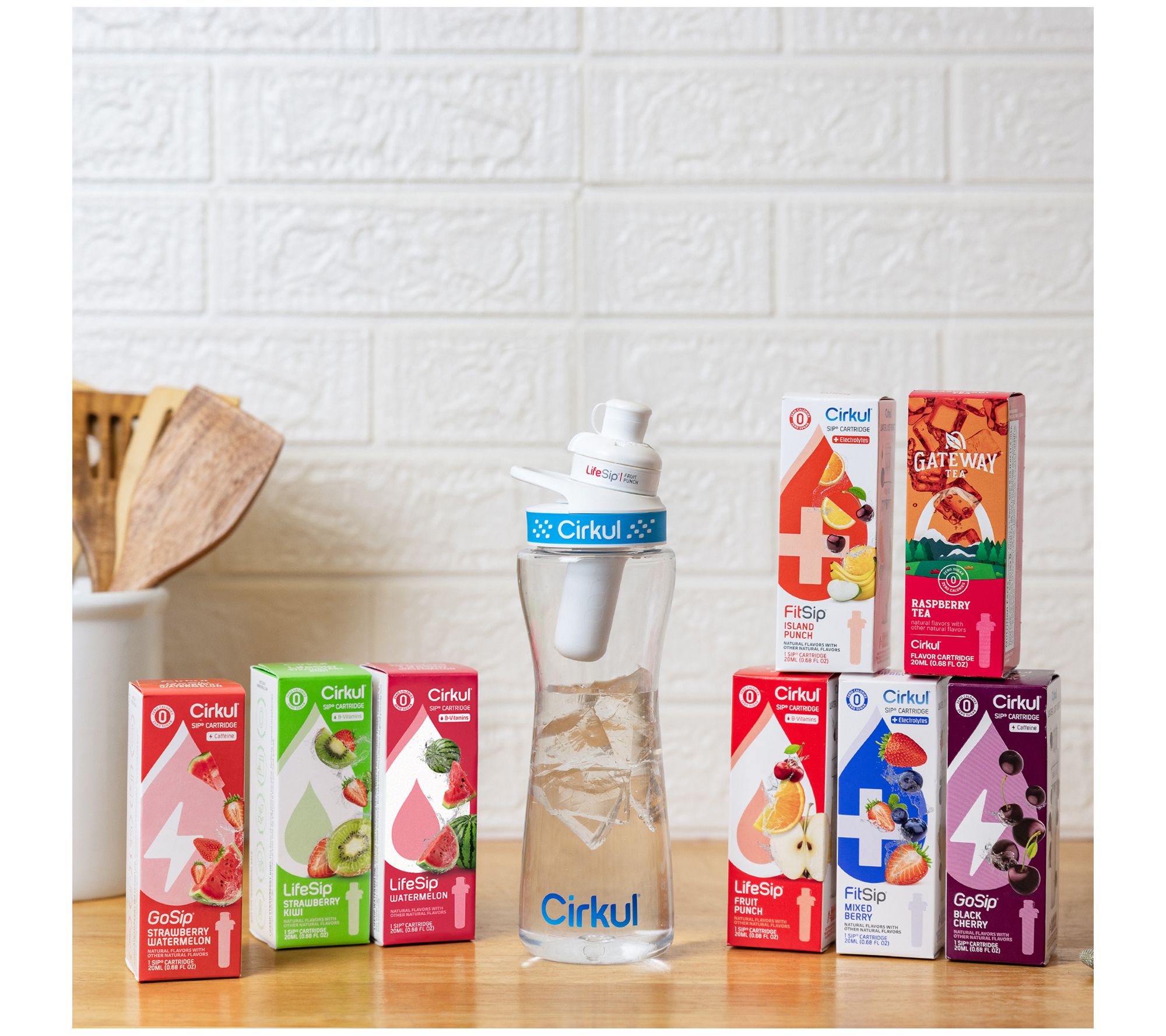 • Includes 22-oz water bottle and eight flavor cartridges: one each of Fruit Punch, Strawberry Kiwi, Watermelon, Strawberry Watermelon, Black Cherry, Island Punch, Mixed Berry, and Raspberry Tea