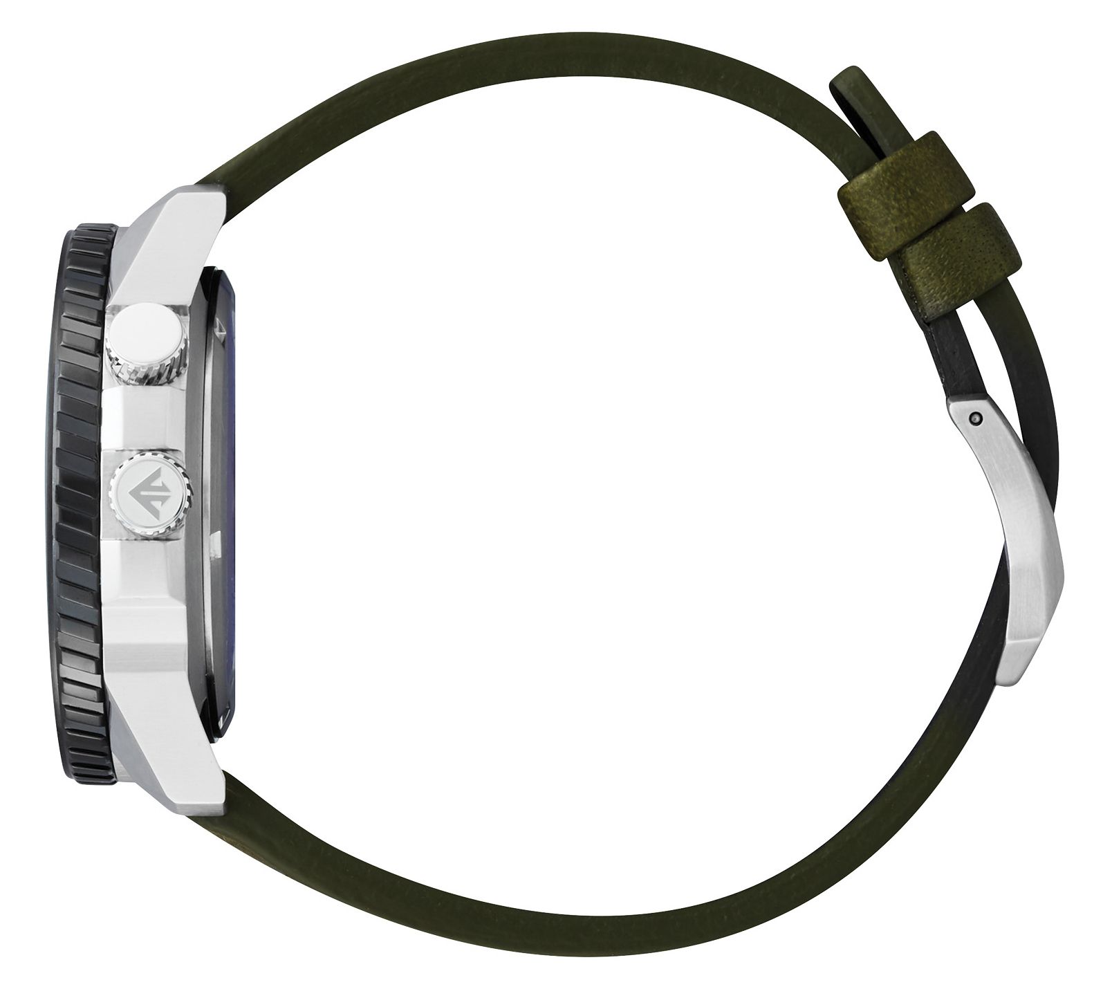 • Black dial; hour, minute, and second hands; dual time zones, current date, and chronograph
