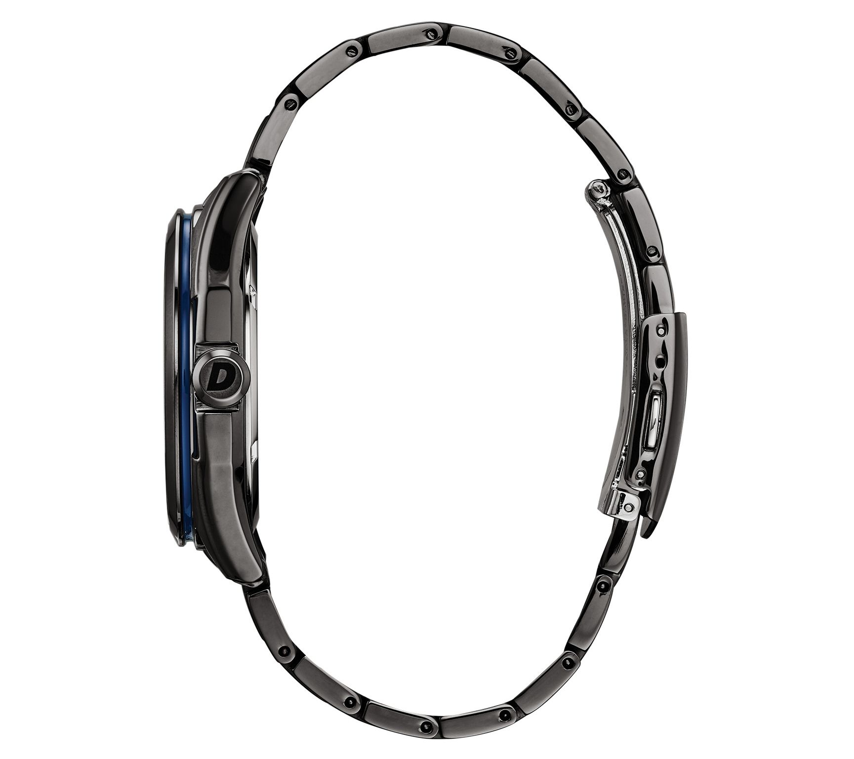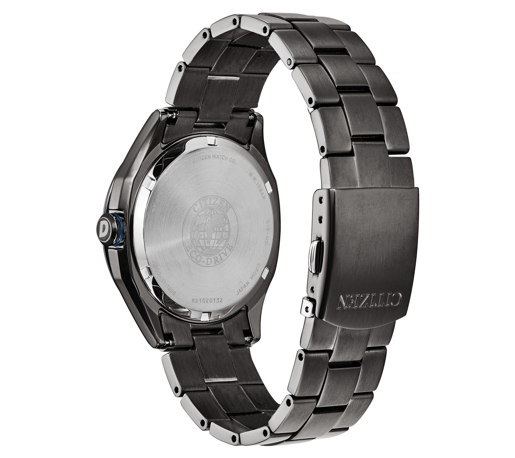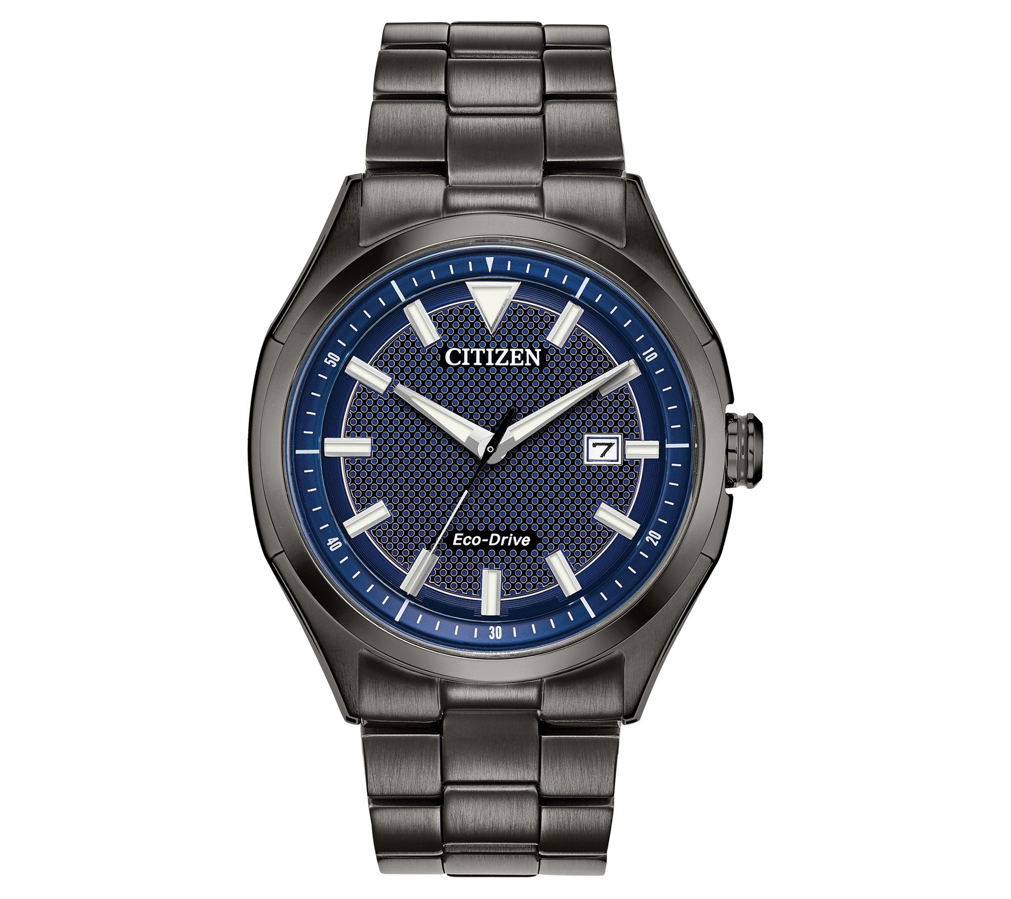 An edgy structure in a classic setting, this Eco-Drive men's watch wears well with anything in his wardrobe, thanks to the cool color combination of a denim blue dial and gunmetal design. From Citizen.