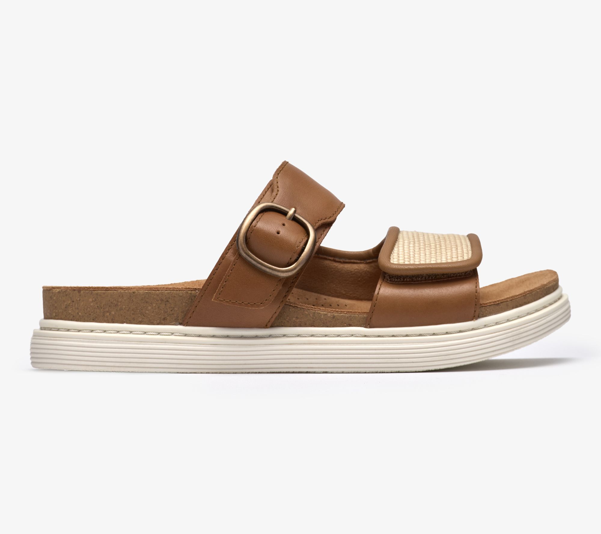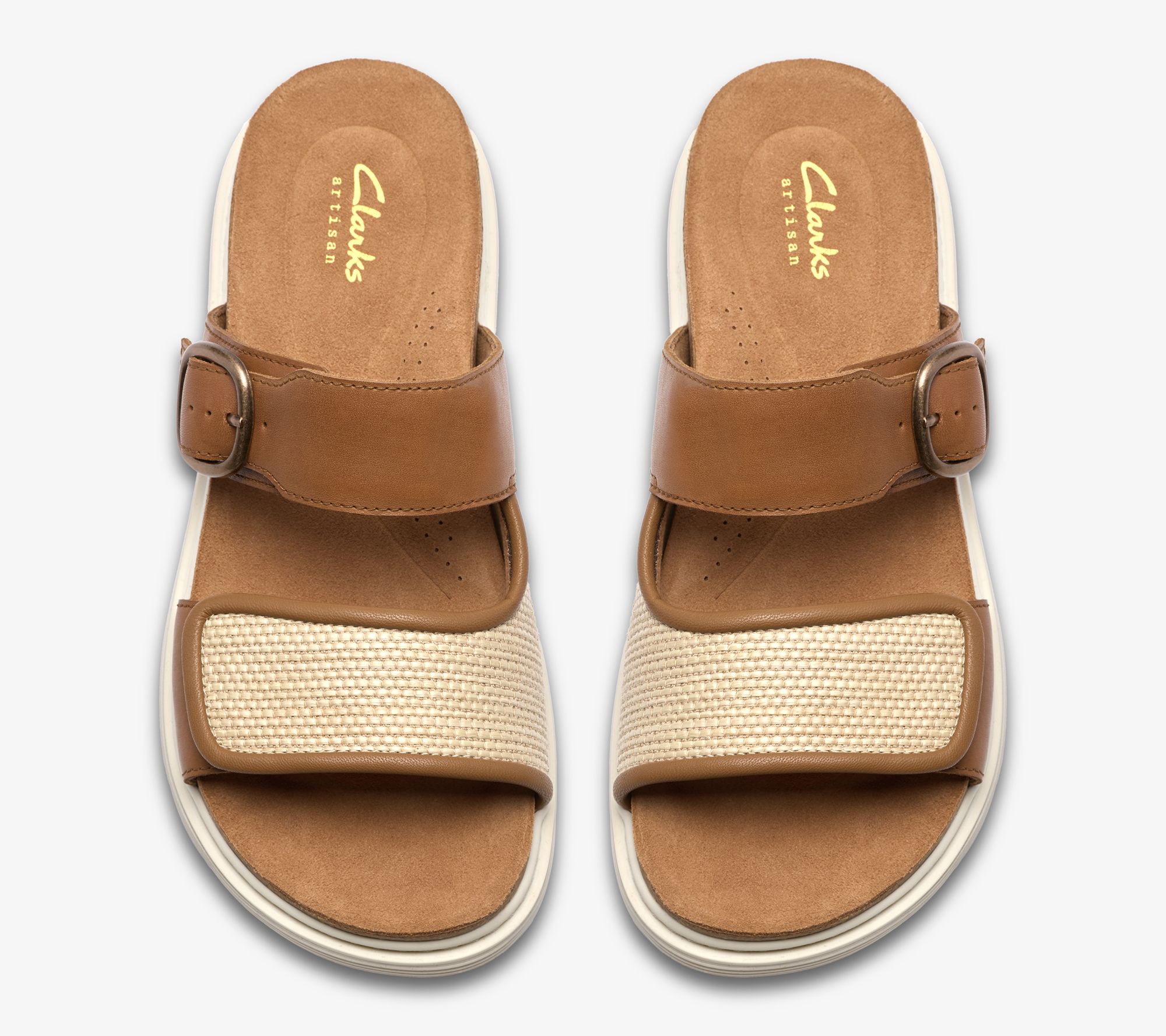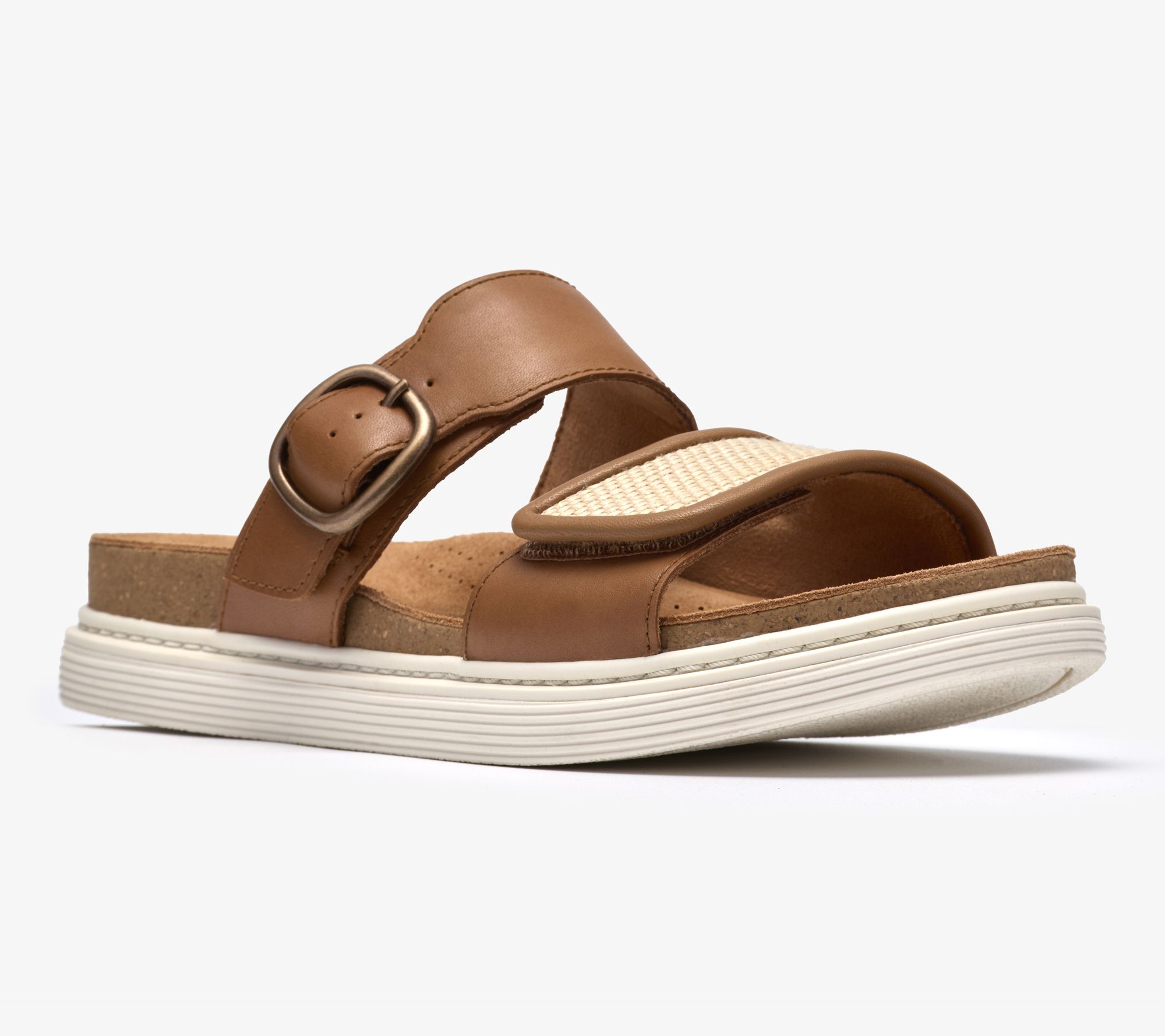 Clarks Artisan Leather Slide Sandals - Arwell Step. Premium leather upper with raffia detailing to vamp strap. Molded Contour Cushion footbed supports every step. Two adjustable straps deliver a secure custom fit. Breathable suede lining. Grippy and flexible TPR sole brings extra stability and traction. Heel Height:1.37" Sole Thickness:1/2". Material:Leather Upper;Balance Man-Made. Fit:True to Size. COO:Import.