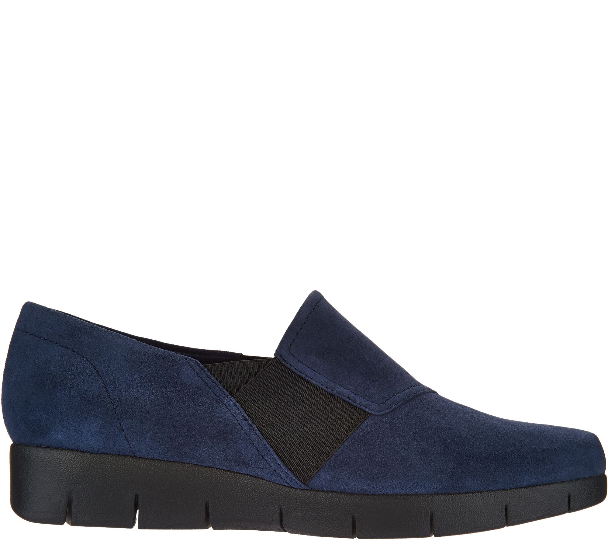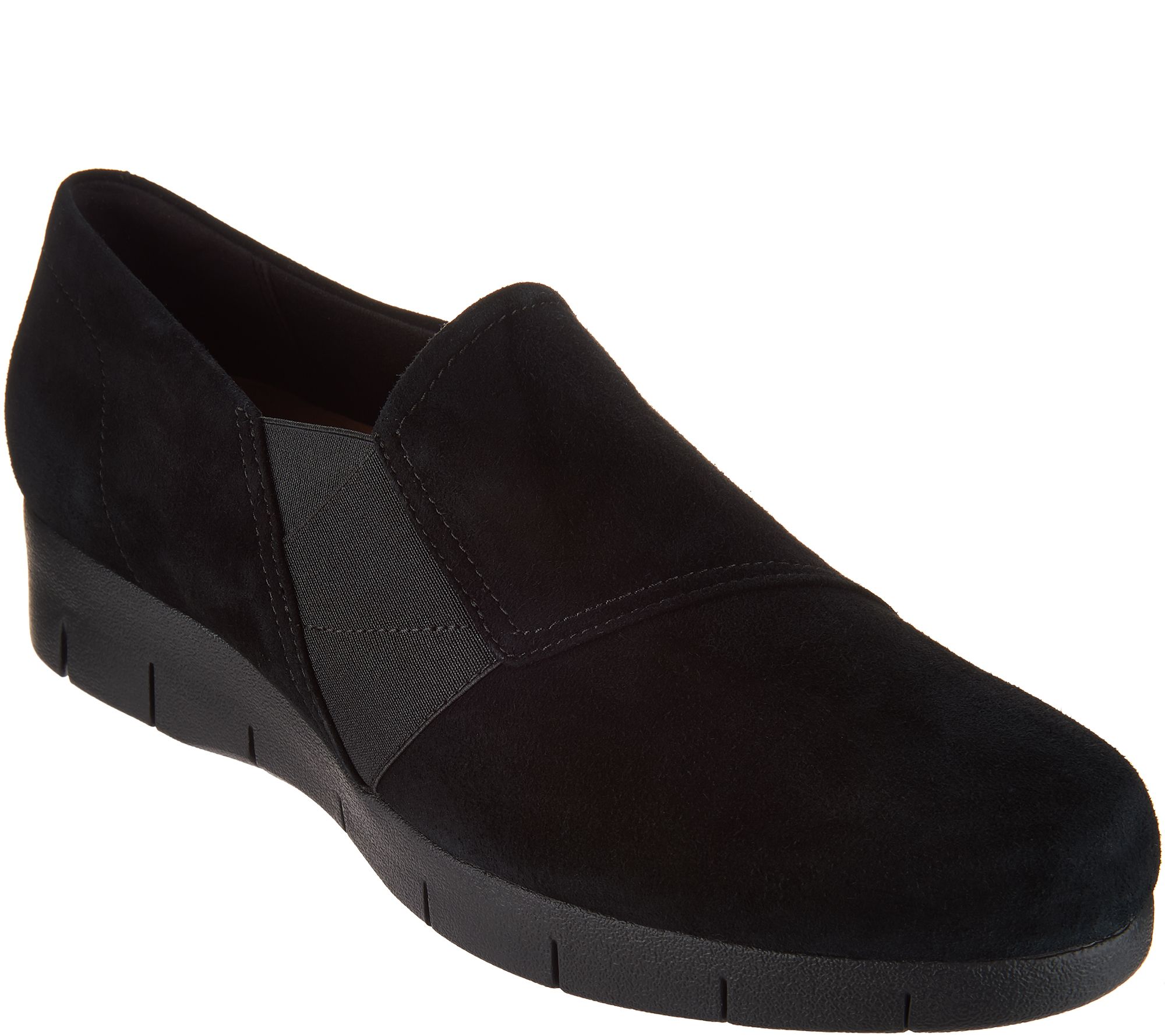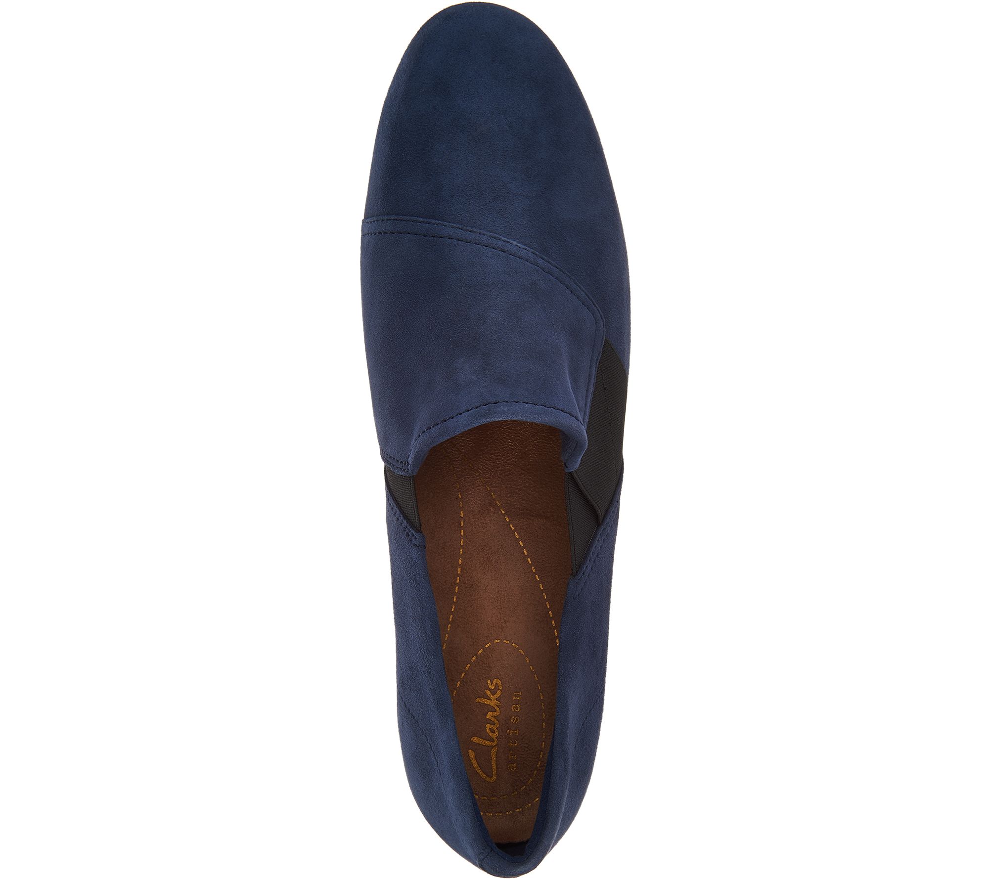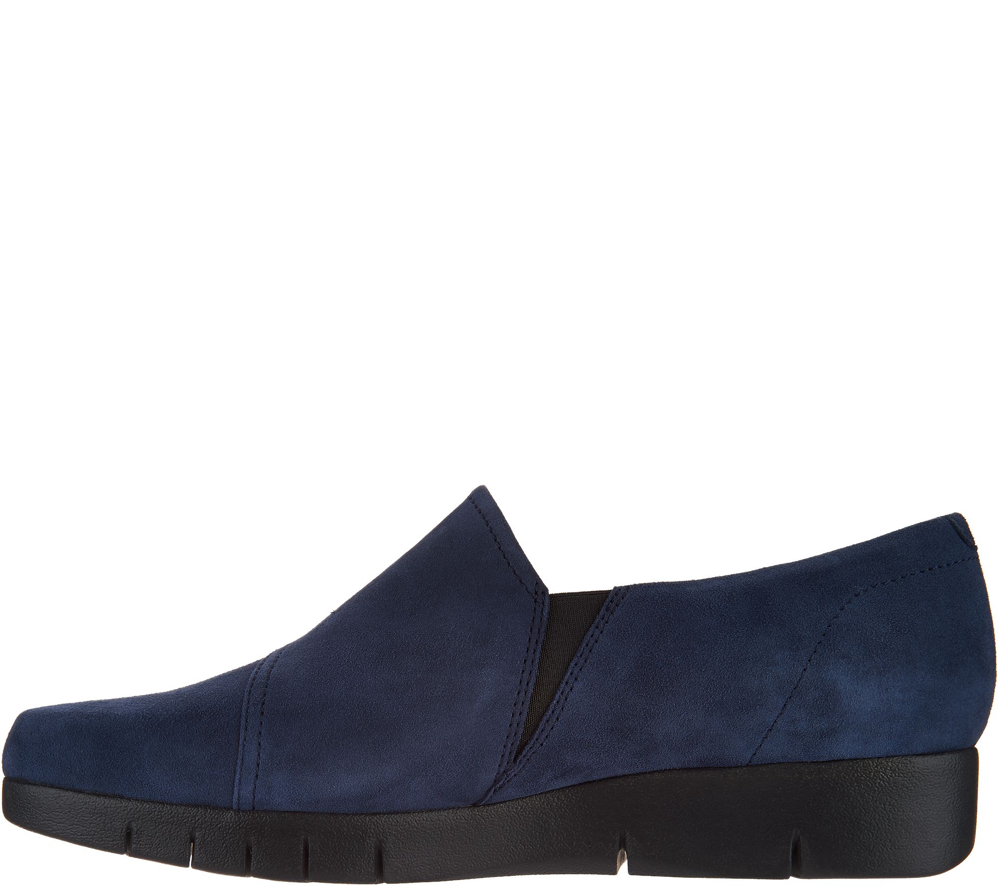 Clarks Artisan Suede Slip-on Shoes - Daelyn Monarch. These slip-ons feature a suede upper with stitching details. Goring at the sides for flexibility. Small wedge for added cushioning. Padded insole for comfort, textured outsole for traction. Content: Leather Upper, Balance manmade. COO: Imported._ Sole heigh approx.: 1-1/4". *Fit: True to size.