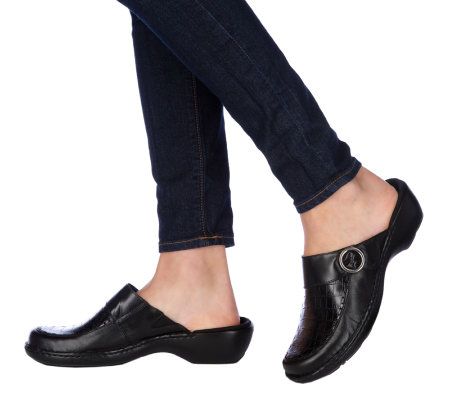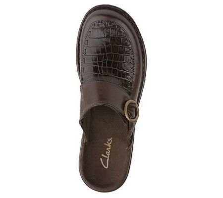 Go from work to weekend with effortless ease in these leather comfort clogs. The refined style is designed with a croco-embossed upper and strap and buckle detail across the top. From Clarks.