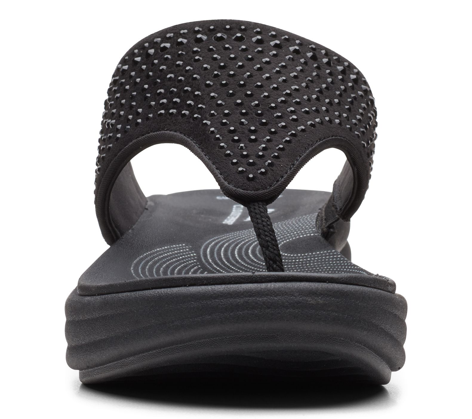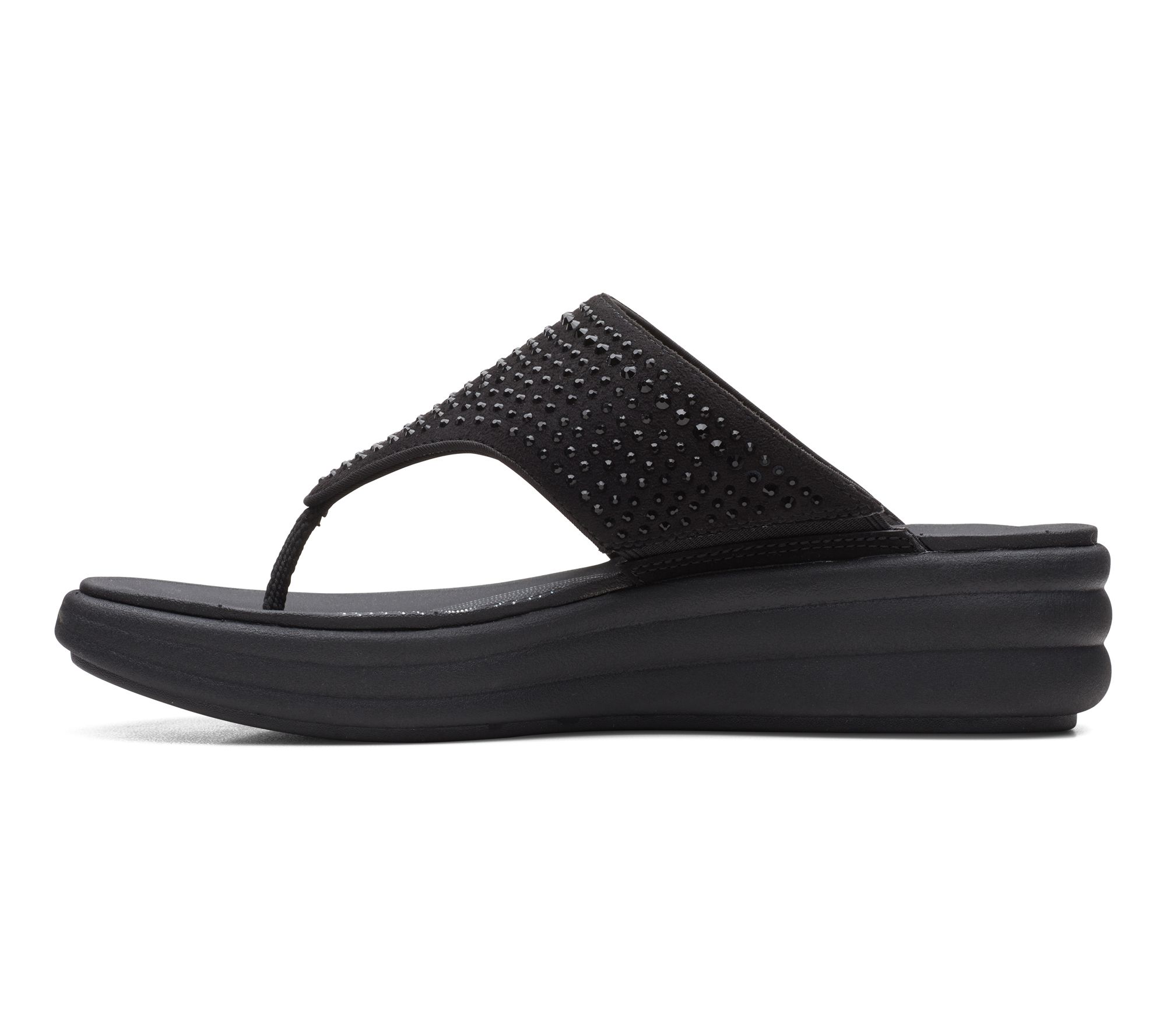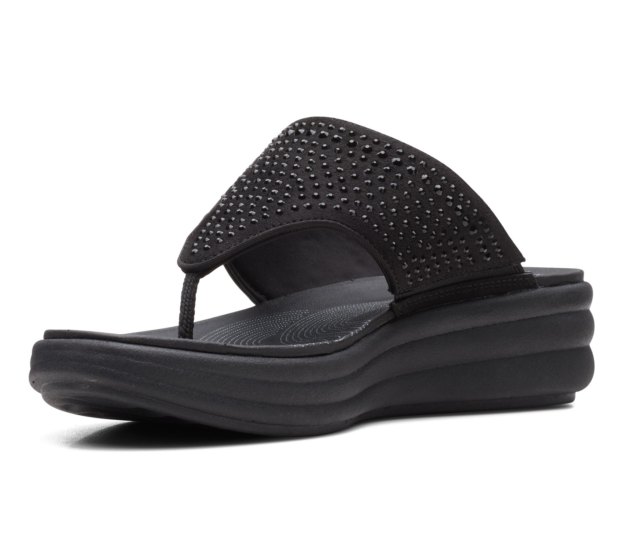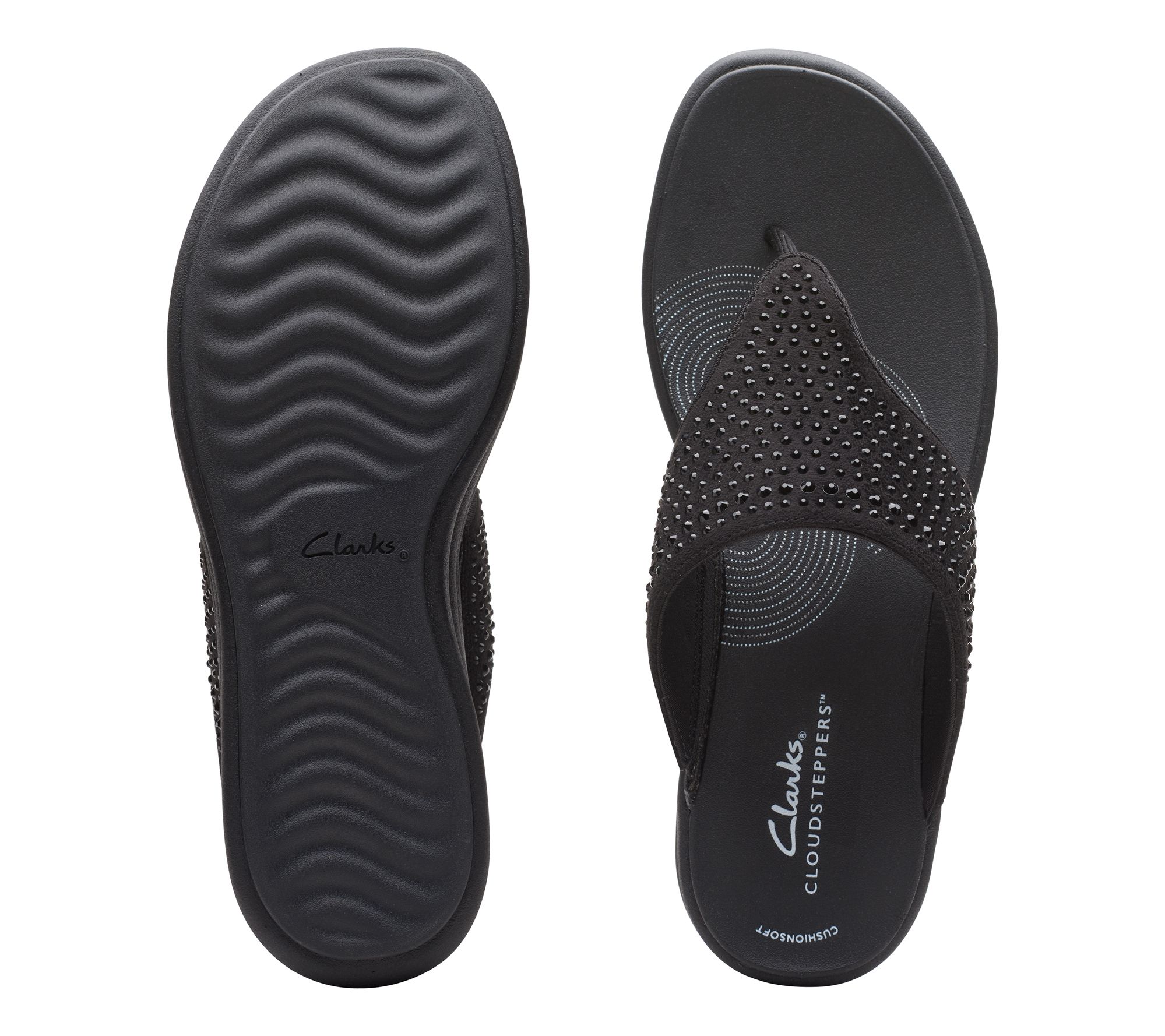 Sparkling rhinestones add a touch of flair to every step, making these thong sandals a stylish companion for vacation getaways, lunchtime strolls, or casual errands around town. Their soft textile upper stretches for a simple slip-on fit, while the cloud-like cushioning keeps feet happy through hours of wear. From Clarks Footwear.