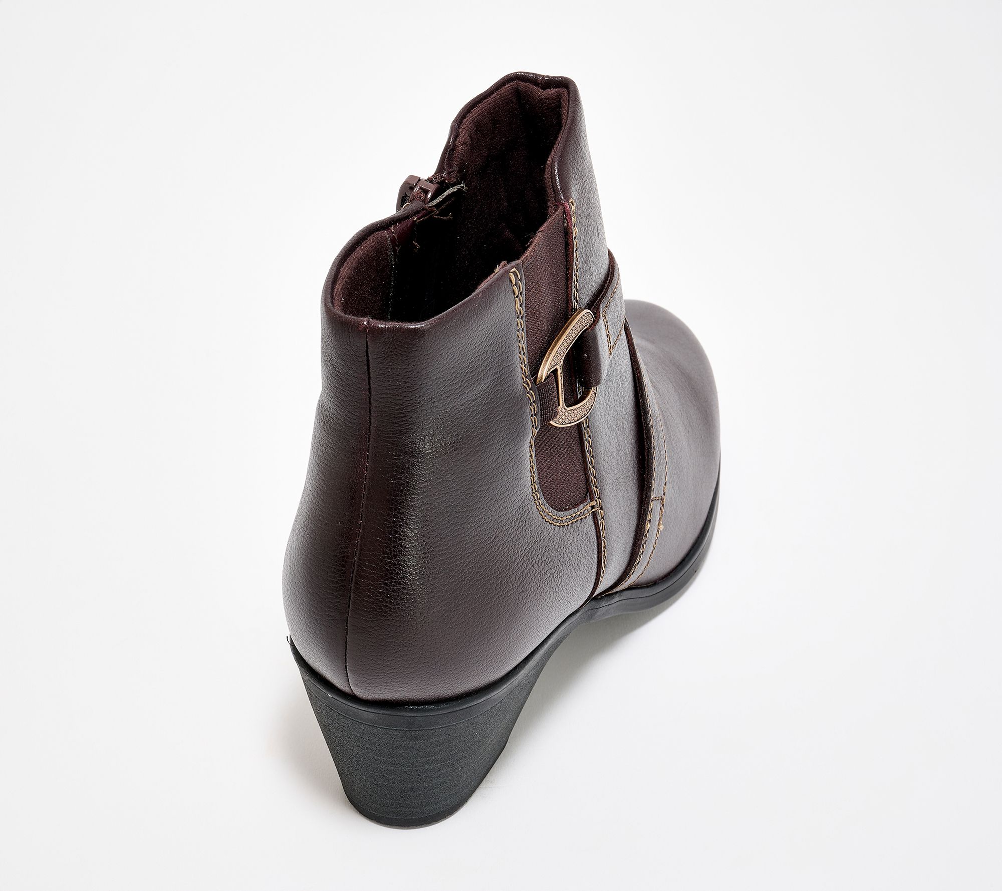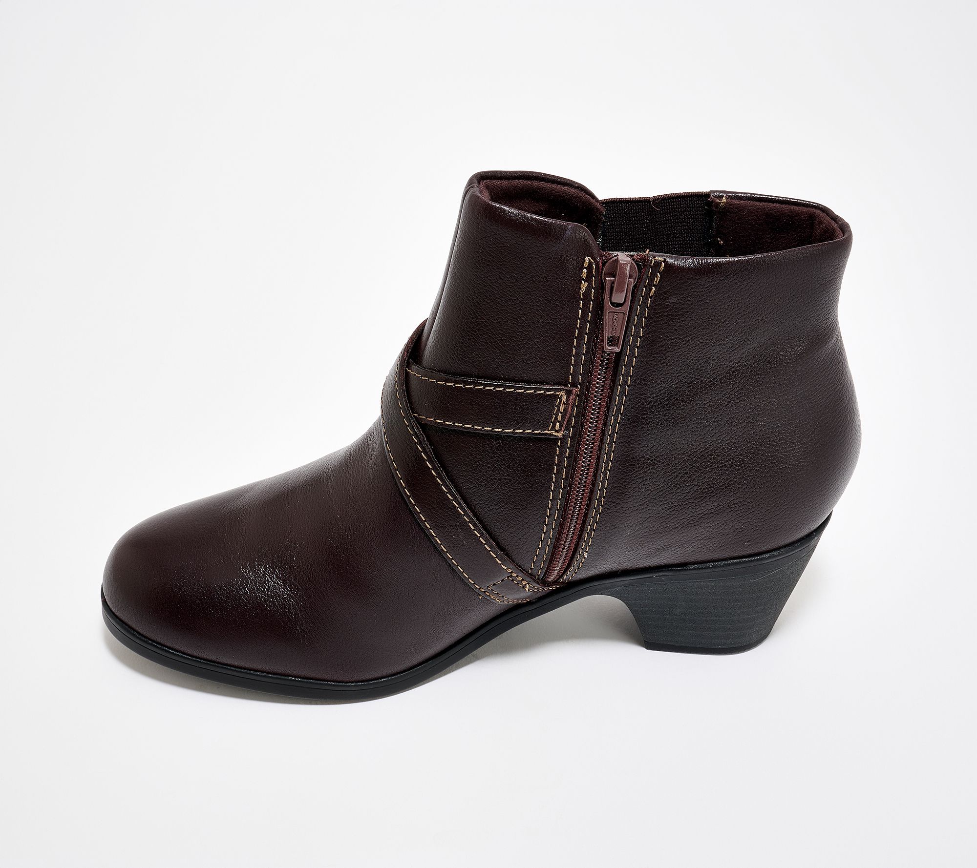 Whether you're heading downtown or catching up with friends at brunch, these stylish leather ankle booties deliver a refined touch with their decorative straps and gleaming hardware. Soft foam cushioning keeps every step comfortable, while a practical block heel lends tailored polish for any occasion. From Clarks Footwear.