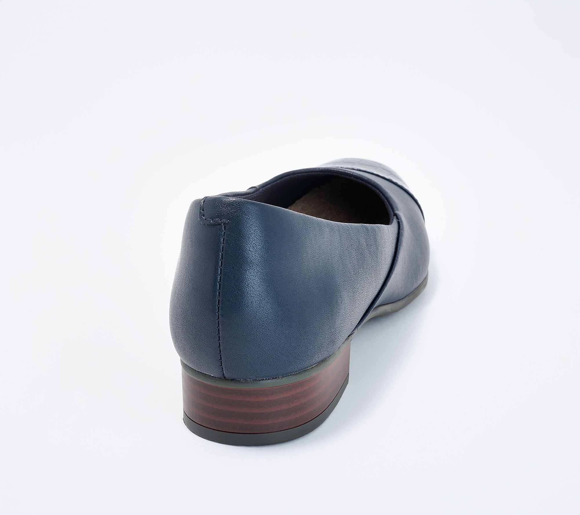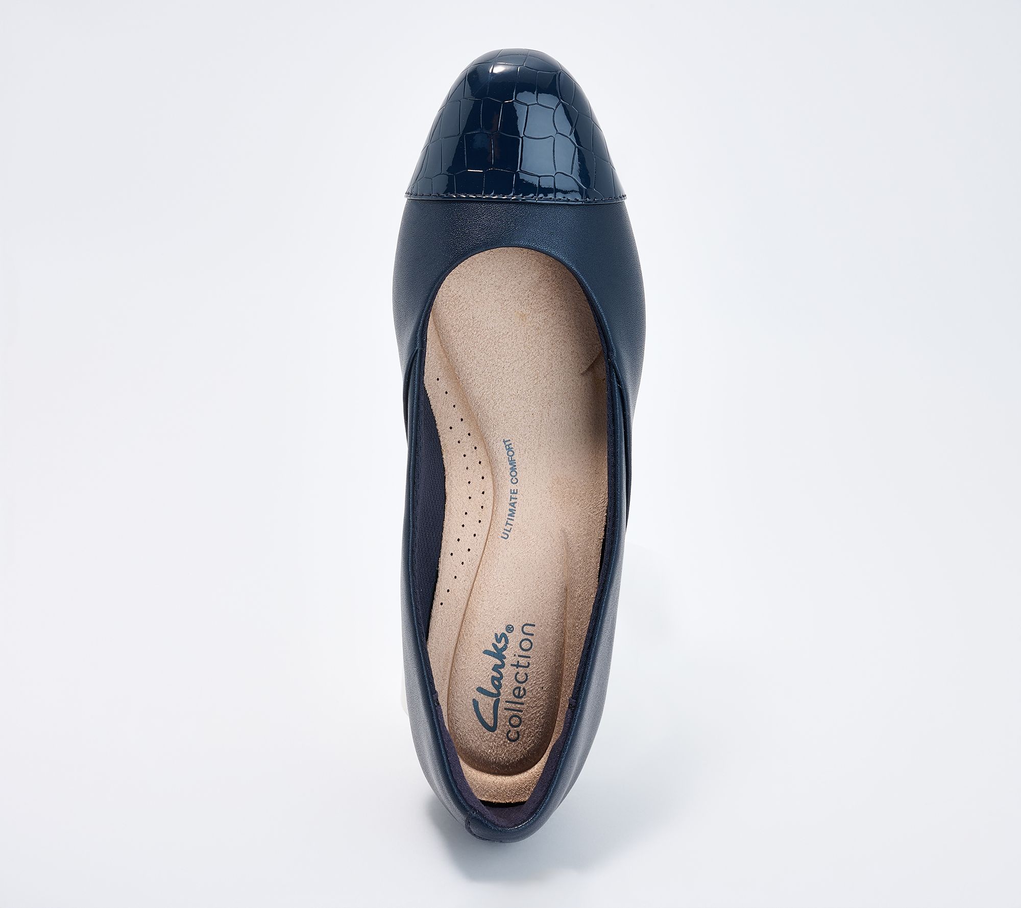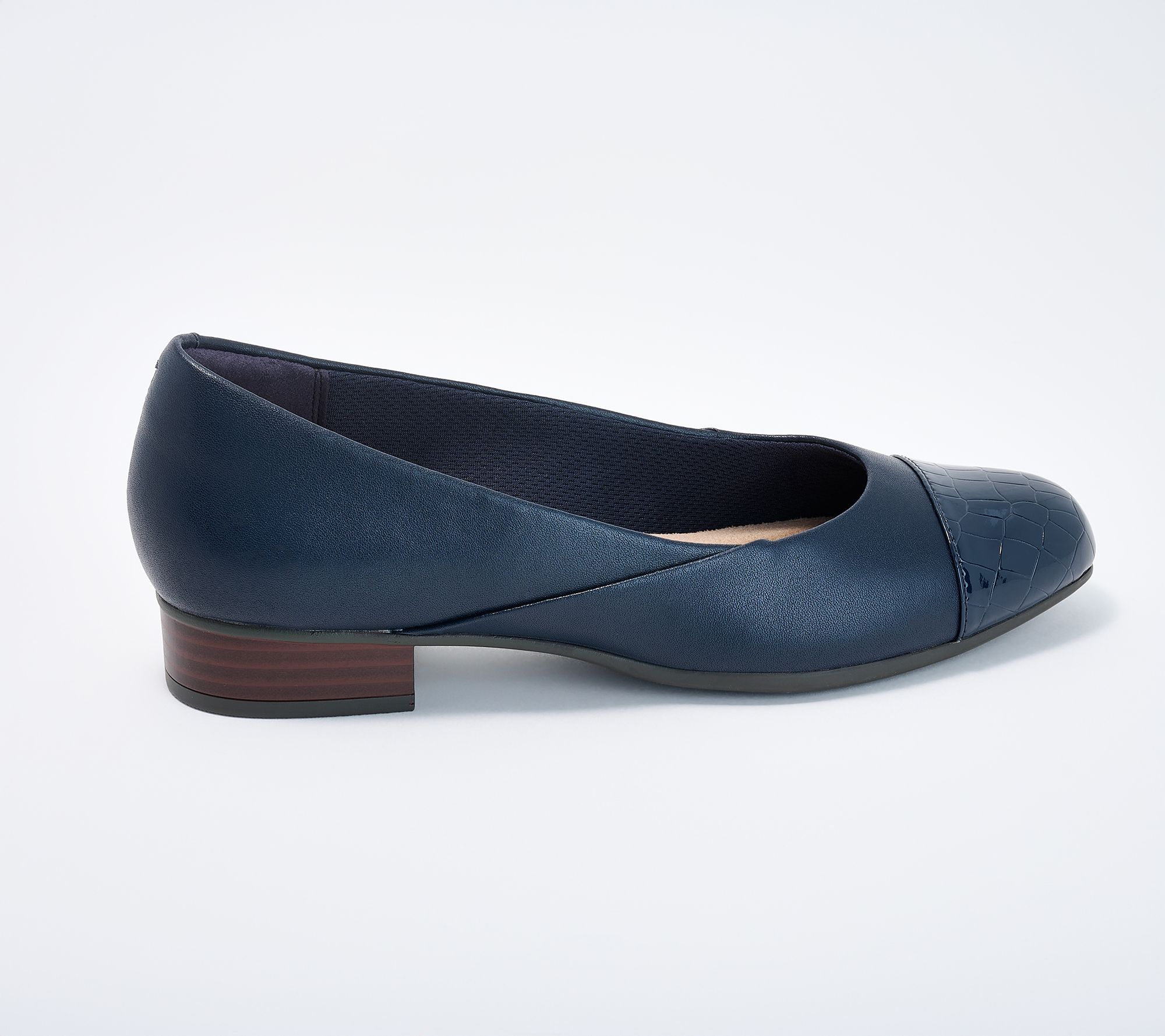 Whether your poised for a professional look or dressing for everyday elegance, these leather flats make a fabulous foundation. Thanks to comfortable cushioning, a sturdy low block heel, and an eye-catching toe cap, the Juliet Rise shoe is sure to make an impression while providing a plush place to put your feet. From Clarks Footwear.