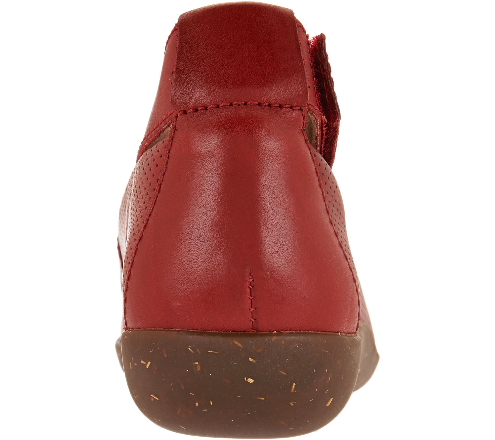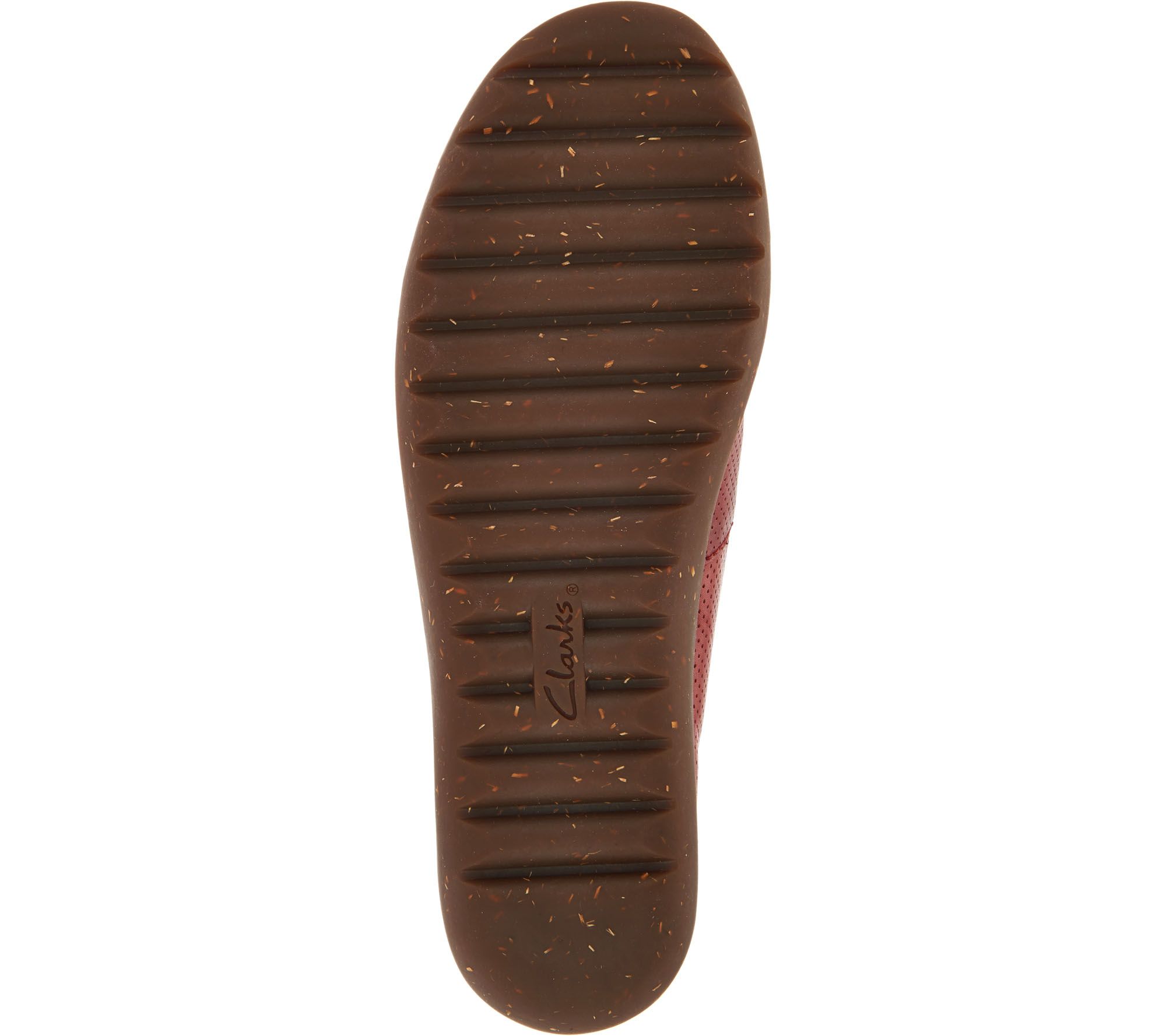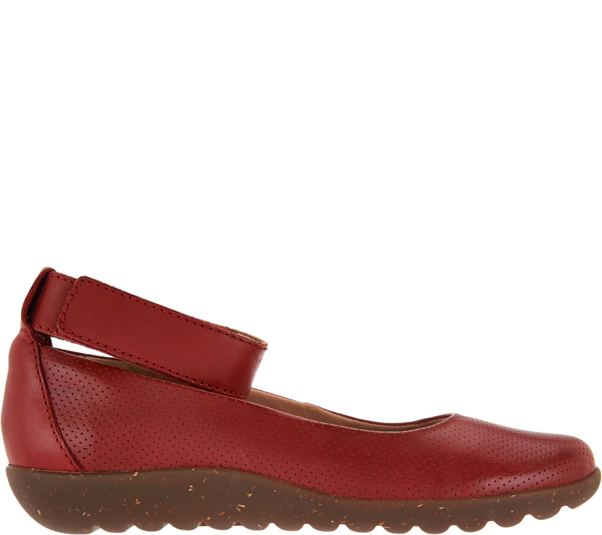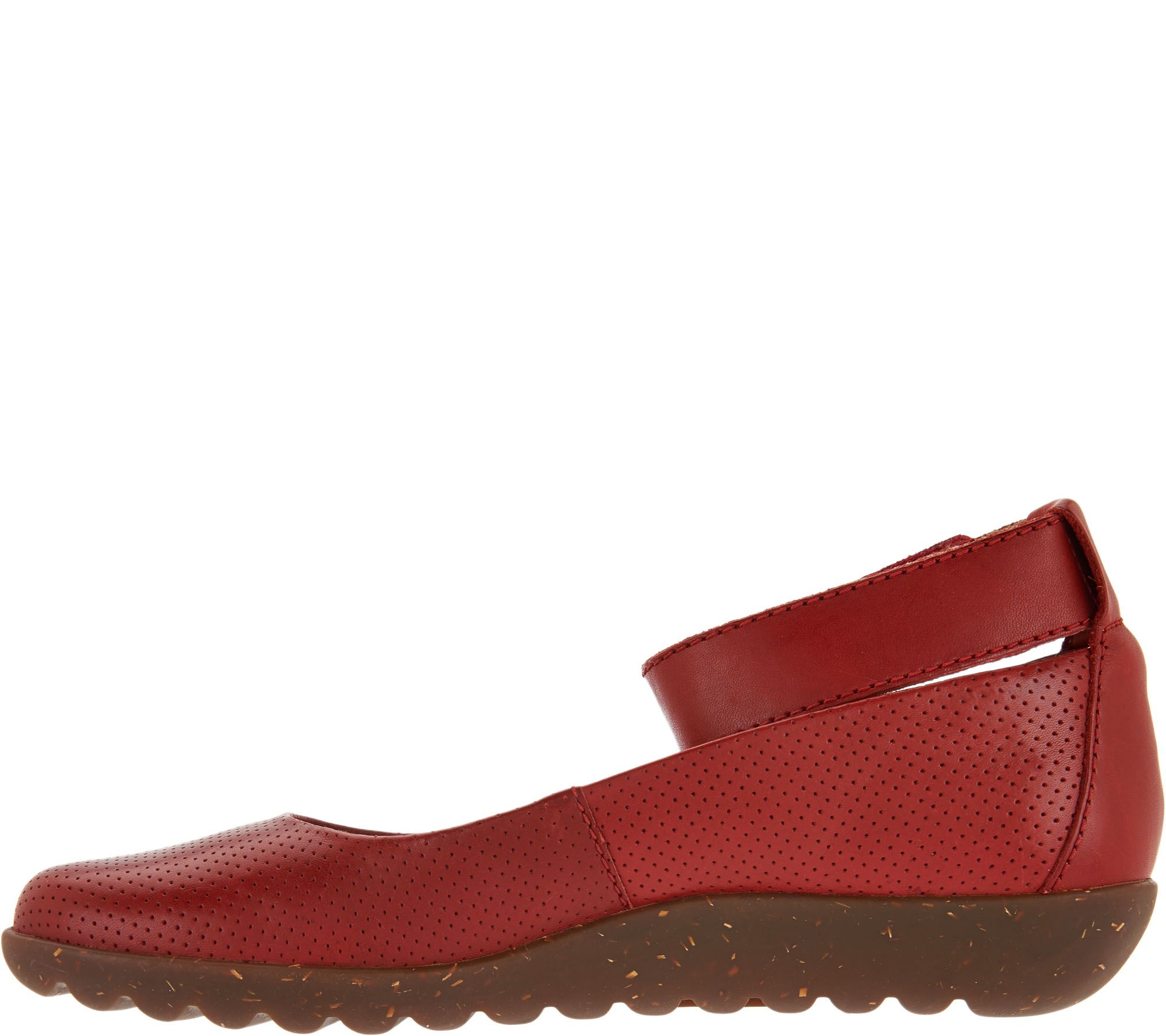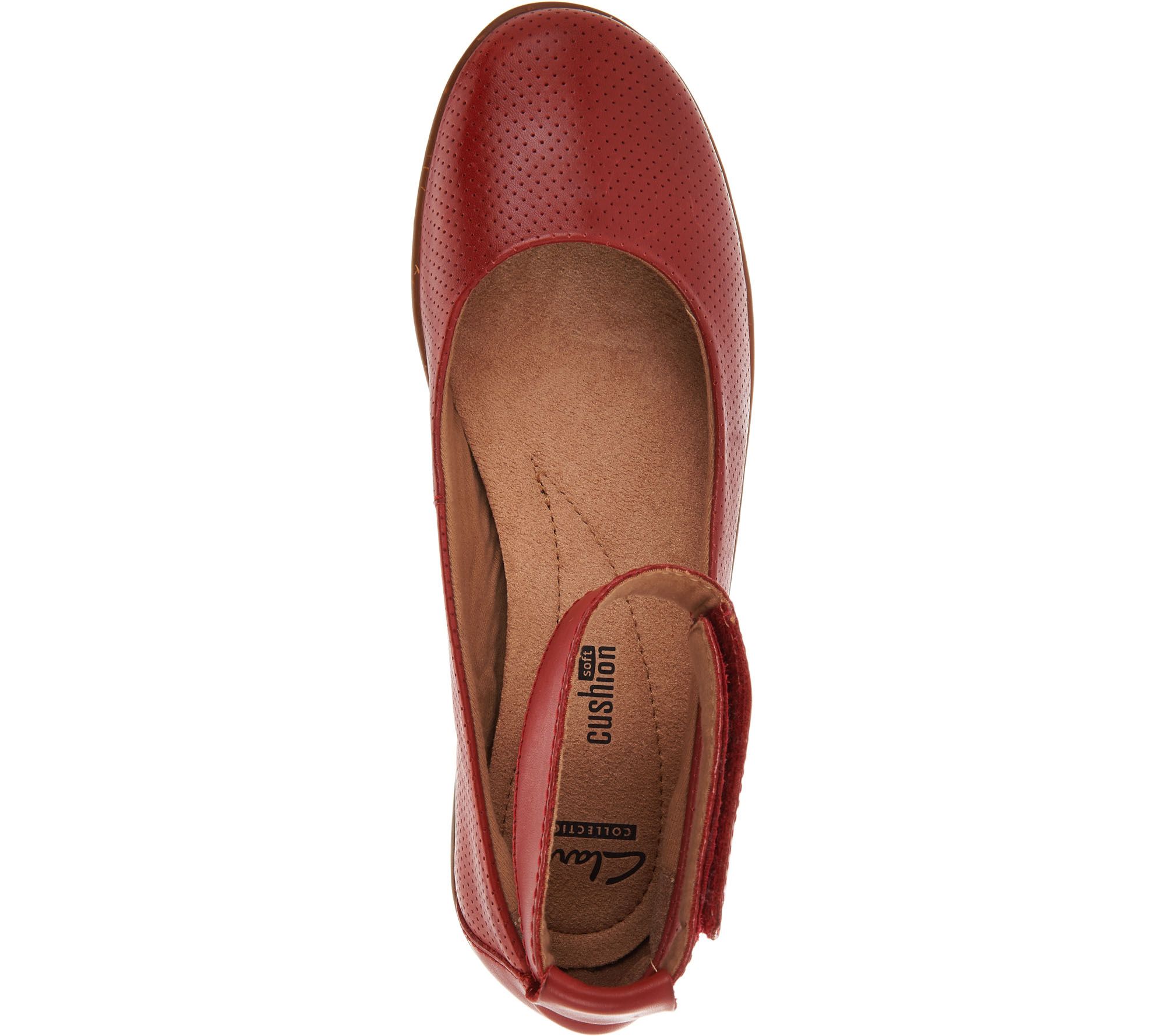 You wont' fall flat in stylish footwear with these perforated leather flats from Clarks. This classic design takes on a fresh update with a perforated leather upper and quick-close hook-and-loop ankle strap. Great worn with cropped pants or a cute skirt, this shoe will flat-ter any outfit. From Clarks Footwear.