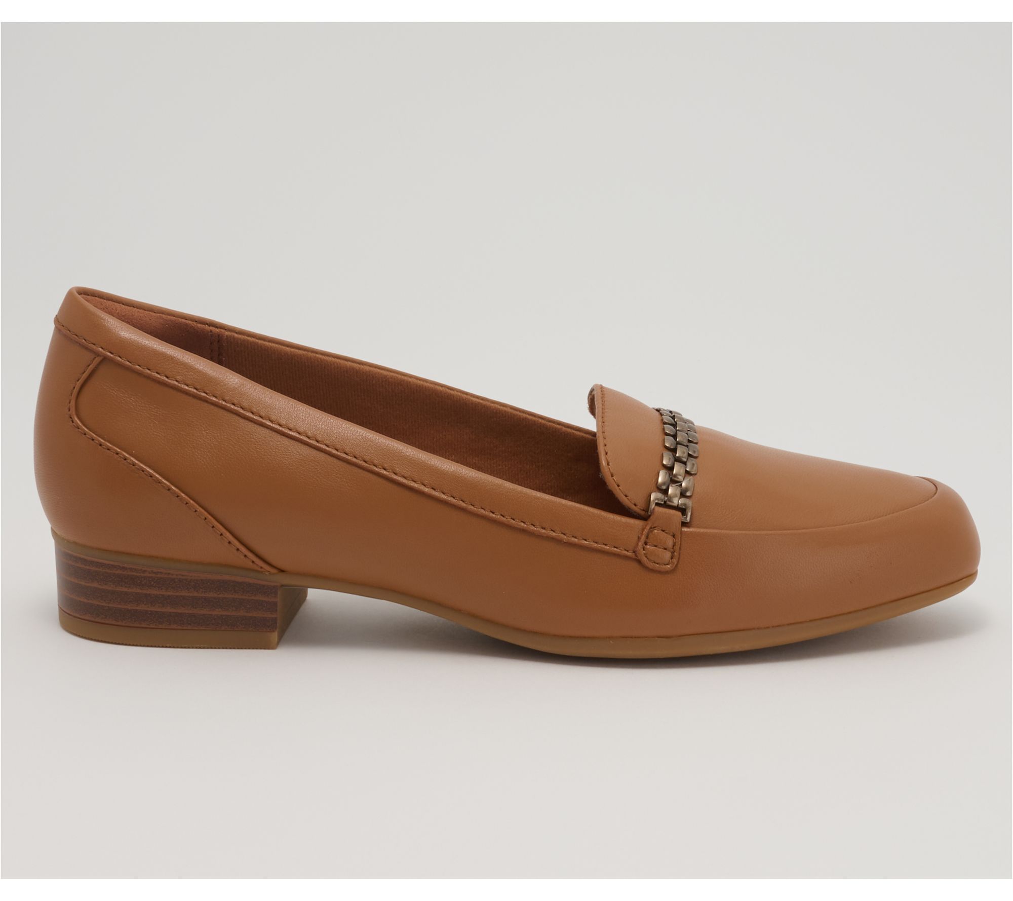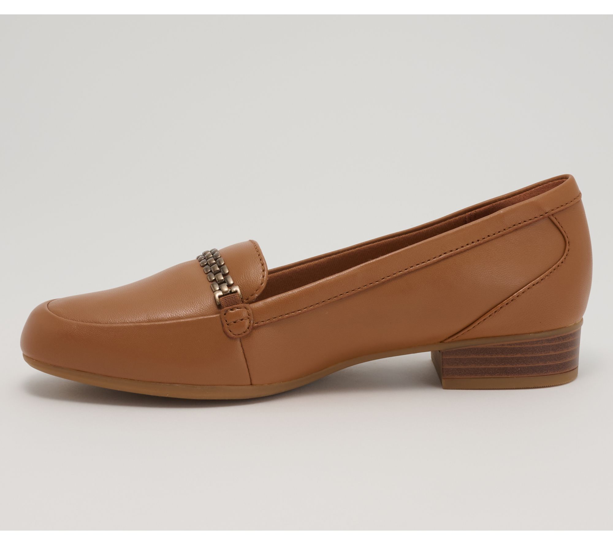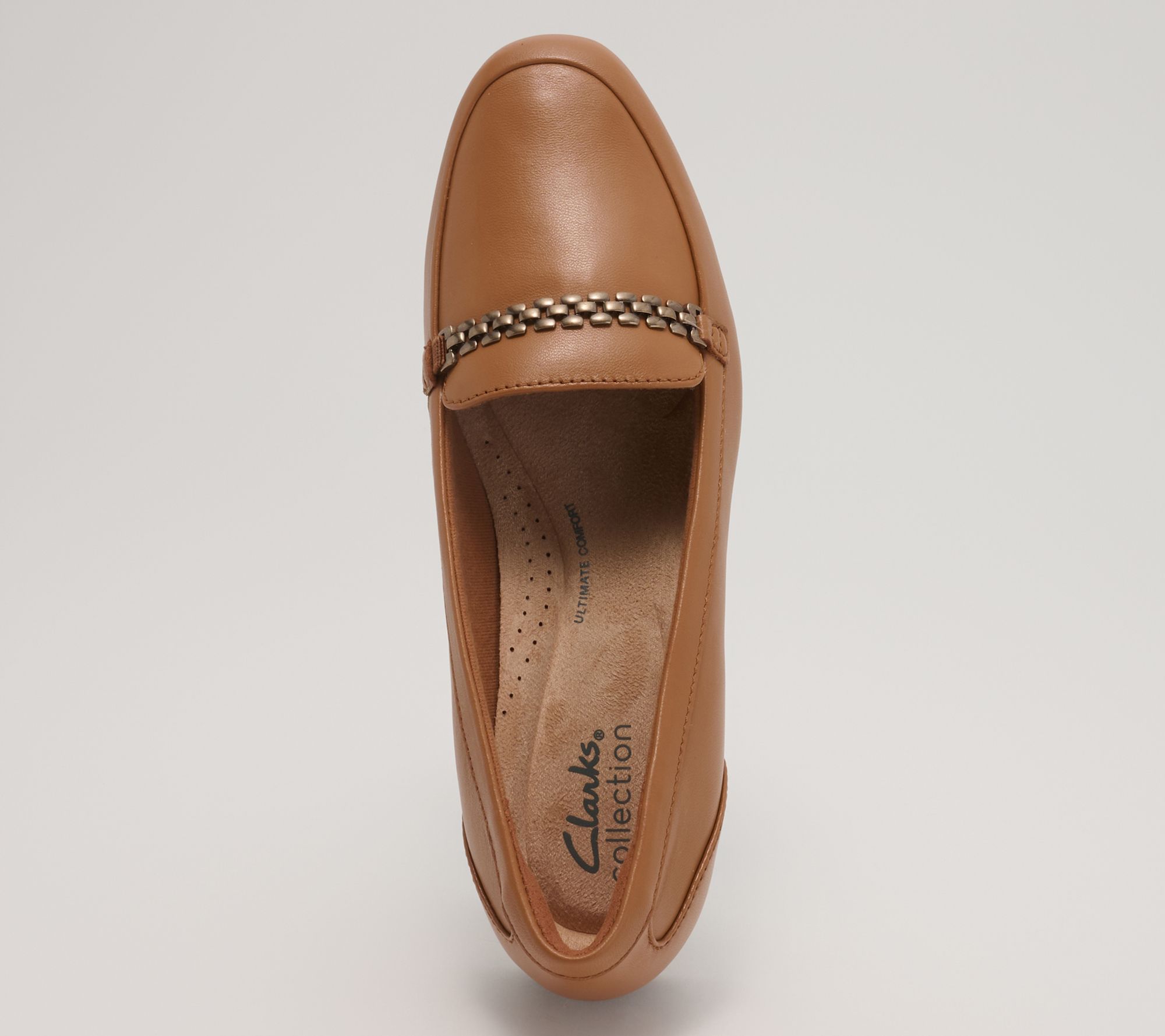 Start your morning with these classic Clarks Collection leather loafers, featuring a sleek silhouette and subtle metal chain detail that pairs effortlessly with work attire or casual denim. The plush foam footbed surrounds your feet in comfort, while a soft jersey lining and durable rubber sole help keep you light on your feet all day long. From Clarks Footwear.